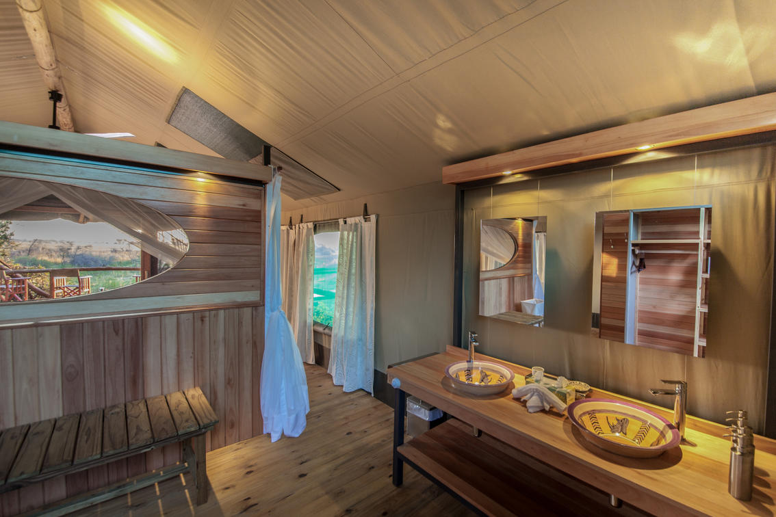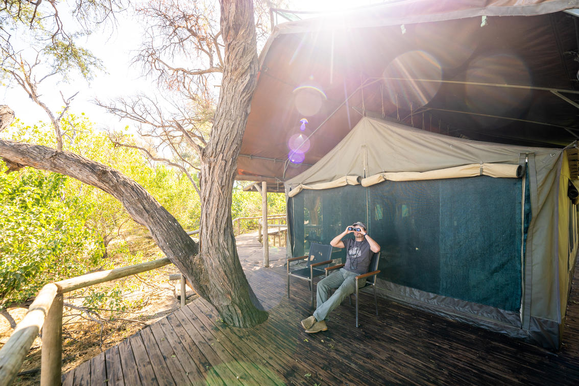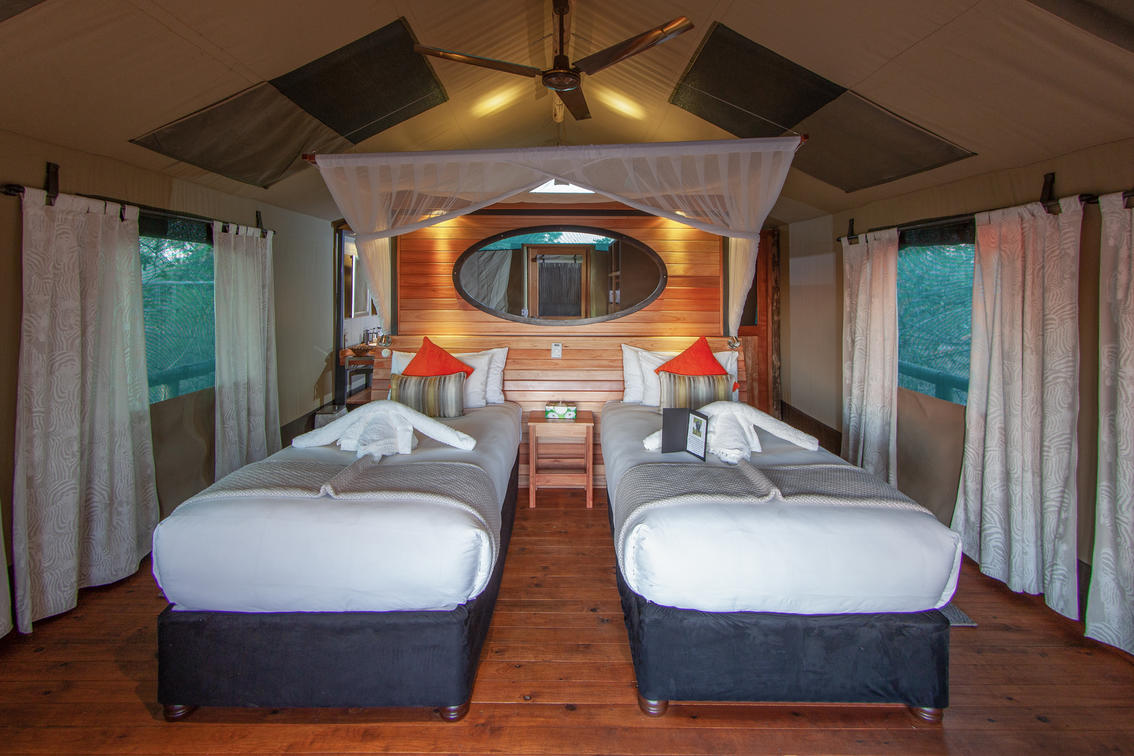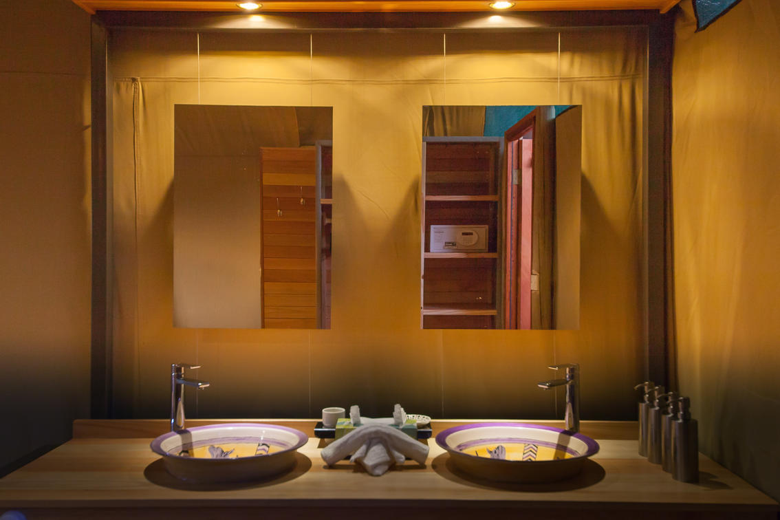 Extra length 3 quarter twin or extra length super king-sized double beds, ceiling fans, mosquito nets, wardrobe space, digital safe, cozy lounge area, spare blankets, and bug / insect repellents are provided. All rooms are elevated on wooden platforms with a private viewing deck overlooking the Gomoti River channels.