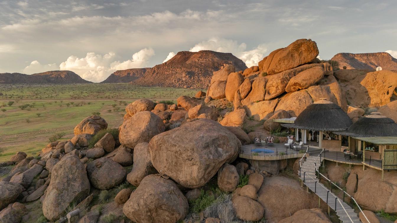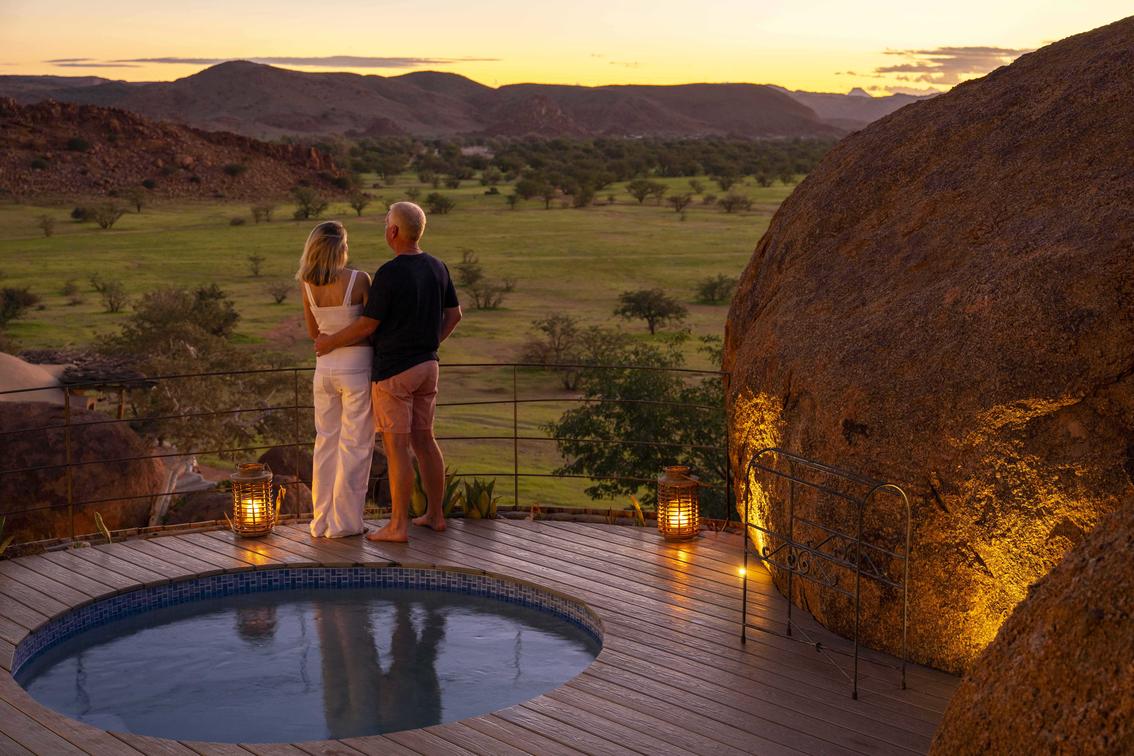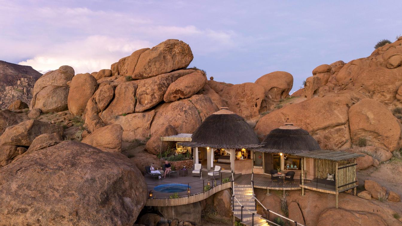 The Luxury Suites sit atop of the rocky outcrop and feature a large lounge with separate air-conditioned bedroom, and en-suite bathroom before spilling out on to a large deck with spectacular, uninterrupted views across the Damaraland landscape. Equipped with Wi-Fi, a stocked minibar, heated splash pool and private salas to soak up the vistas.