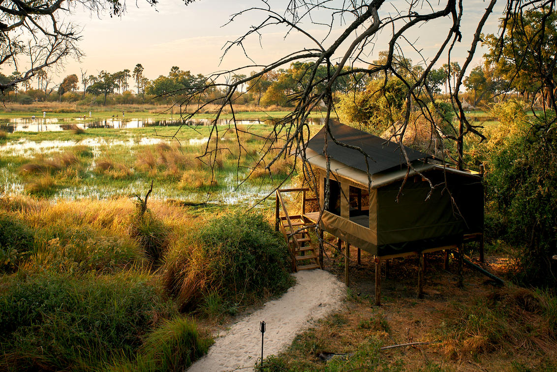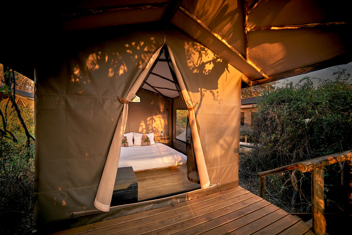 Accommodation is in simple, comfortable canvas 3m x 3m rooms set on elevated wooden decks, each with a view of the surrounding bush, and shaded by canvas shelters. Each tent has its own rustic en-suite facilities including hot and cold running water for the al fresco bucket shower – in true safari style.