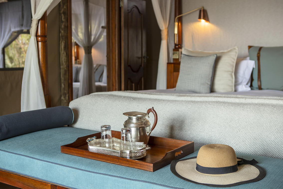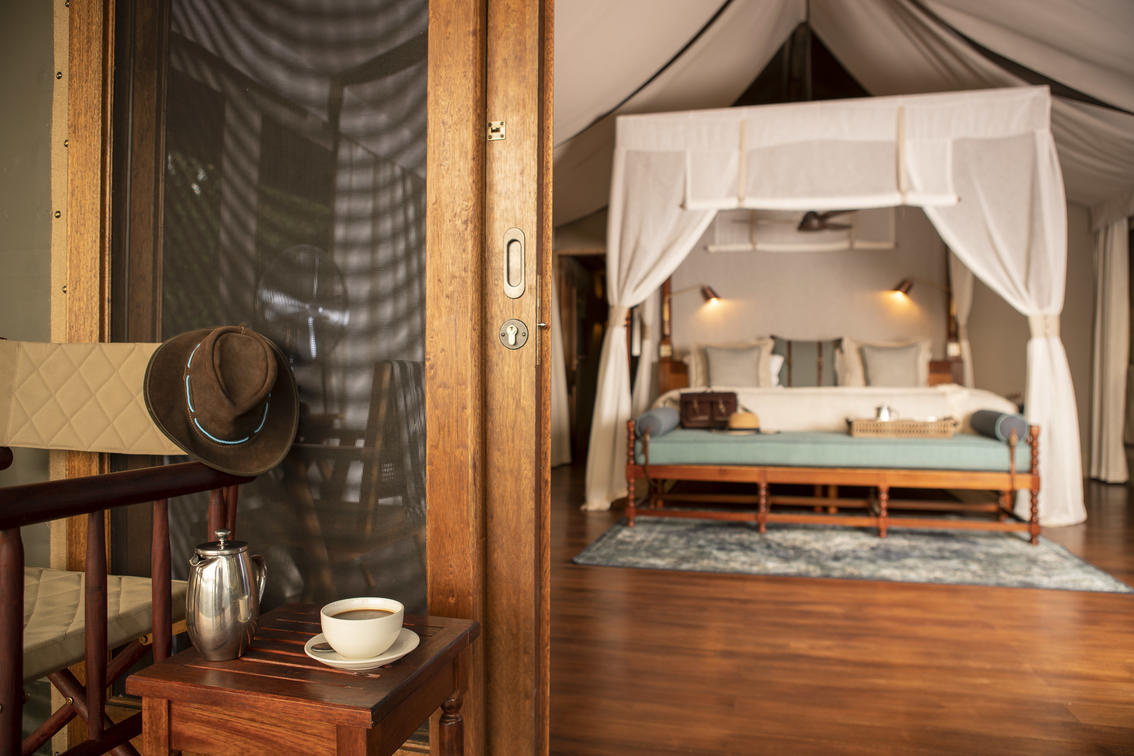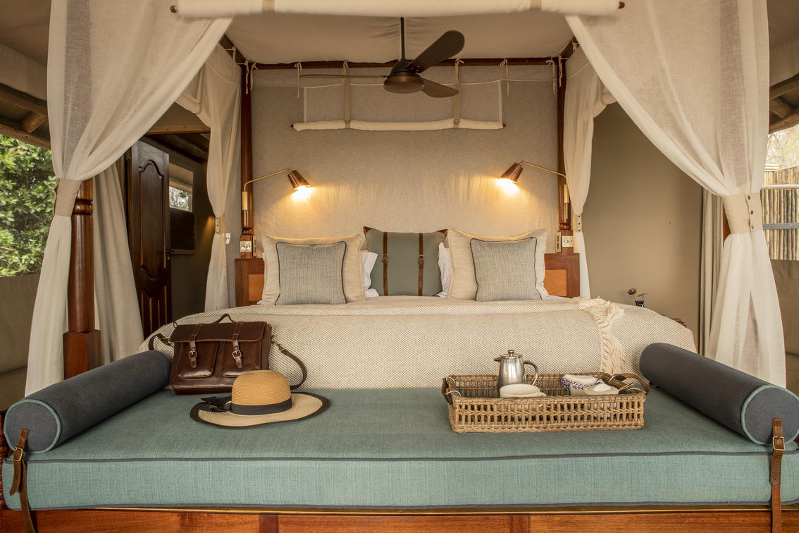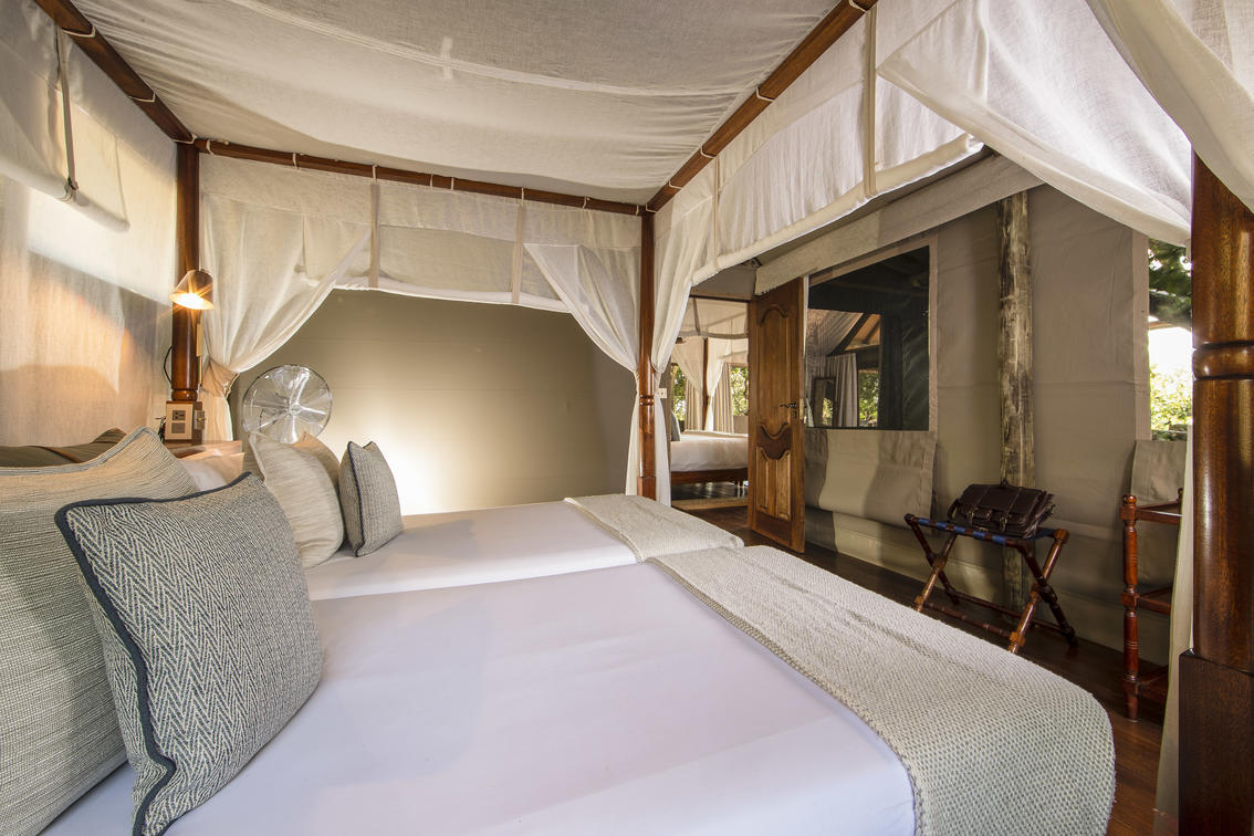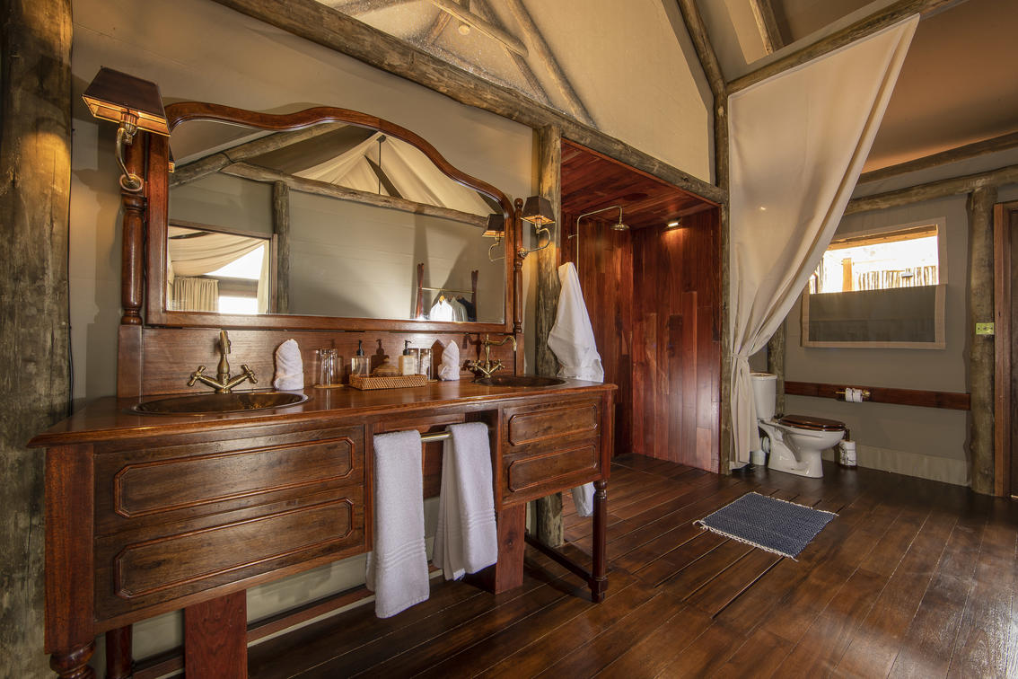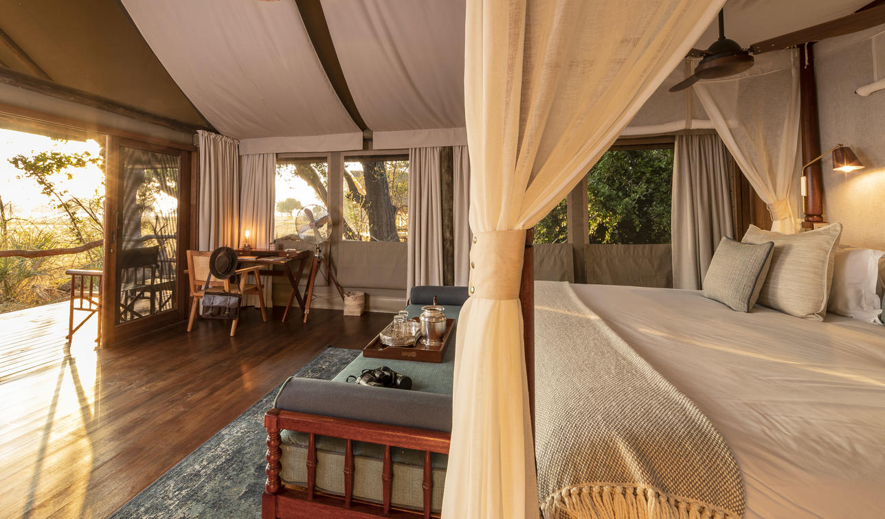 Guests are accommodated in a spacious, safari tent consisting of two bedrooms, shared en-suite bathroom with indoor and outdoor shower, hot and cold running water and flush toilet. The tents are well spaced, affording privacy whilst remaining within comfortable distance from the main camp area. Roomy enough to sleep a maximum of 5 people. Shinde takes children from the age of 7 years old.