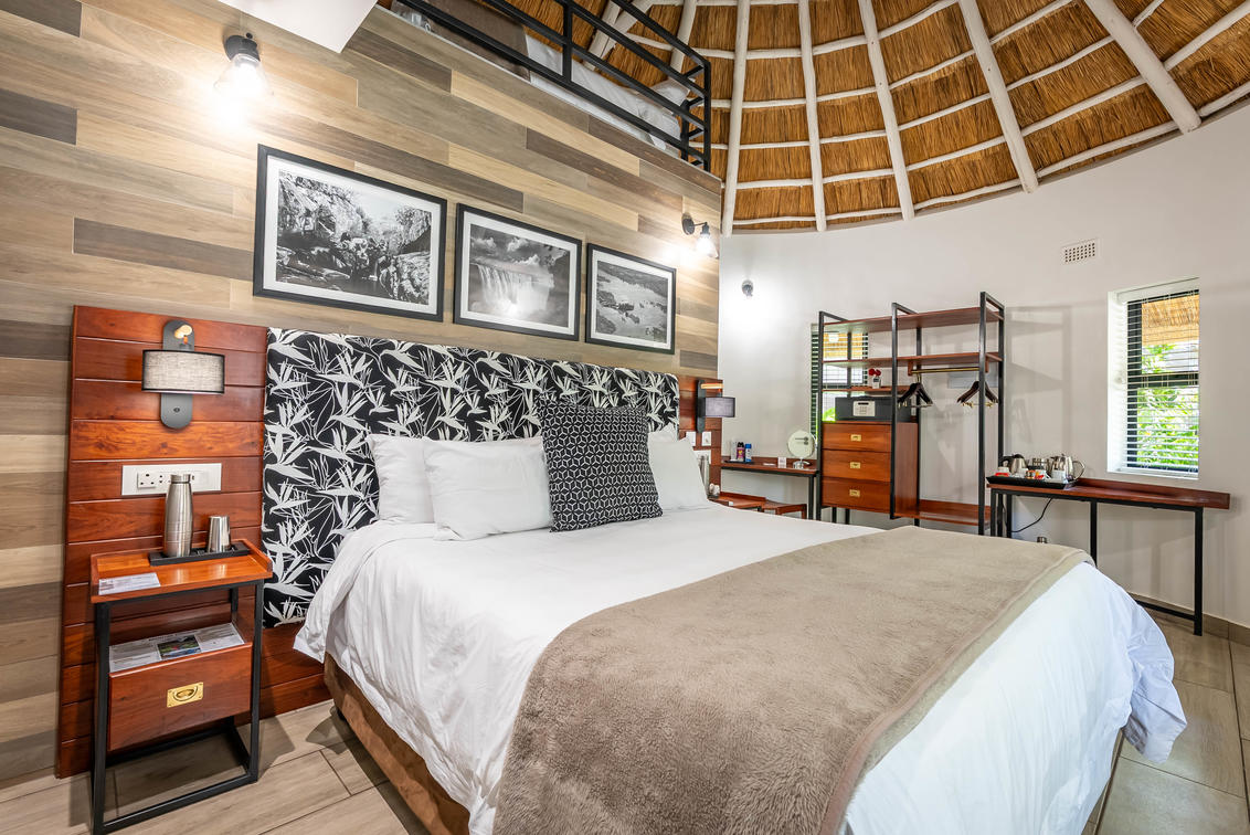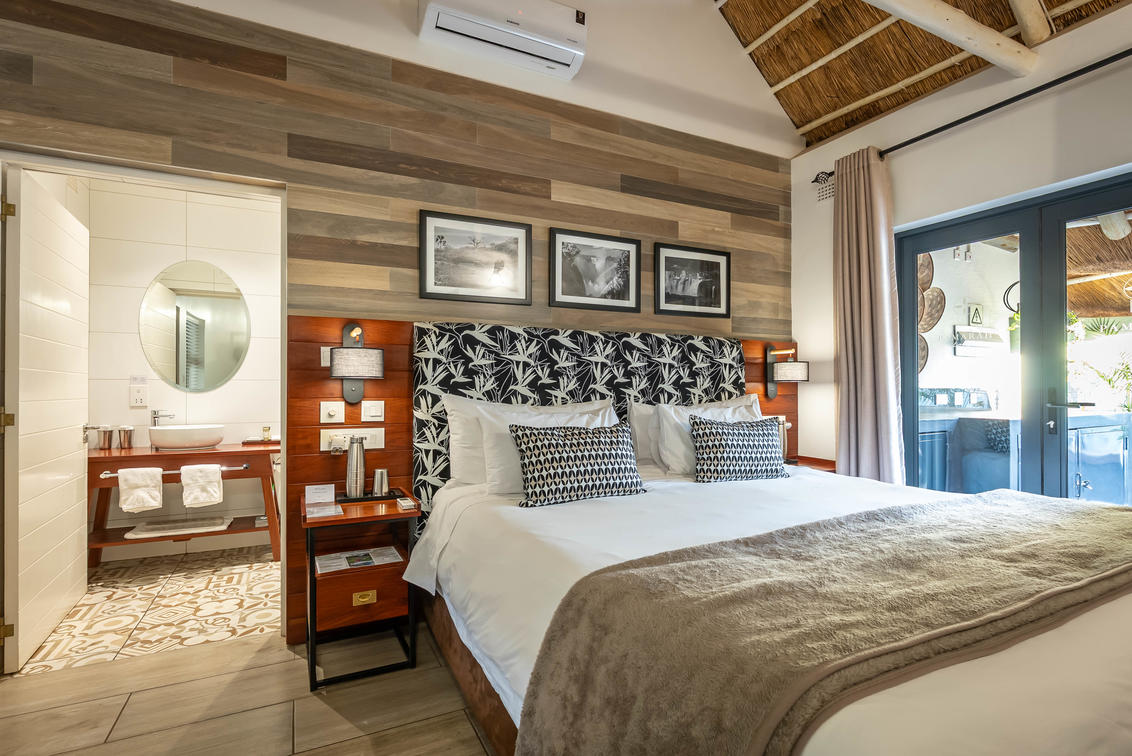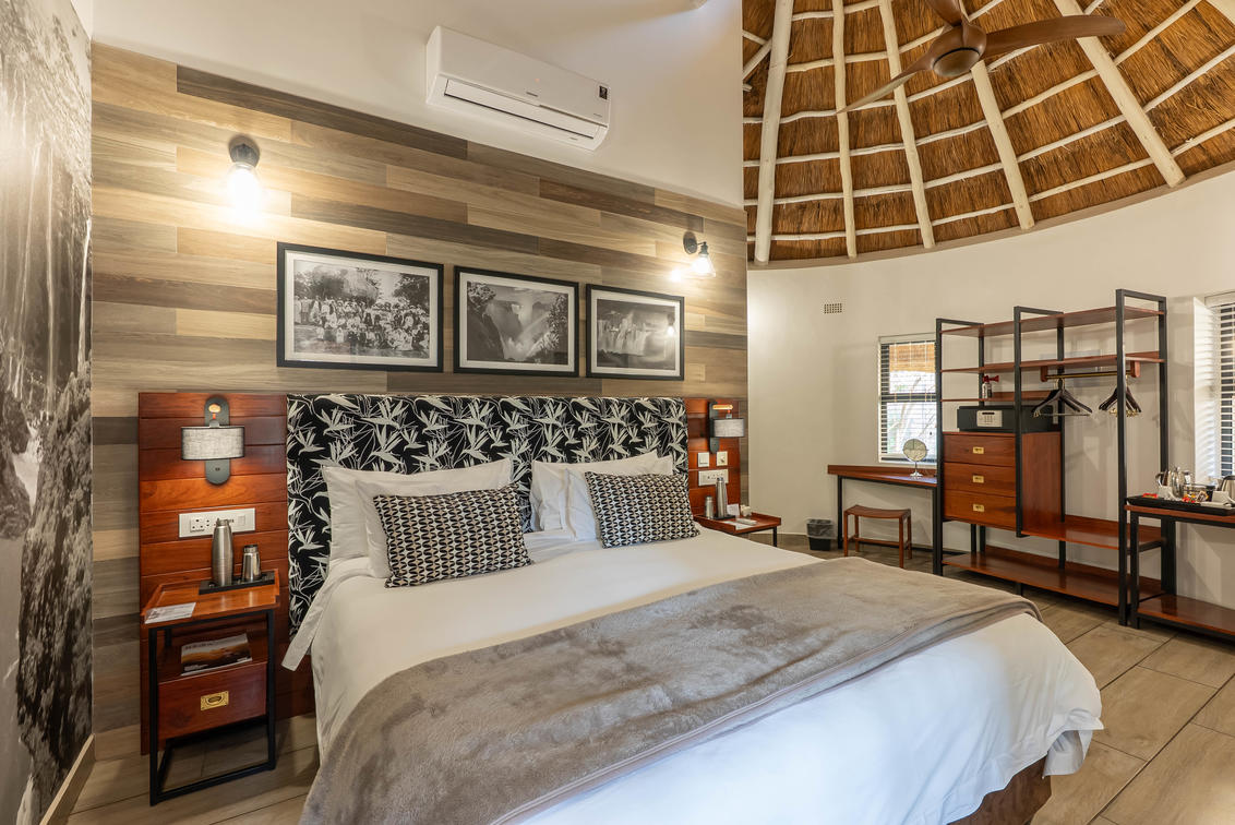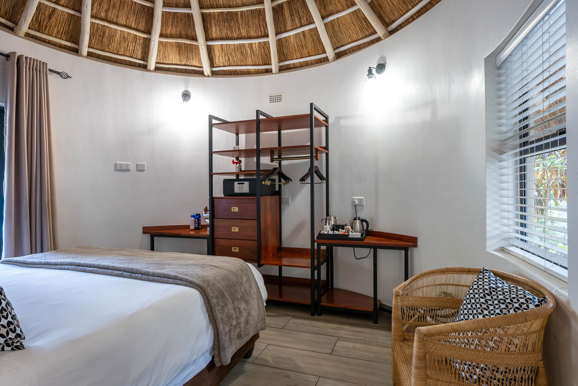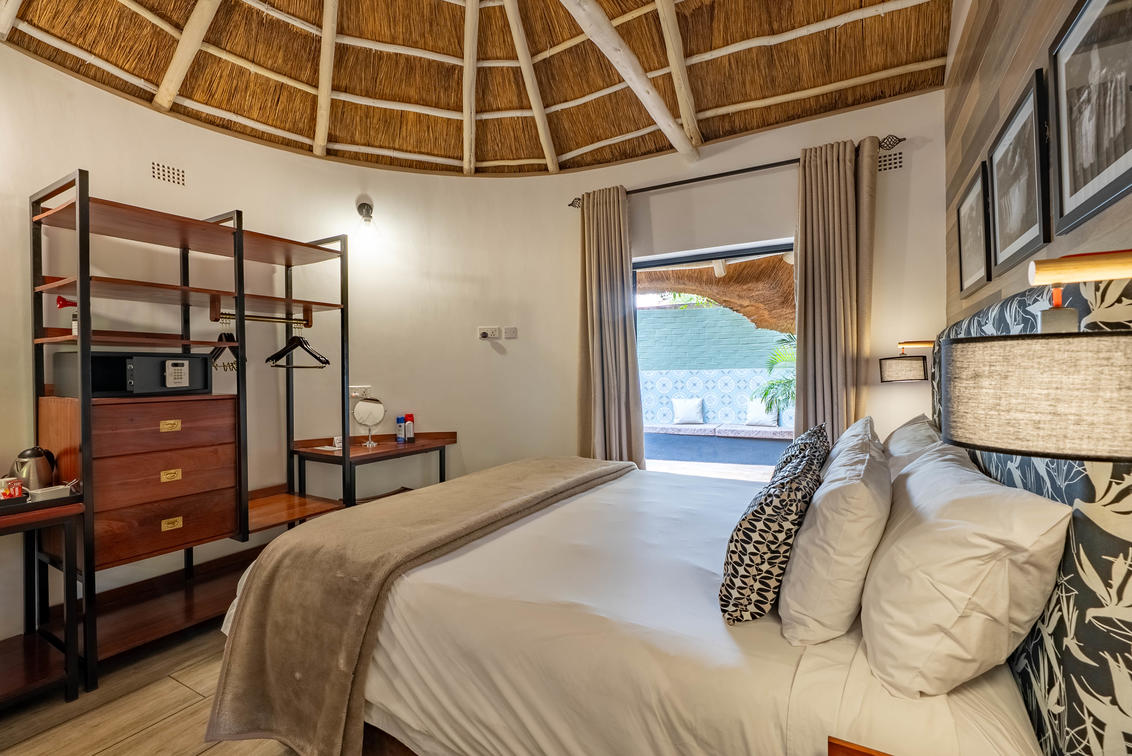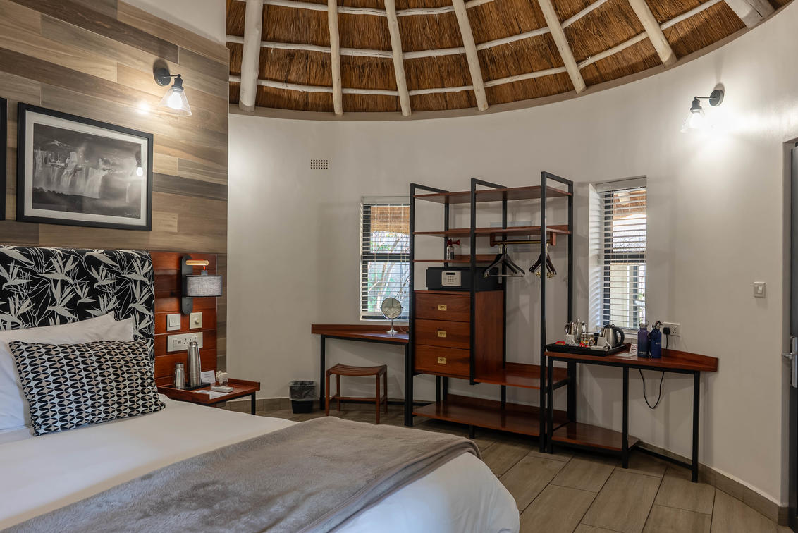 Introducing our popular king patio room, a delightfully cozy and compact room under a traditional thatch roof with a private patio space leading off the bedroom. The patio is the perfect spot to catch the first rays of sunlight and enjoy an early morning coffee or stargaze with an evening nightcap in the privacy of your own space. A generous seating area and countertop with plug points offers a practical space for you to enjoy your down time after a busy day of adventuring in Victoria Falls. The main room may be smaller than some of our other bigger rooms, but we know you will love the private outdoor space!