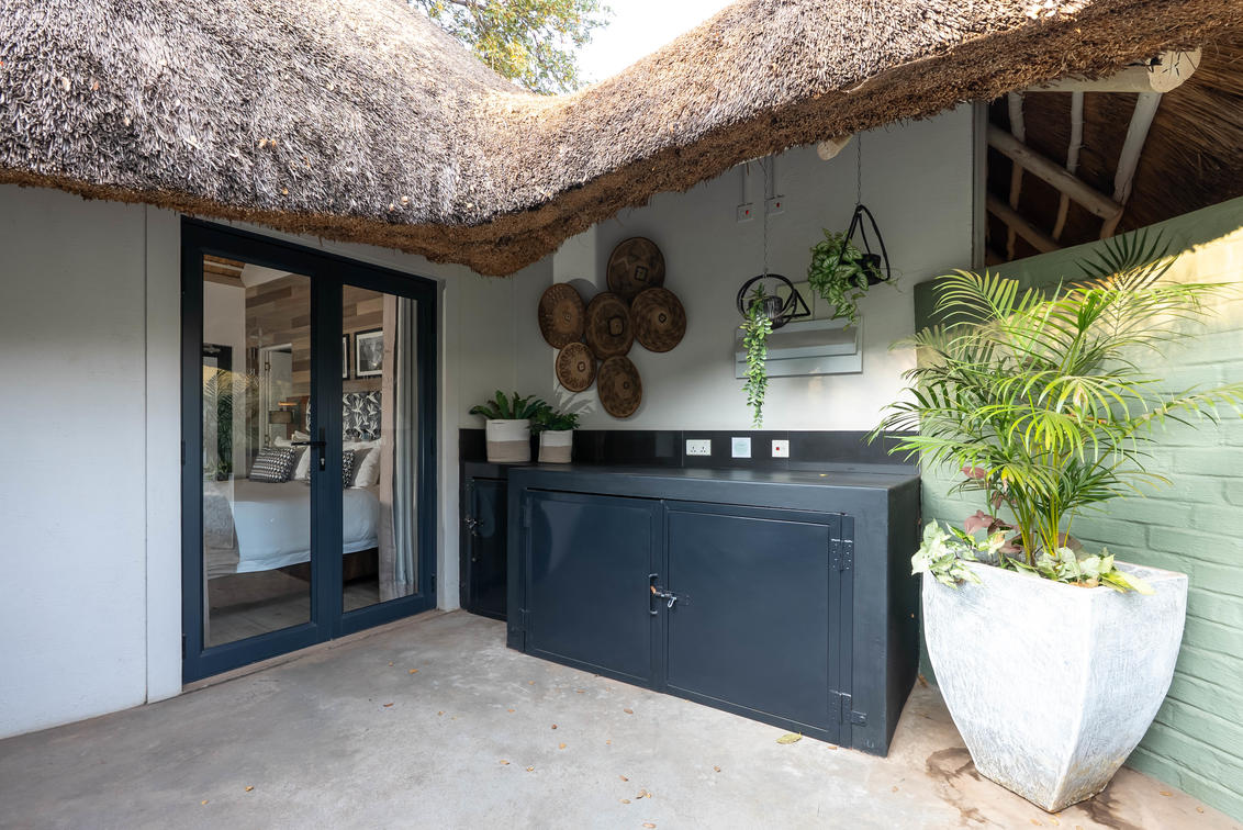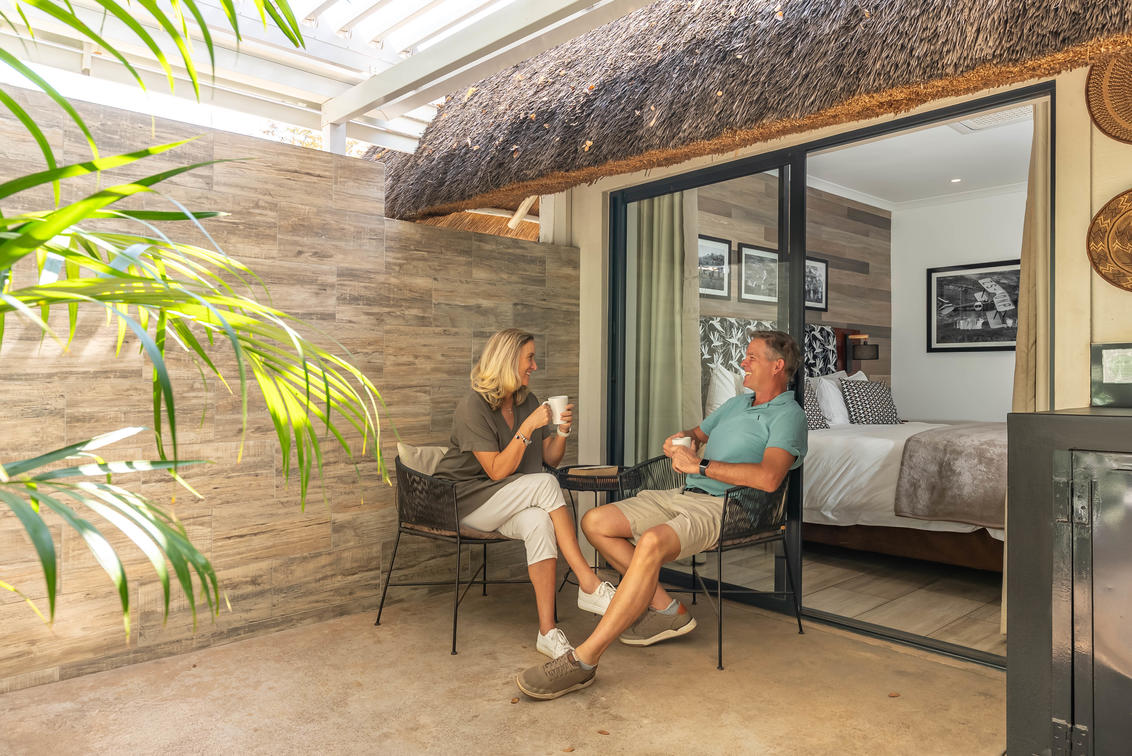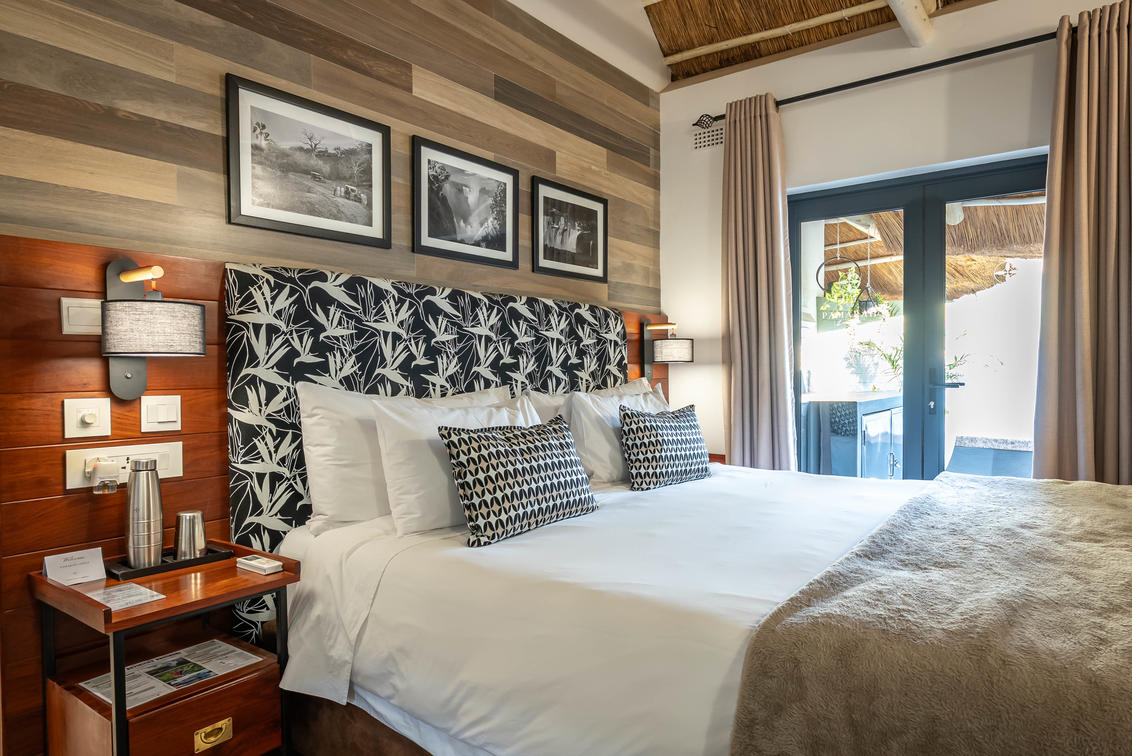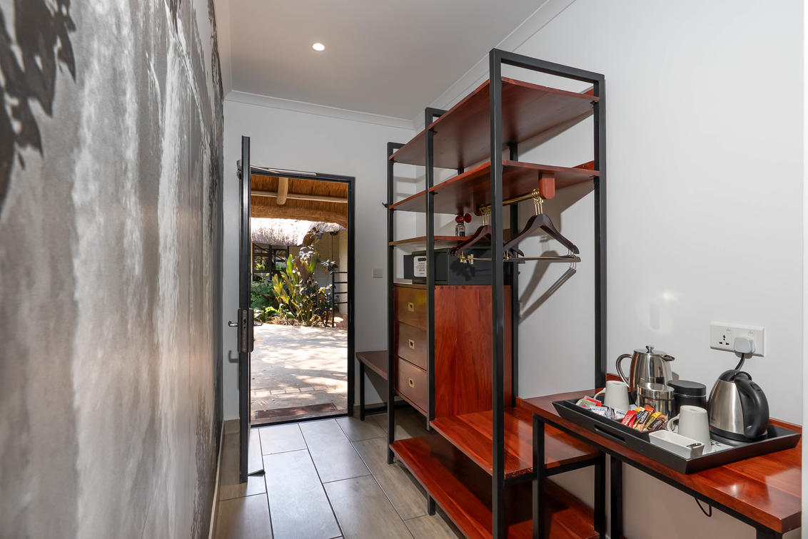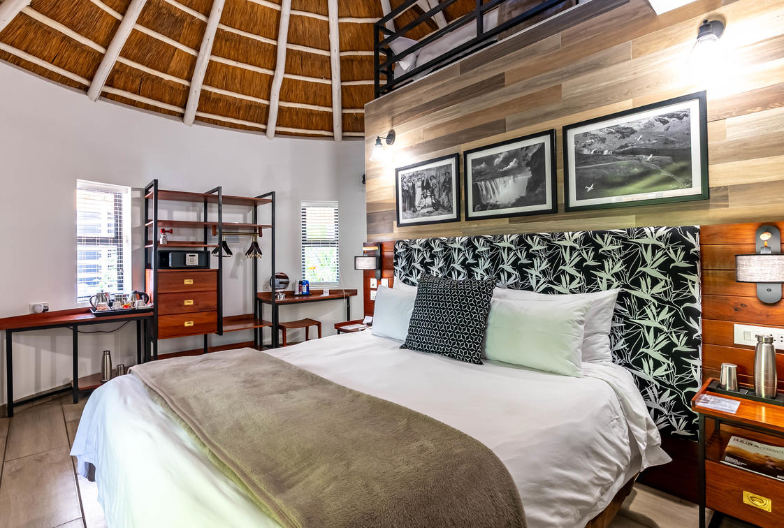 Introducing our popular king patio room, a delightfully cozy and compact room under a traditional thatch roof with a private patio space leading off the bedroom. The patio is the perfect spot to catch the first rays of sunlight and enjoy an early morning coffee or stargaze with an evening nightcap in the privacy of your own space. A generous seating area and countertop with plug points offers a practical space for you to enjoy your down time after a busy day of adventuring in Victoria Falls. The main room may be smaller than some of our other bigger rooms, but we know you will love the private outdoor space!