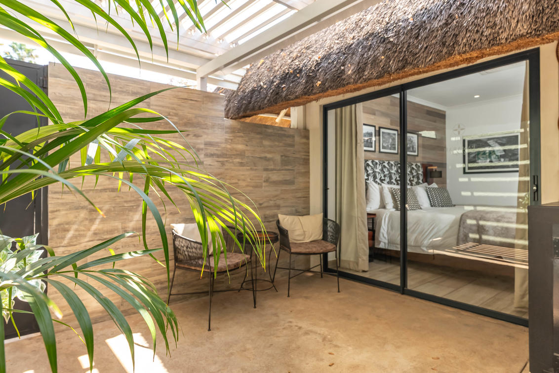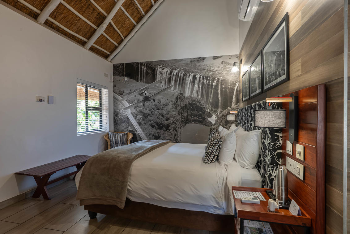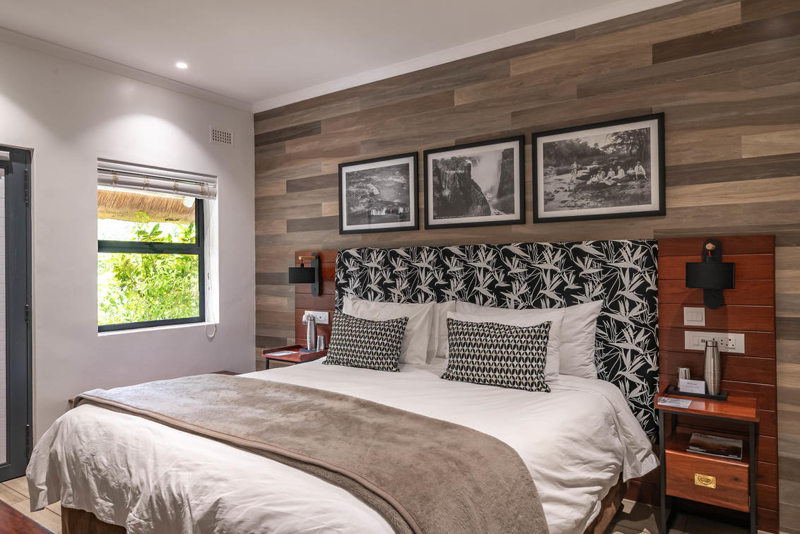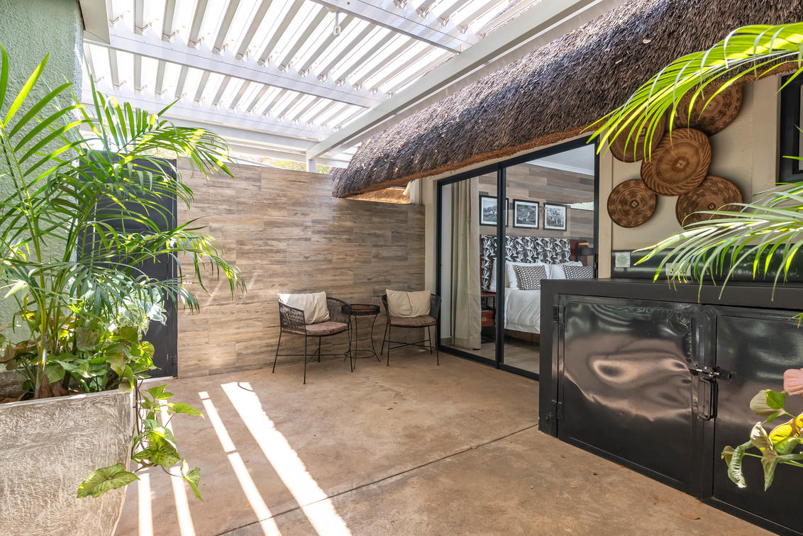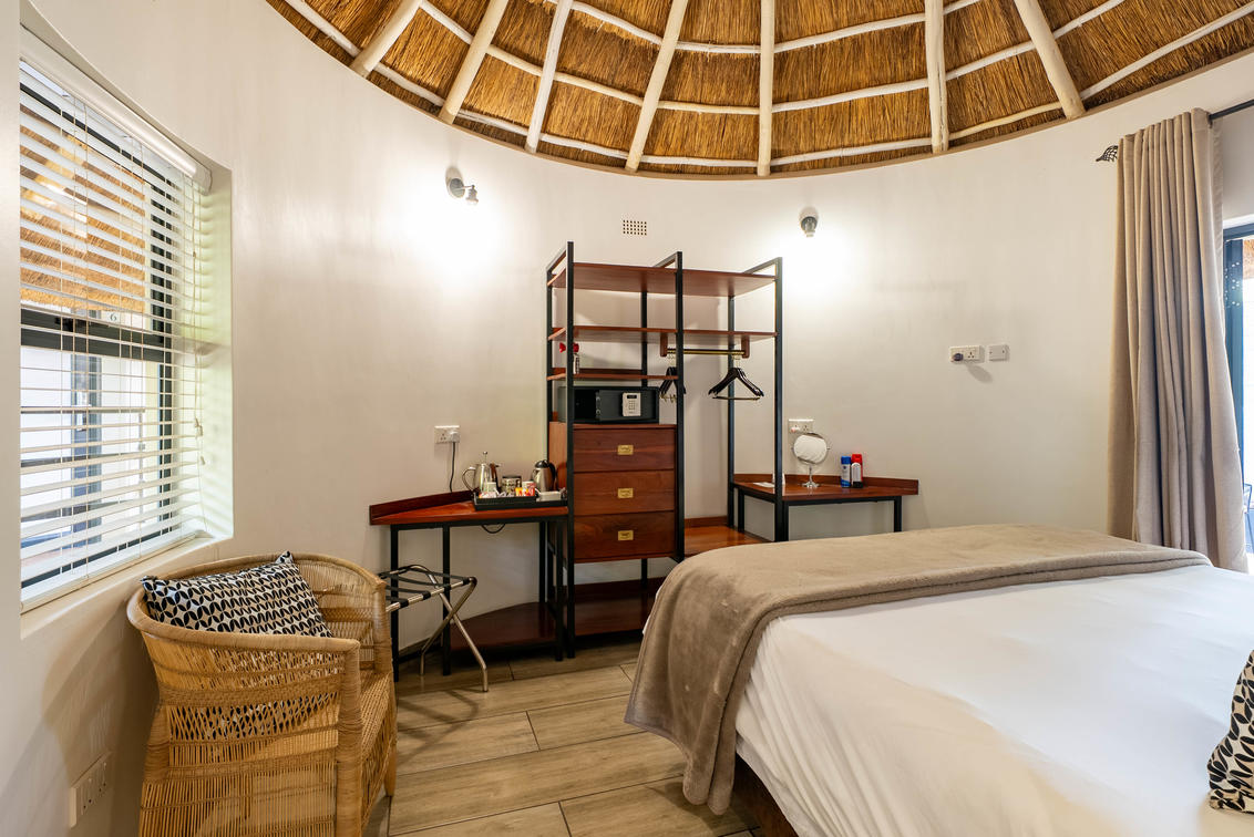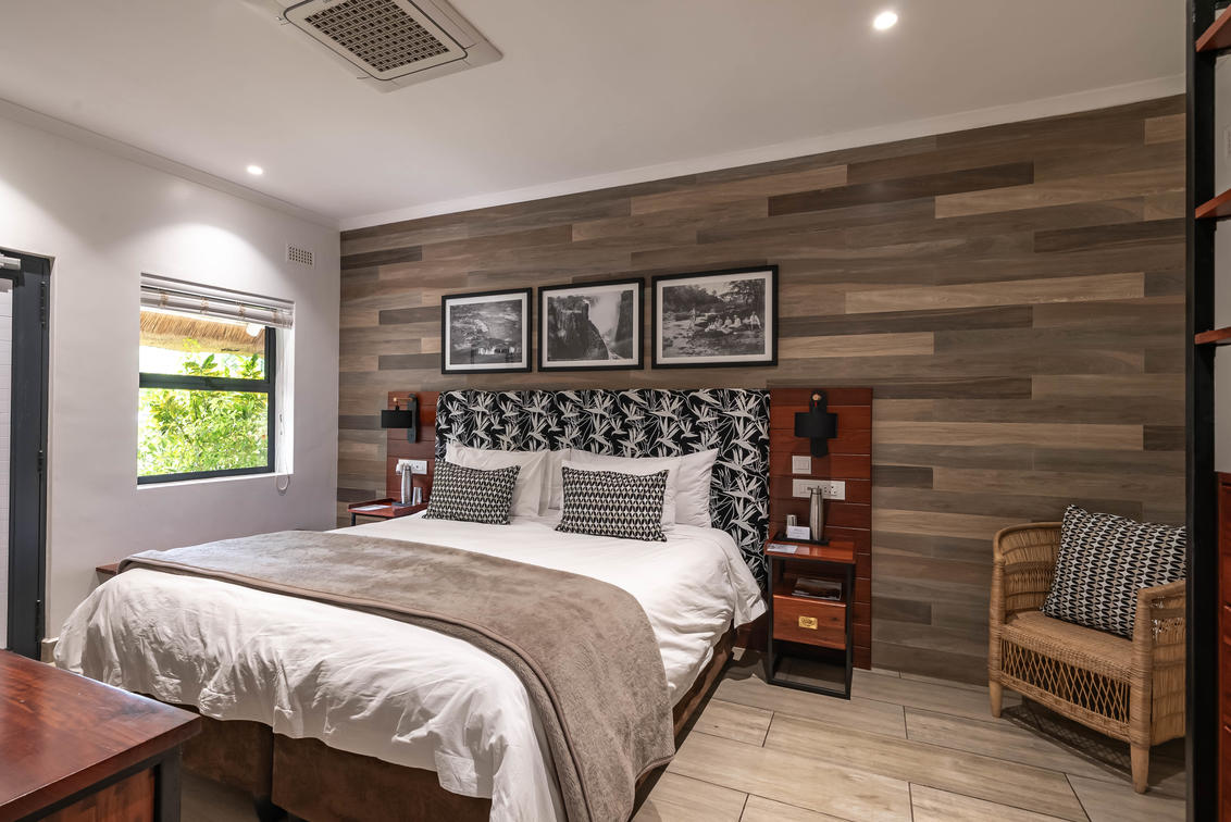 Introducing our popular king patio room, a delightfully cozy and compact room under a traditional thatch roof with a private patio space leading off the bedroom. The patio is the perfect spot to catch the first rays of sunlight and enjoy an early morning coffee or stargaze with an evening nightcap in the privacy of your own space. A generous seating area and countertop with plug points offers a practical space for you to enjoy your down time after a busy day of adventuring in Victoria Falls. The main room may be smaller than some of our other bigger rooms, but we know you will love the private outdoor space!