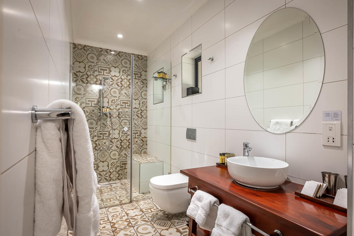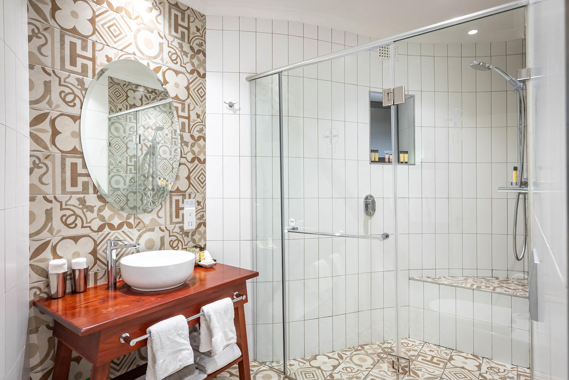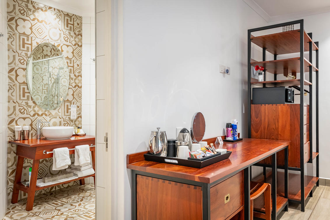 One of our favorites, this gorgeously appointed room is modern, spacious and light, with a classic vintage feel to it. Handcrafted teak furniture and brass fittings stand out against the clean-cut lines of carefully chosen tiles, creating a sense of old world to match the nostalgic room décor. All light switches and international plug sockets are within easy reach on your headboard. Luxury extra-length mattresses and crisp, white linen guarantee a serene night’s sleep. Choose your preferred bed configuration for a flexible sleeping arrangement. Mixing business with pleasure? The solid teak dresser can double up as a convenient workspace for your laptop.