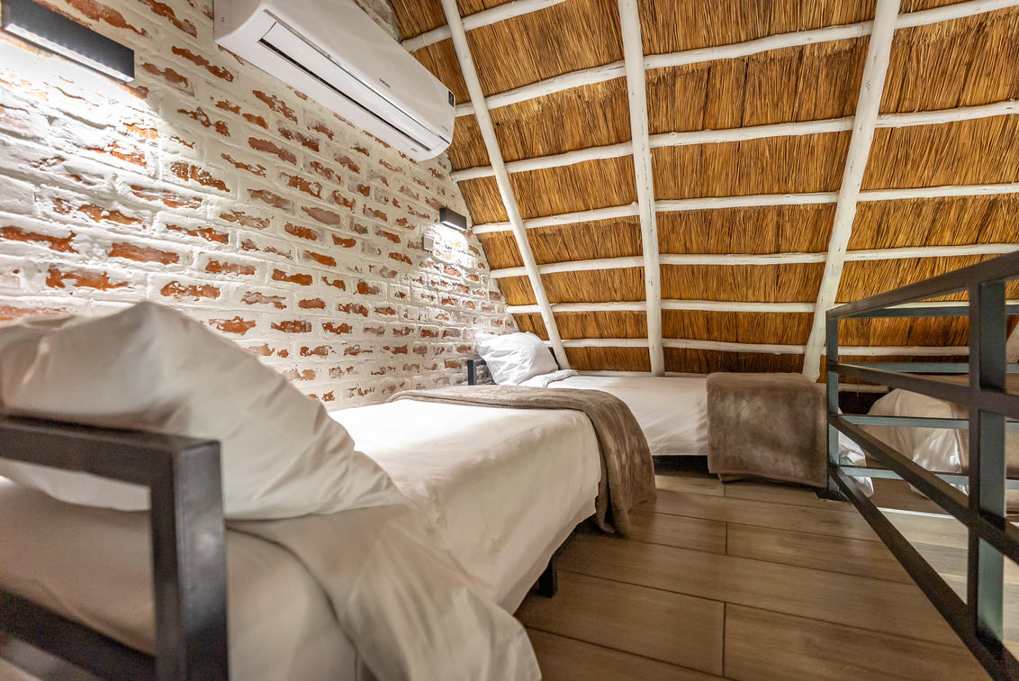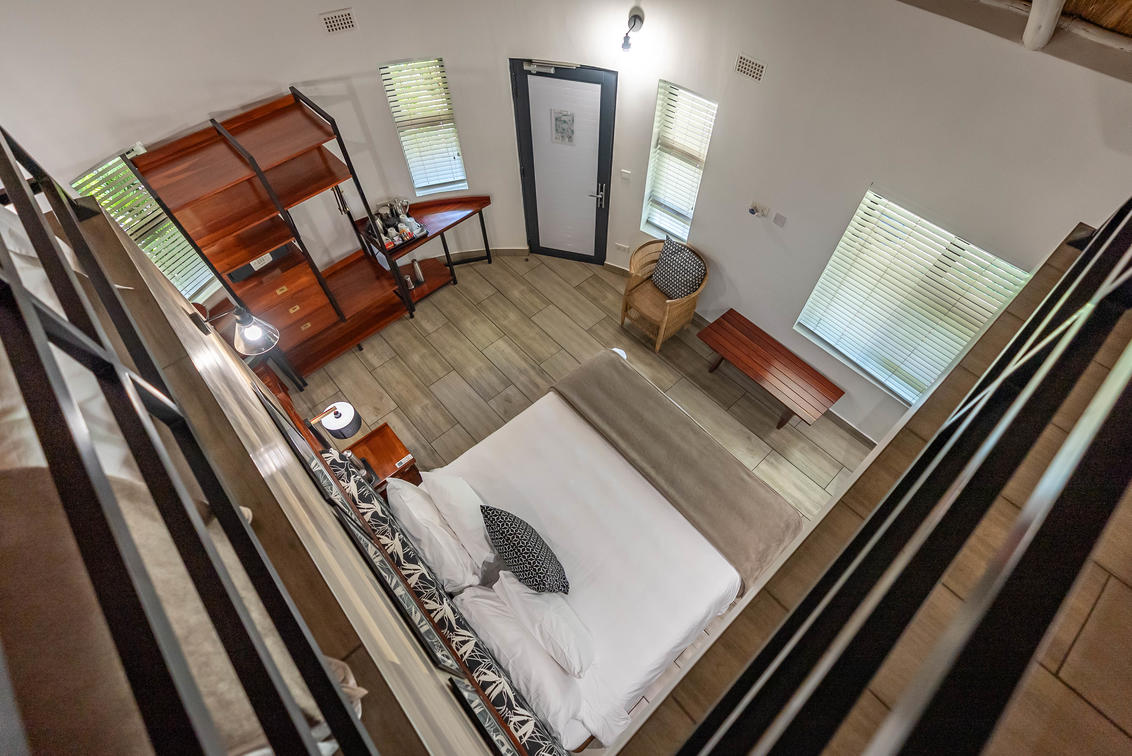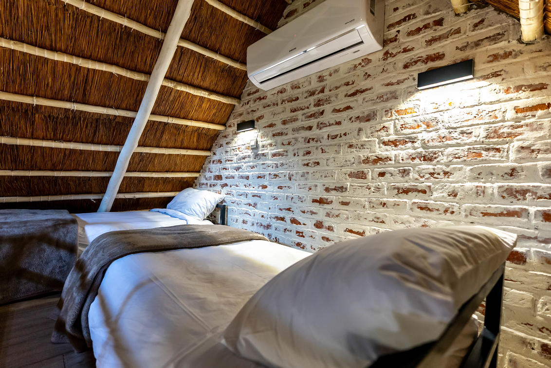 Our spacious family room under a traditional thatch roof is great for families with kids who are adventurous and not scared of heights! A steep ladder accesses the treehouse style loft, where 3 single beds are tucked in snugly under the thatched eaves. Peep at the stars through the dormer window in the thatch roof as you fall asleep to a chorus of African night sounds. A large comfy king bed downstairs is perfect for parents, with enough space for extra suitcases under the loft.
