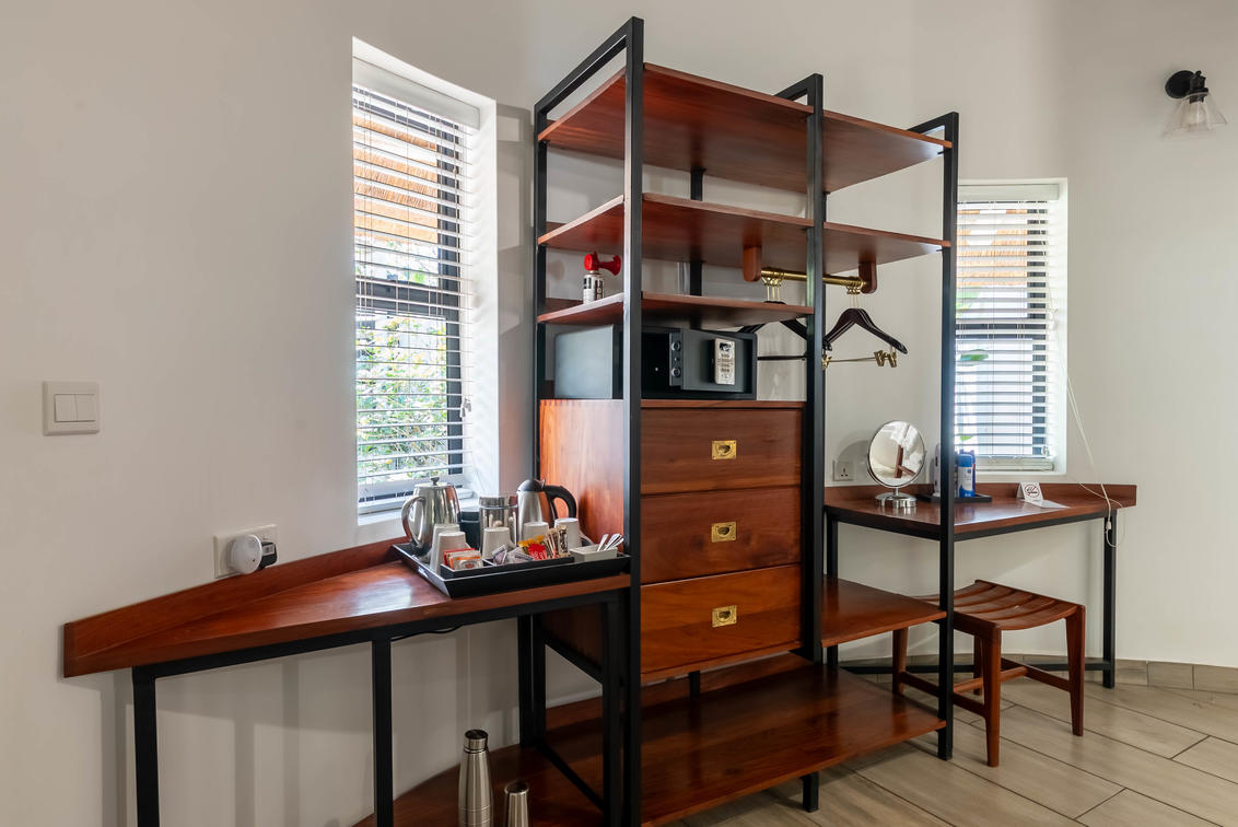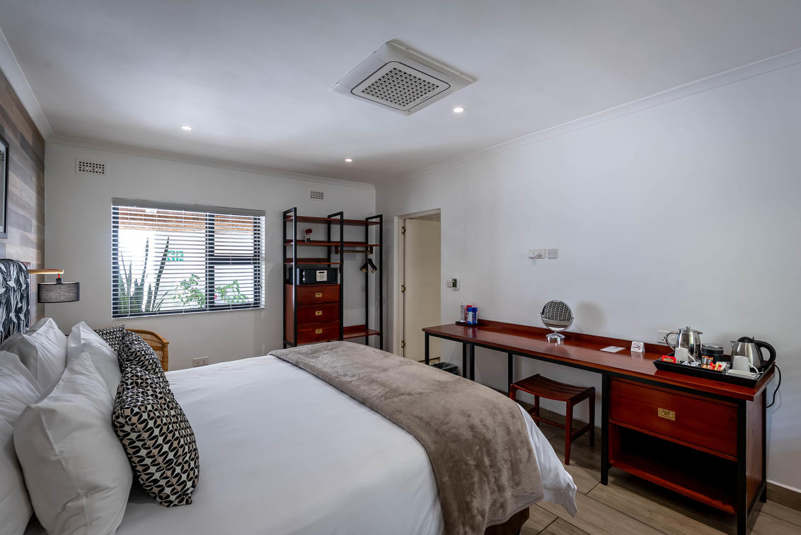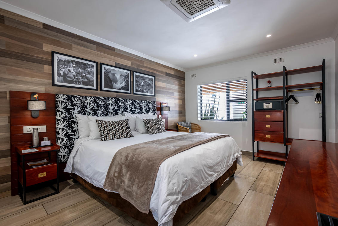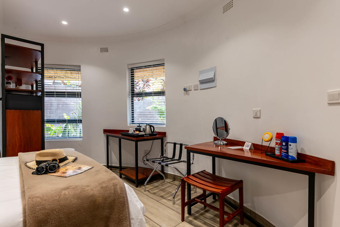This beautiful room is modern and elegant and stands out from the rest with its spacious interior and nostalgic décor. Hand-crafted indigenous teak furniture offers a touch of old world, at the same time providing a sturdy and functional wardrobe/dresser combination which can also double up as a business workspace. An extra-length luxury king bed with crisp, clean linen, as well as international plug sockets and light switches conveniently placed on the headboard ensure a sublime night’s sleep.