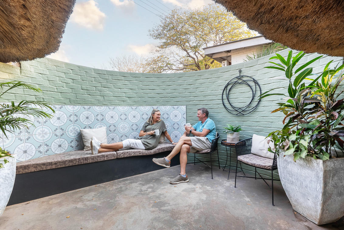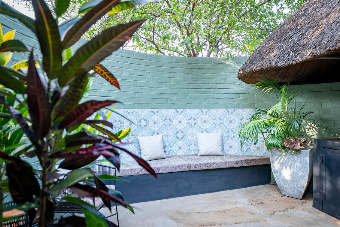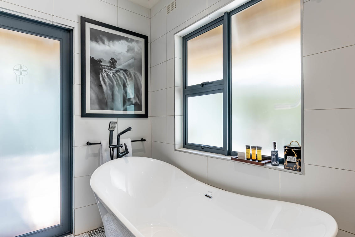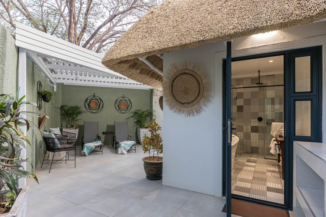Relax and rewind in our gorgeous honeymoon room under a traditional thatch roof, tucked away in the back corner of the property. It’s the perfect place to switch off from the outside world. Immerse yourself in a peaceful space where you will feel safe, secure and pampered. The bathroom is pure luxury, with a double vanity and spacious twin shower, and a beautiful slipper bath for two, where you can soak and dream about tomorrow’s adventures. But the surprise doesn’t end in the bathroom; a peaceful and private outdoor patio/courtyard adjoining the honeymoon room offers you a romantic and relaxed setting to unwind after a busy day of adventuring in Victoria Falls. Take time out to have an invigorating private outdoor shower under the African sky, doze on a sun lounger, catch the first rays of sunlight with your early morning coffee, or read a book in the late afternoon and allow dusk to gently kiss your cheeks as night falls. Stargaze with an evening nightcap before retiring for the night to the comfort of your luxury king bed with its extra-long mattress and crisp, clean linen. We know you will fall in love with this space!
