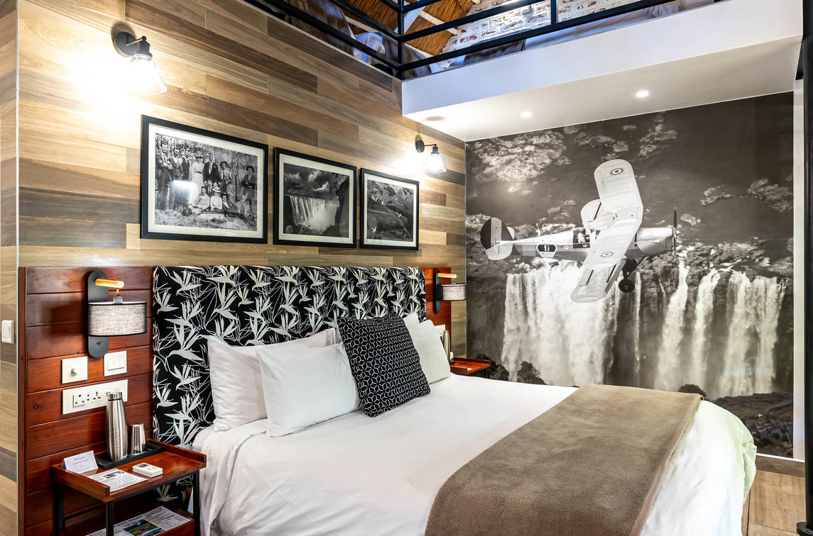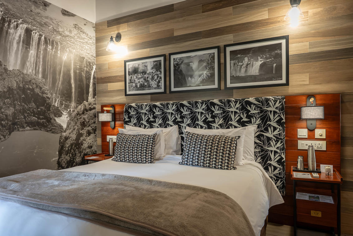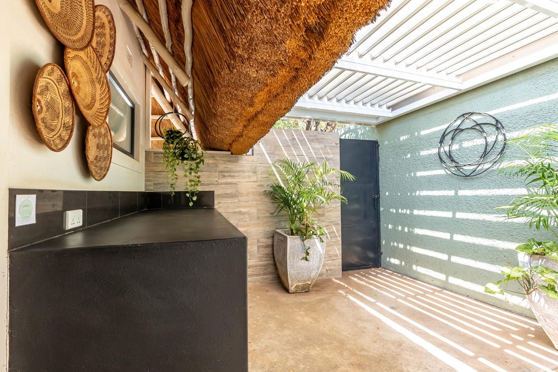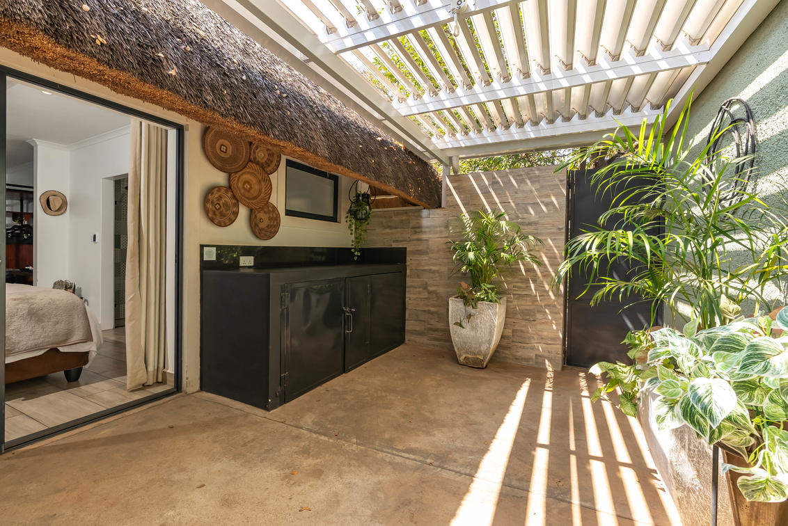 Relax and rewind in our gorgeous honeymoon room under a traditional thatch roof, tucked away in the back corner of the property. It’s the perfect place to switch off from the outside world. Immerse yourself in a peaceful space where you will feel safe, secure and pampered. The bathroom is pure luxury, with a double vanity and spacious twin shower, and a beautiful slipper bath for two, where you can soak and dream about tomorrow’s adventures. But the surprise doesn’t end in the bathroom; a peaceful and private outdoor patio/courtyard adjoining the honeymoon room offers you a romantic and relaxed setting to unwind after a busy day of adventuring in Victoria Falls. Take time out to have an invigorating private outdoor shower under the African sky, doze on a sun lounger, catch the first rays of sunlight with your early morning coffee, or read a book in the late afternoon and allow dusk to gently kiss your cheeks as night falls. Stargaze with an evening nightcap before retiring for the night to the comfort of your luxury king bed with its extra-long mattress and crisp, clean linen. We know you will fall in love with this space!