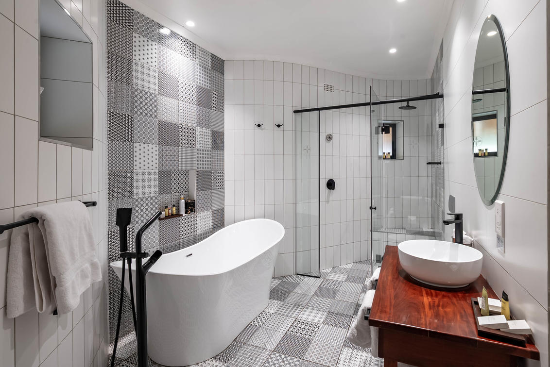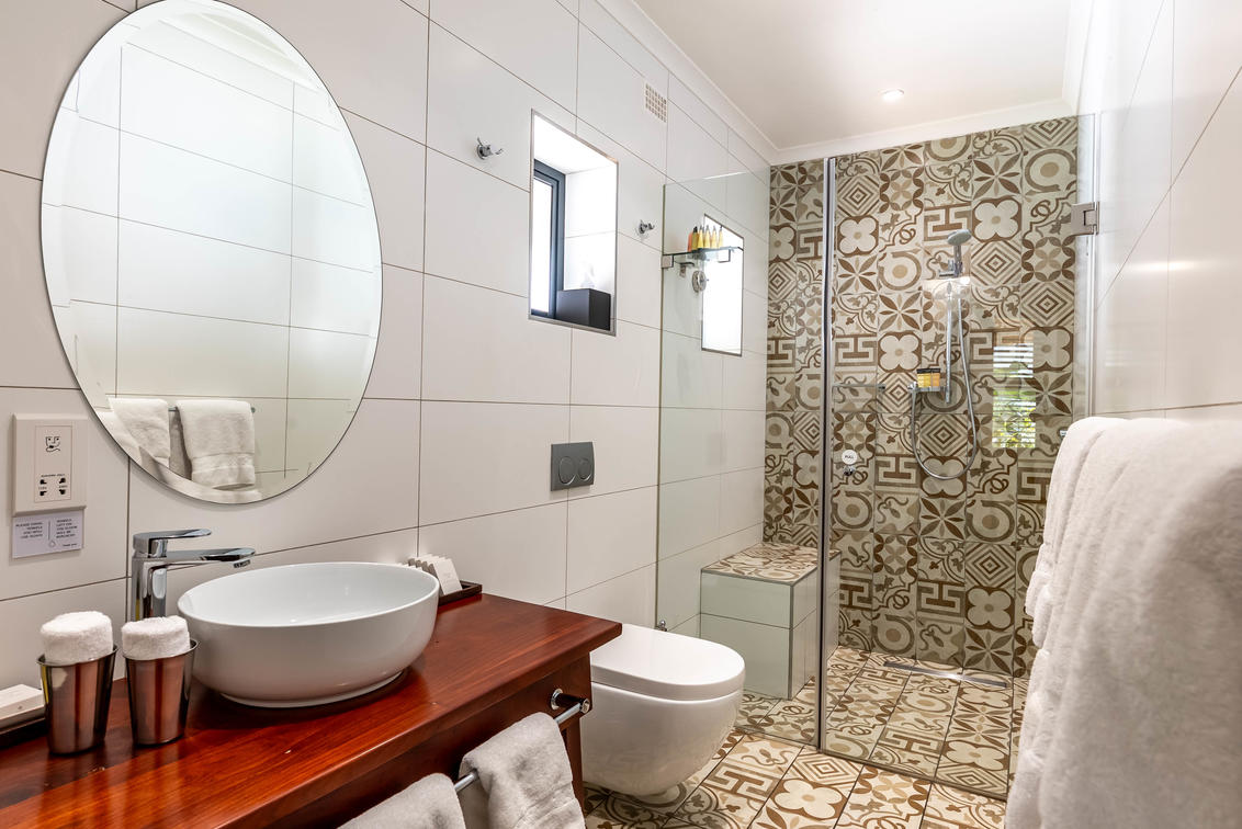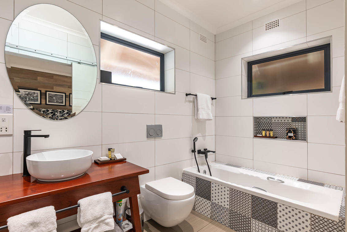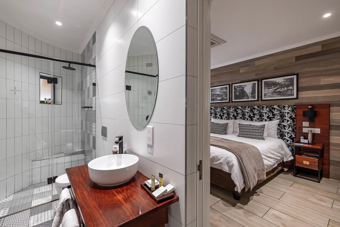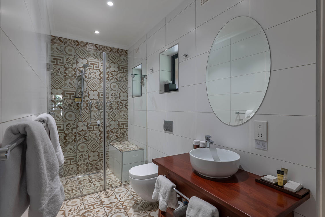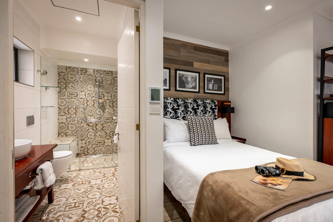 A beautifully appointed, cozy yet compact room leads out onto a spacious private patio courtyard, with extra shade provided by a modern louvred roof cover. Sip an early morning coffee in the privacy of your own space or enjoy an evening nightcap, before retiring for the night to the comfort of your luxury king bed with extra-long mattress and crisp, white linen. An added surprise is a small bath, cleverly tucked into the bathroom opposite the glass shower, perfect for soaking your weary feet after a day full of adventures!