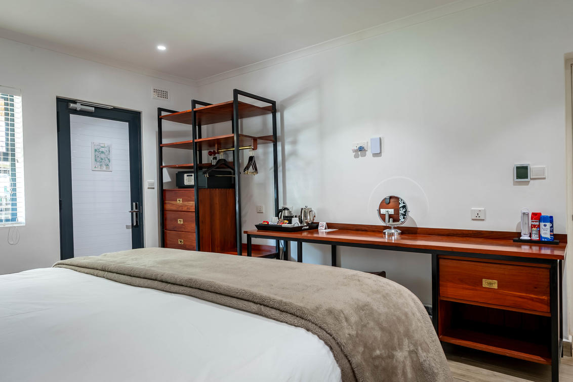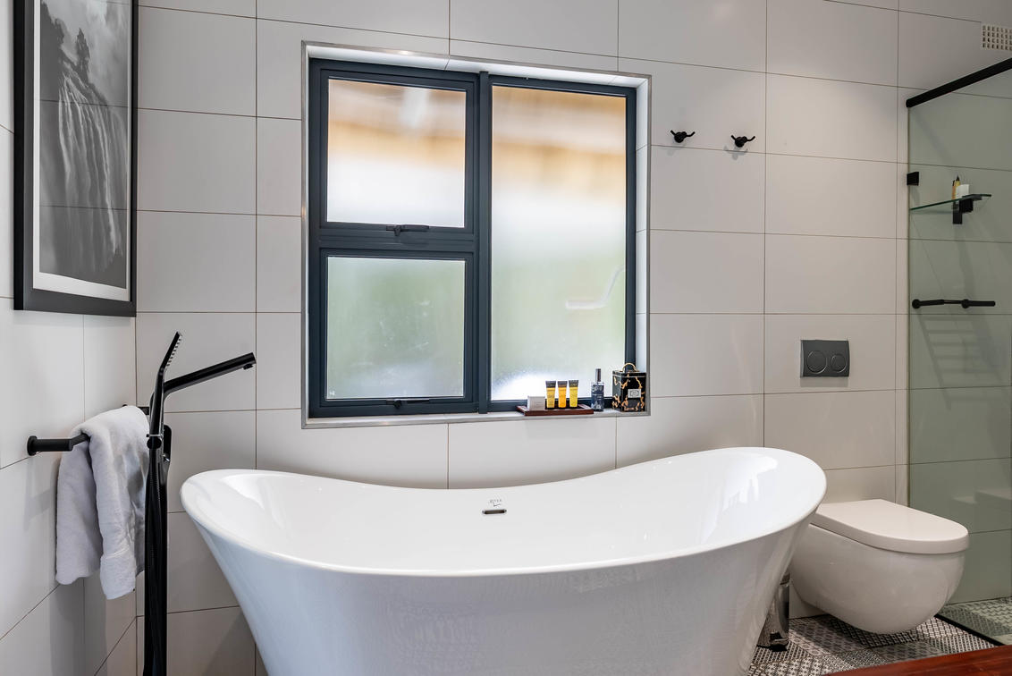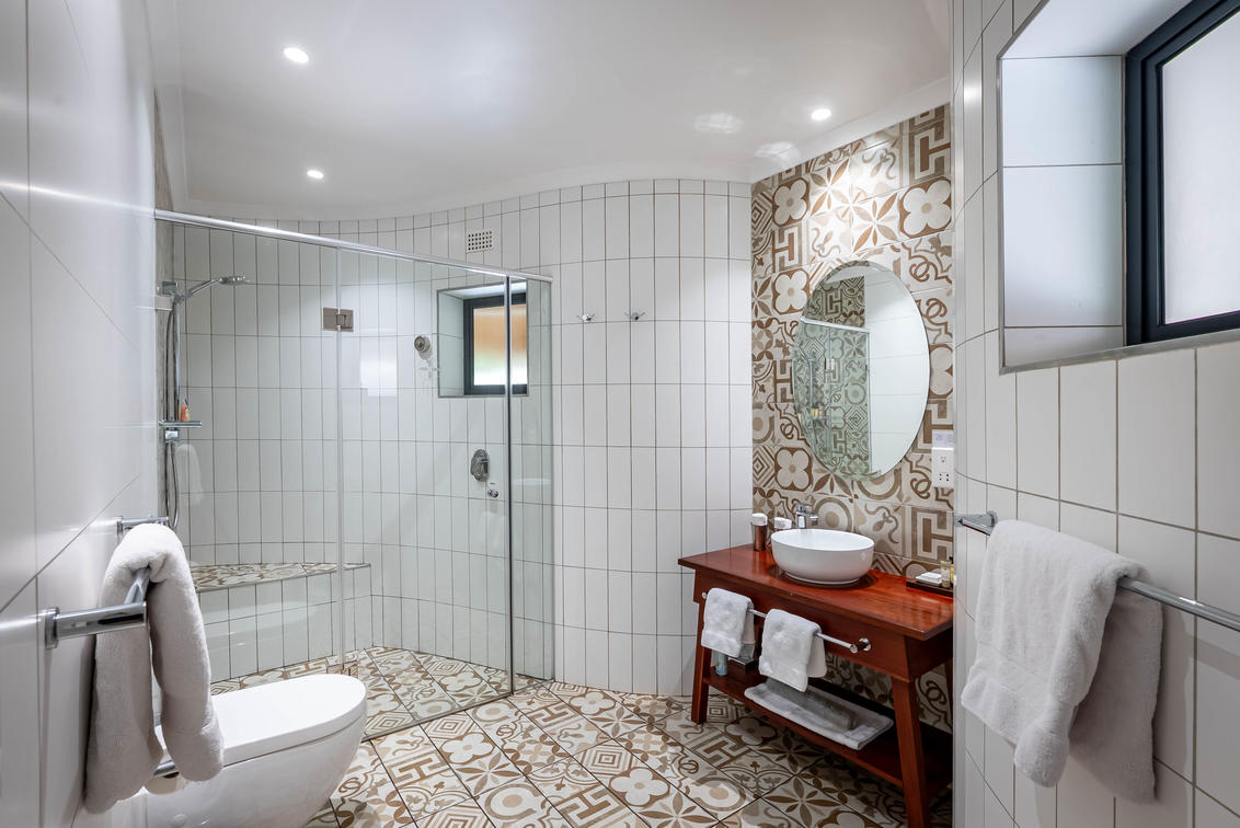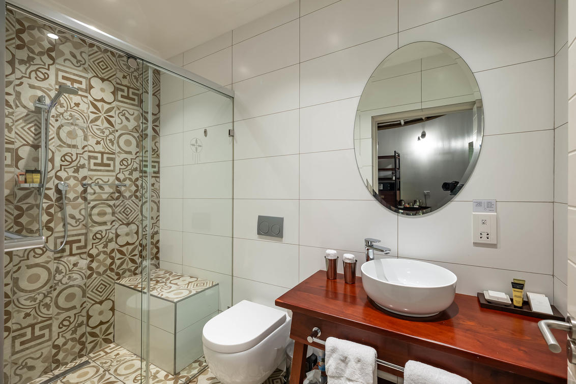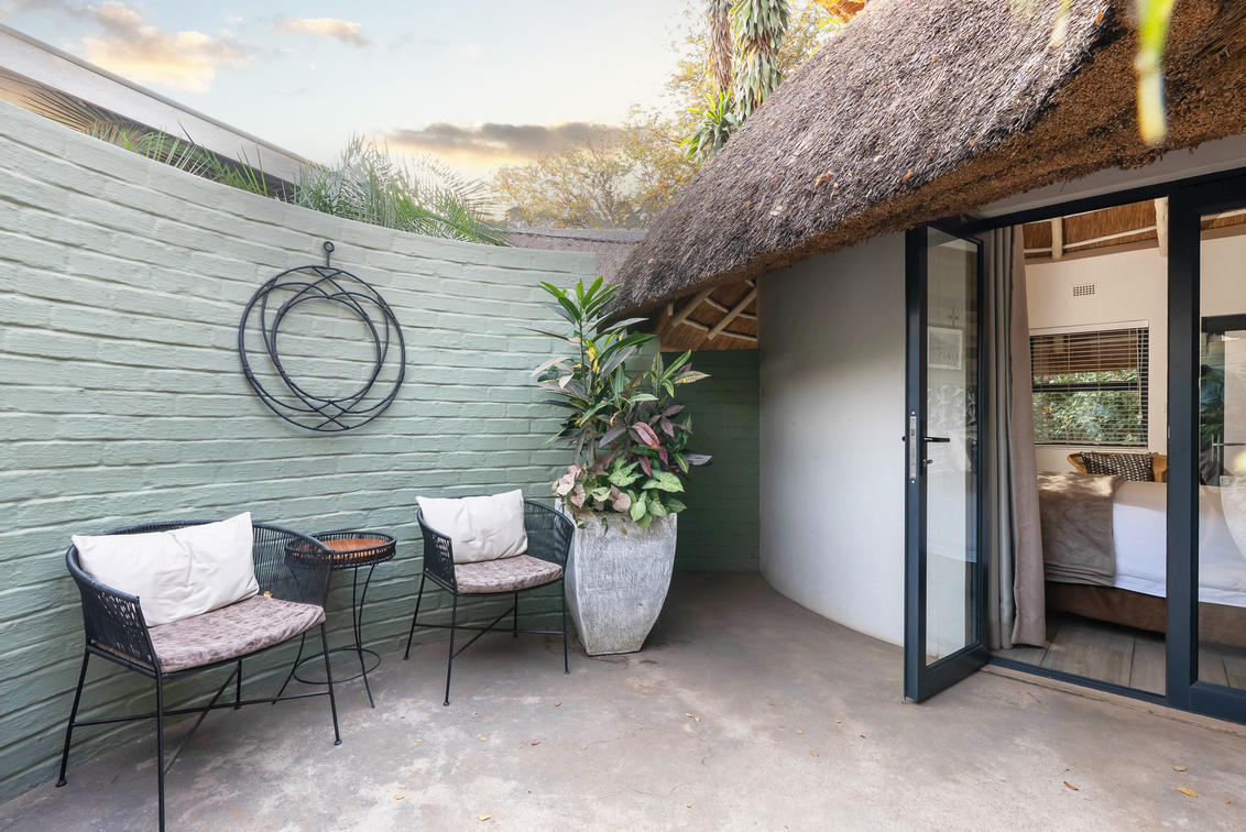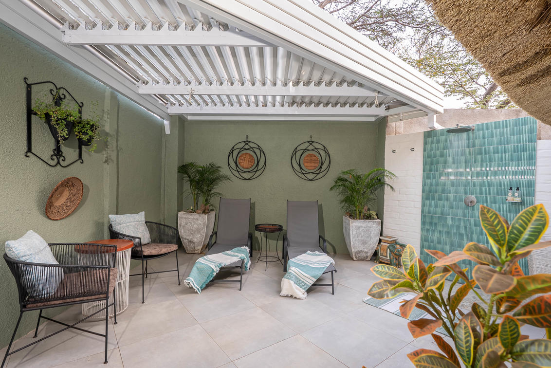 A beautifully appointed, cozy yet compact room leads out onto a spacious private patio courtyard, with extra shade provided by a modern louvred roof cover. Sip an early morning coffee in the privacy of your own space or enjoy an evening nightcap, before retiring for the night to the comfort of your luxury king bed with extra-long mattress and crisp, white linen. An added surprise is a small bath, cleverly tucked into the bathroom opposite the glass shower, perfect for soaking your weary feet after a day full of adventures!