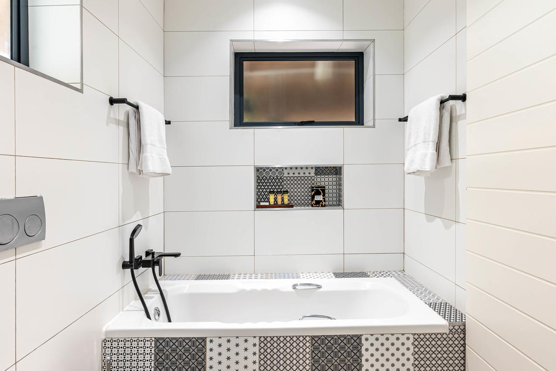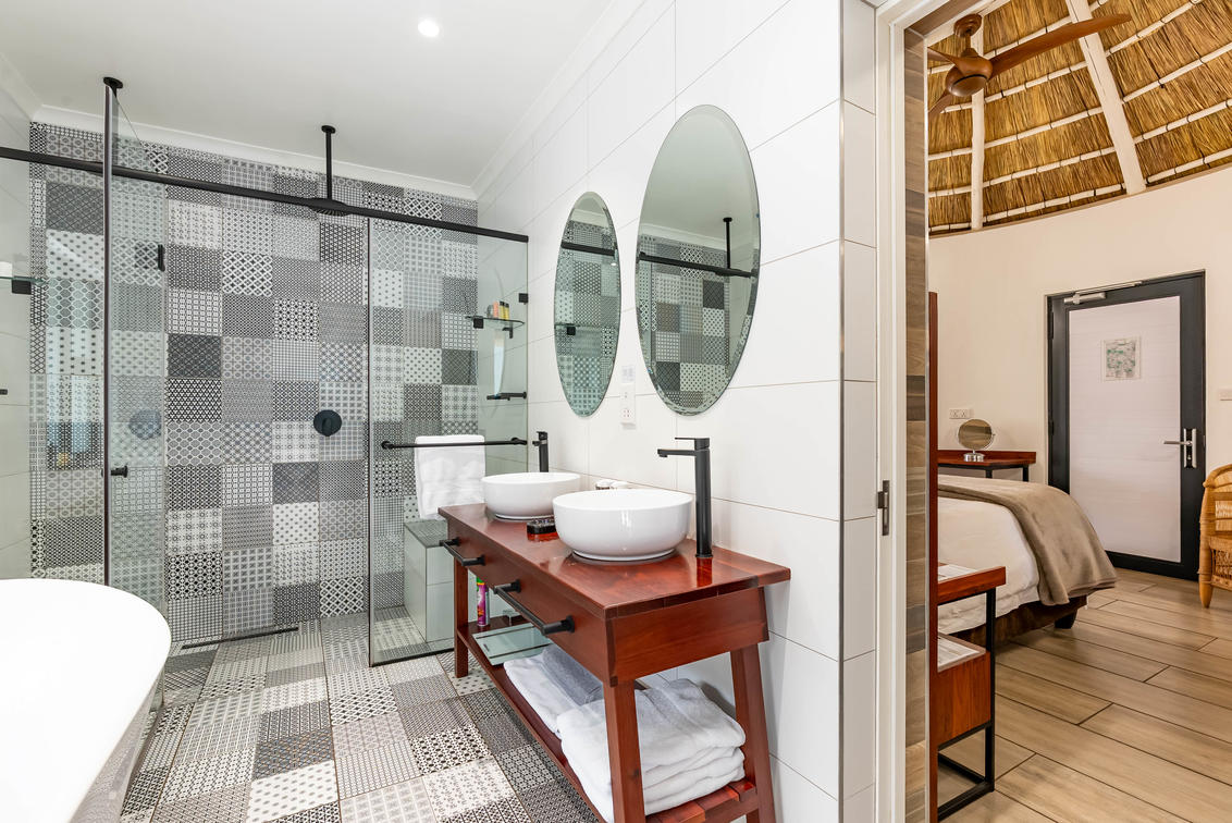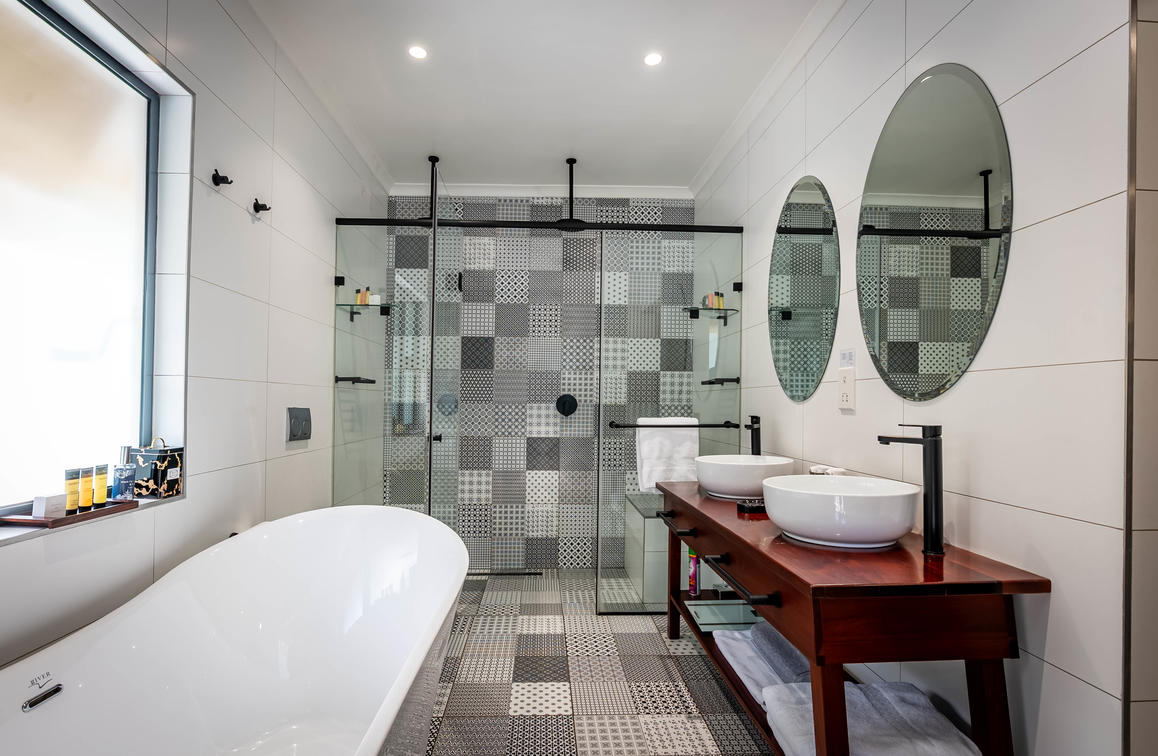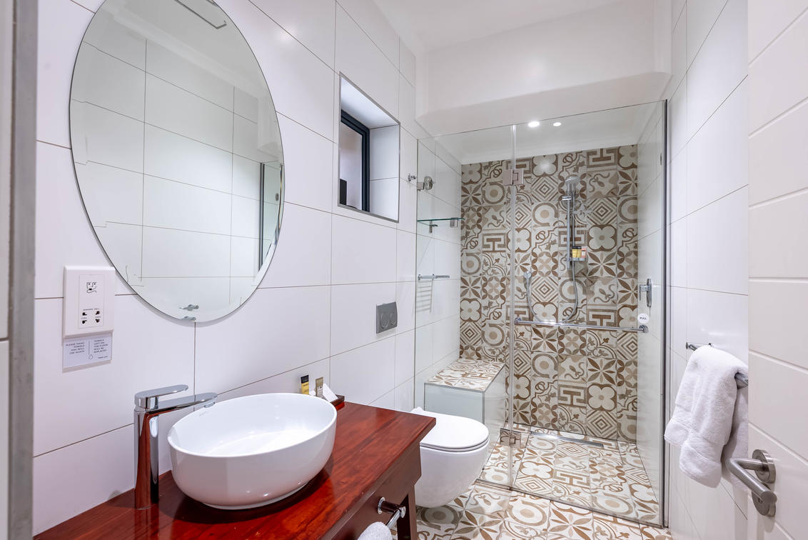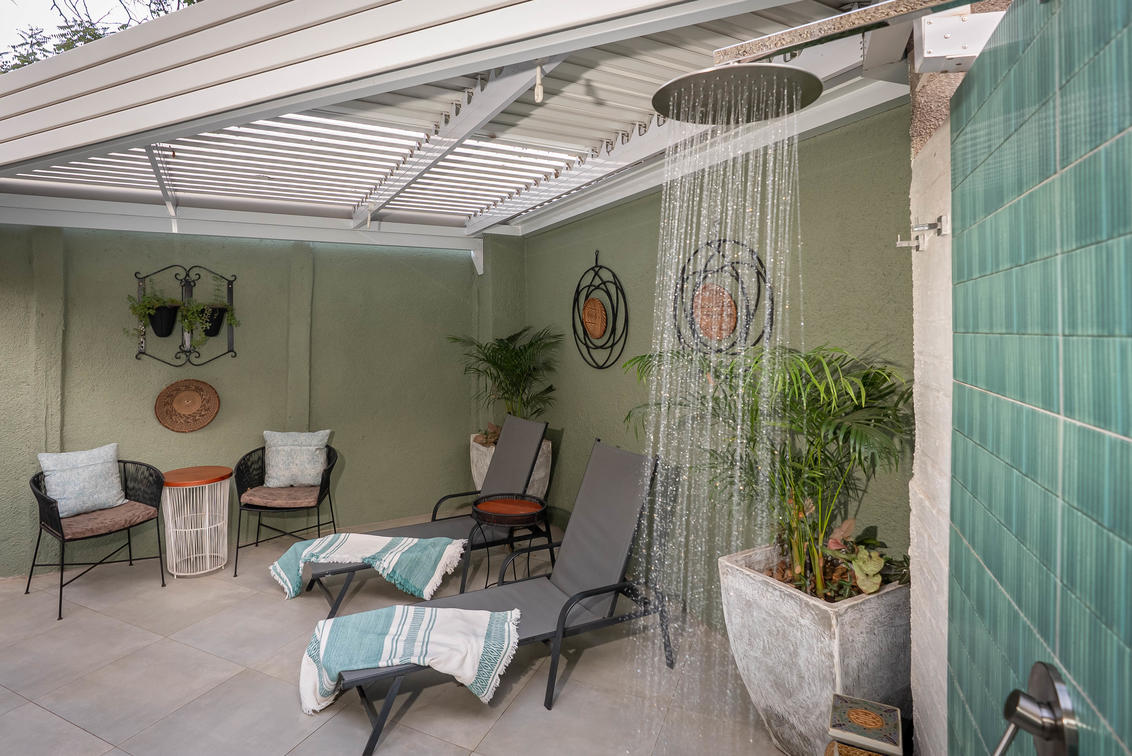 A beautifully appointed, cozy yet compact room leads out onto a spacious private patio courtyard, with extra shade provided by a modern louvred roof cover. Sip an early morning coffee in the privacy of your own space or enjoy an evening nightcap, before retiring for the night to the comfort of your luxury king bed with extra-long mattress and crisp, white linen. An added surprise is a small bath, cleverly tucked into the bathroom opposite the glass shower, perfect for soaking your weary feet after a day full of adventures!