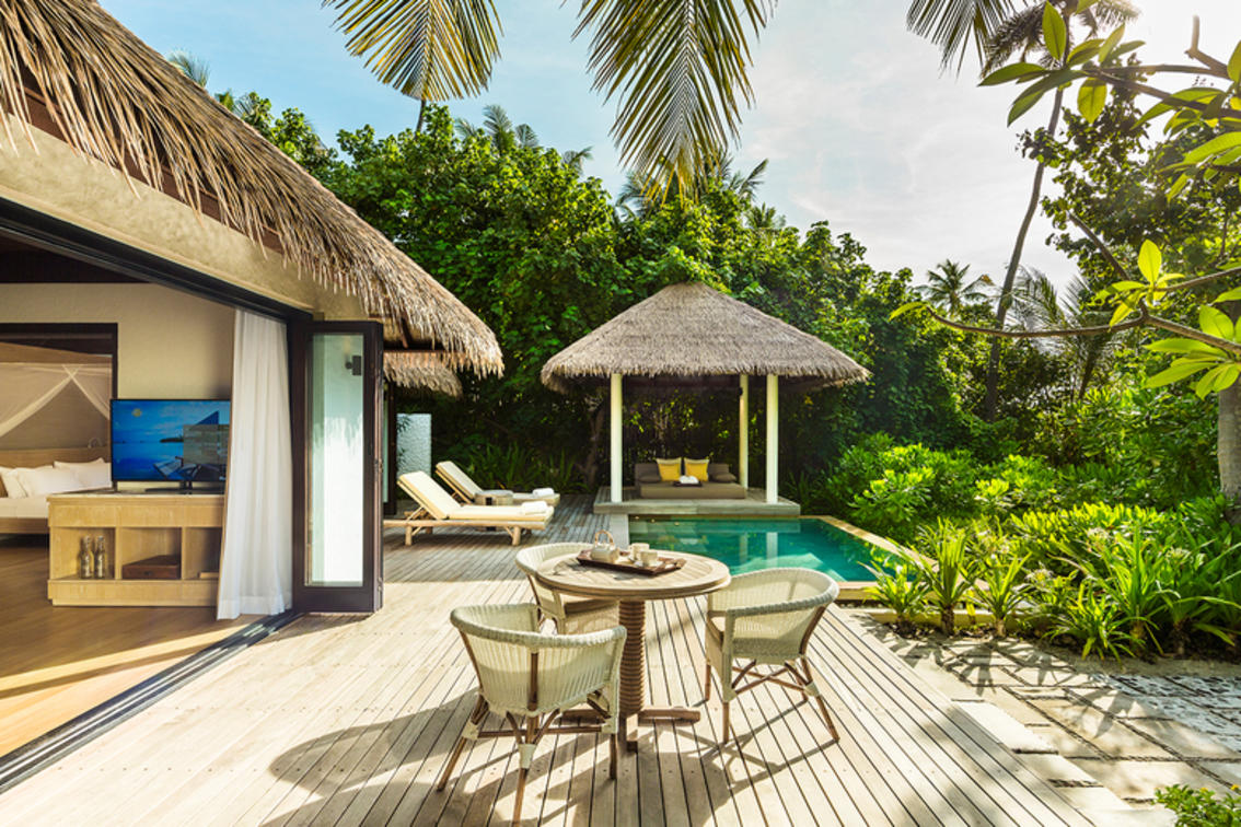 Each of these spacious villas has a private pool, sundeck and full-length windows overlooking the Indian Ocean. The bedroom has a separate dressing area and the bathroom features a sunken bath and outdoor shower. The large and airy sitting area can double up as a sleeping area for kids. Modern amenities included are; air-conditioning, a flat-screen television, complimentary Wi-Fi, and a Nespresso machine.