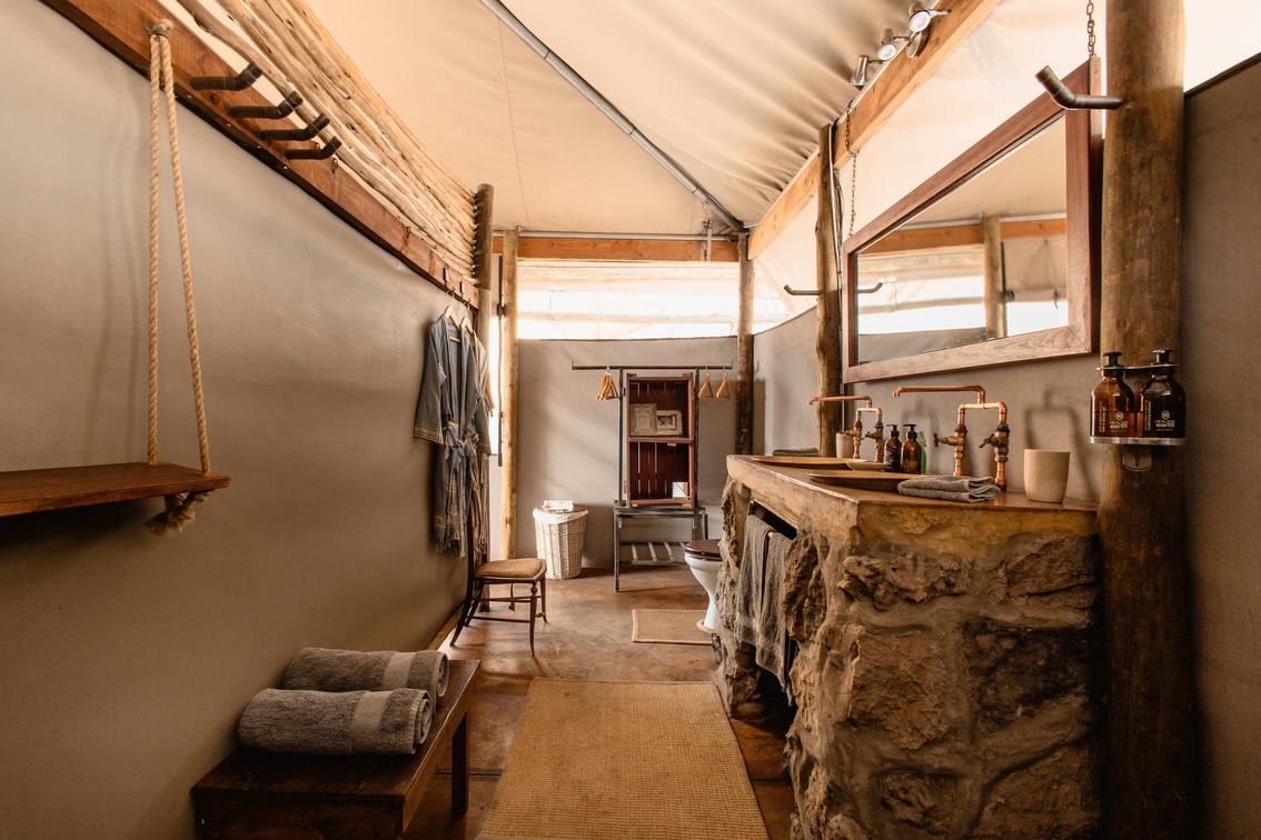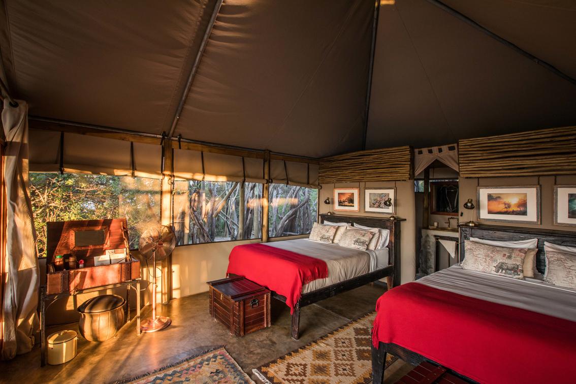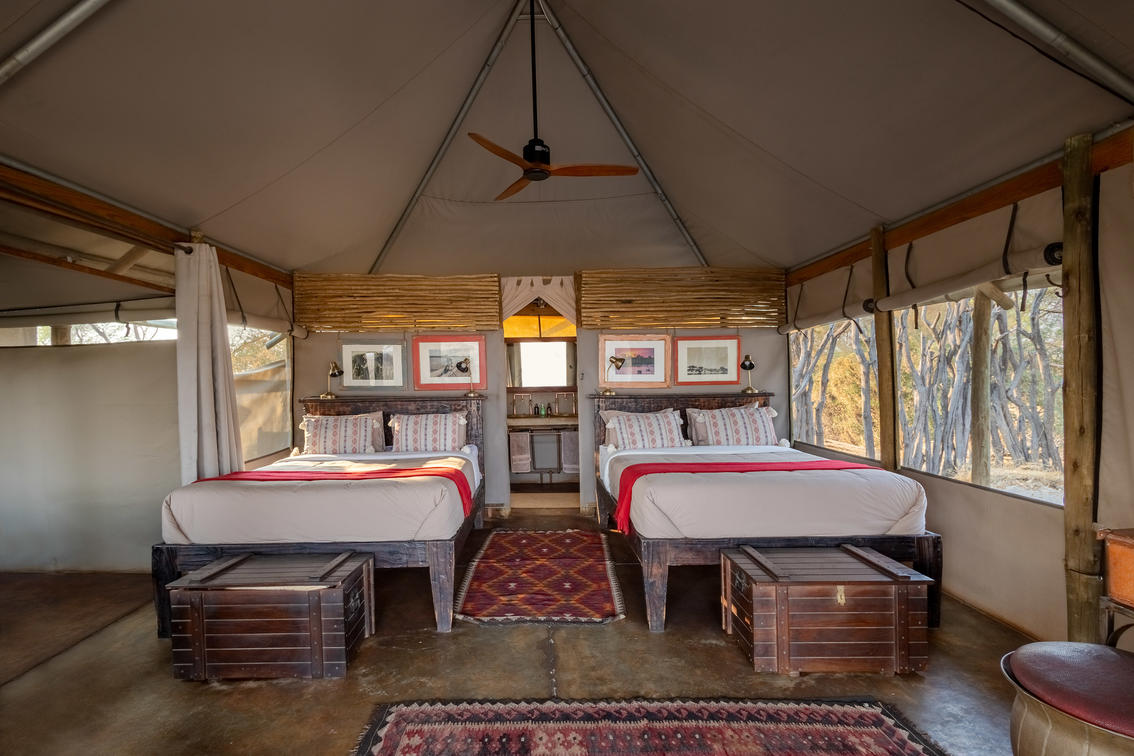 All of the 6 twin tents include 2 x queen sized beds, with views over the Boteti River, into the Makgadikgadi National Park. These tents can easily accommodate2 adults and 2 children and along with the indoor ensuite, each has its own private outdoor shower, fan as well as veranda with a day bed and seating area