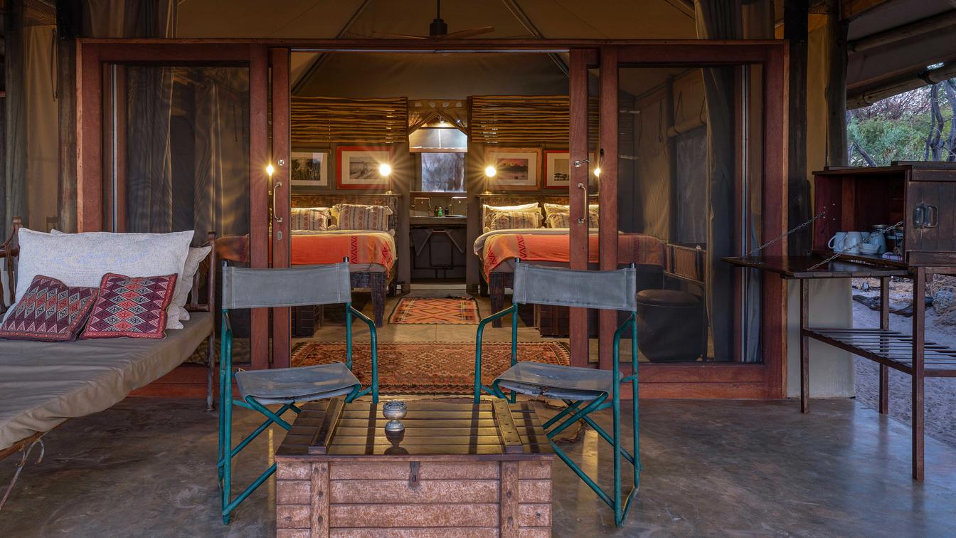 The 2 King tents made up of 1 x king sized bed offers views over the Boteti River, into the Makgadikgadi National Park. Along with the indoor ensuite, each has its own private outdoor shower, fan as well as veranda with a day bed and seating area
