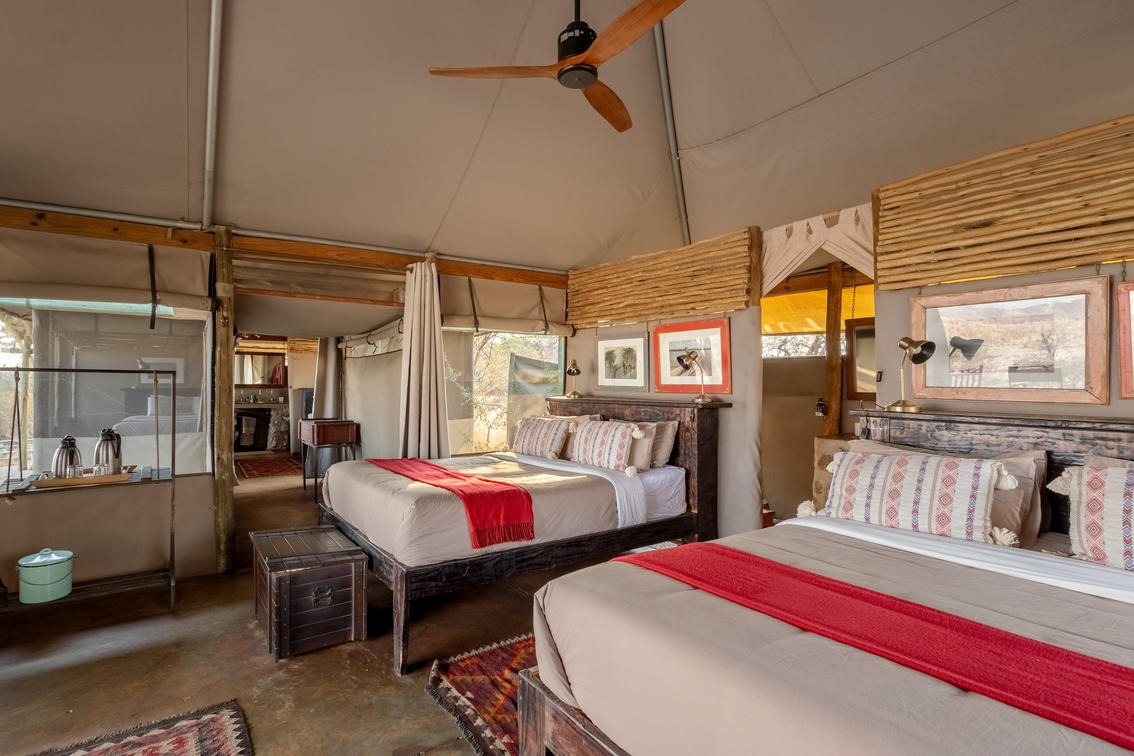 There are 2 Family tents consisting of 2 adjacent tents, each with views over the Boteti River, into the Makgadikgadi National Park. Along with the indoor ensuite, each has its own private outdoor shower, fan as well as veranda with a day bed and seating area. One is able to accommodate a family of 5 with 1 x king size bed and 3 x single beds. The second Family Tent can accommodate a family of 4, with 1 x king size bed and 2 x single beds.