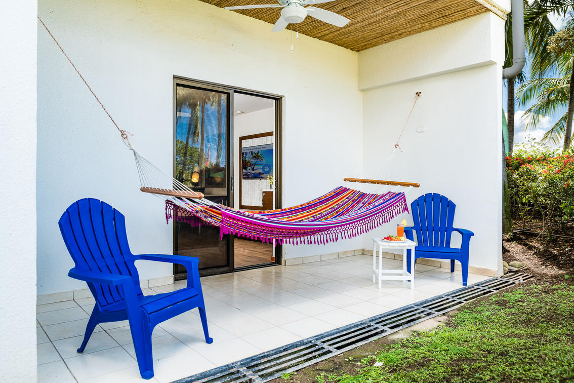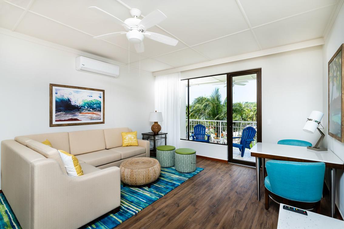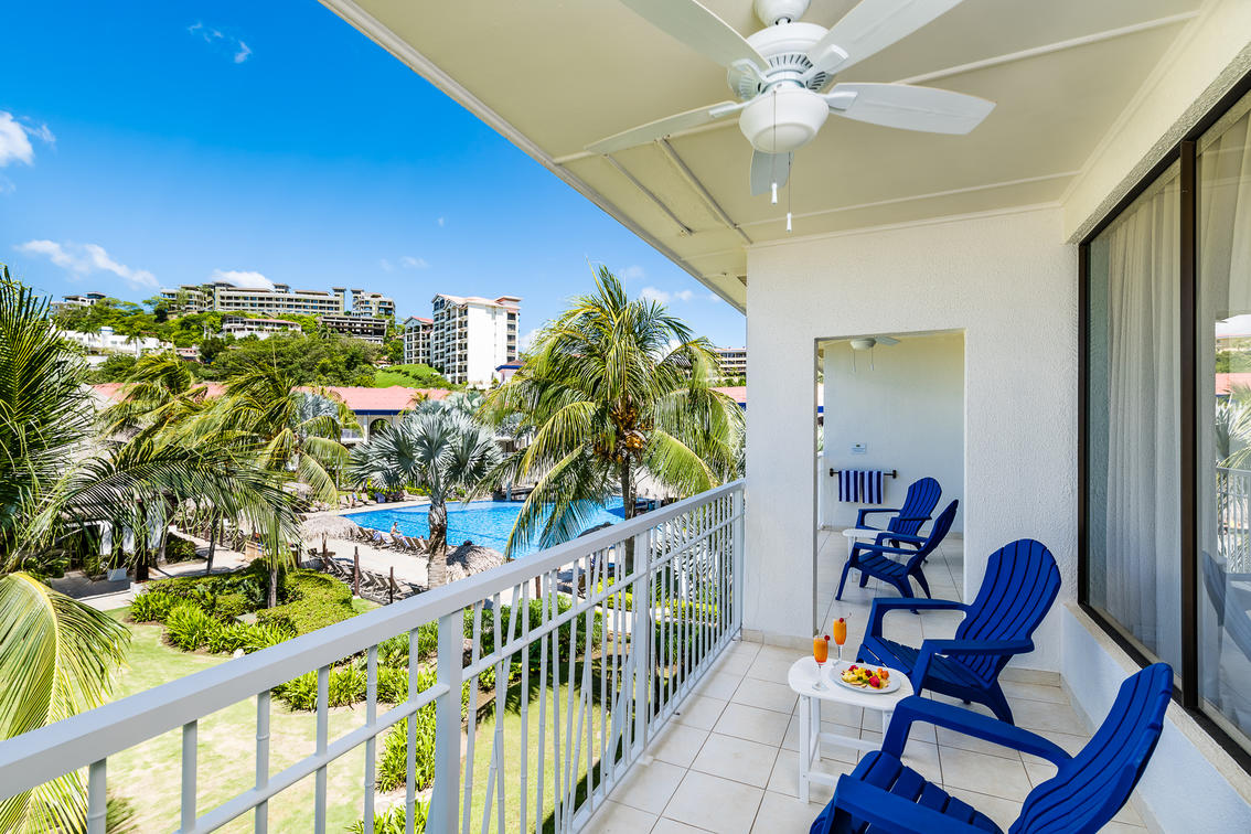 This room includes a private balcony overlooking the main pool area of the resort.