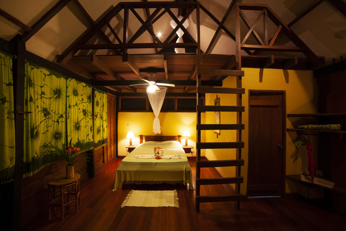 Exotic thatched roof bungalows surrounded by Tropical Rainforest, just a few steps from the Caribbean sea Just a few steps from the Caribbean sea, with the tropical rainforest in background, the spacious and tastefully decorated bungalows are privately set apart amidst lush gardens full of color and natural beauty. Designed and crafted in a unique style that blends traditional materials, exotic woods and thatched-palm roofs, with a modern building concept, each bungalow has a particular atmosphere. Each one comfortably lodge up to four people, with one queen size bed and two twin size beds, one of them placed in the mezzanine to provide privacy and wonderful spatial flexibility. All decorated with bamboo lamps and furniture, while ceiling fans, large windows with mosquito nets and high peaked roofs allow a refreshing natural air circulation..