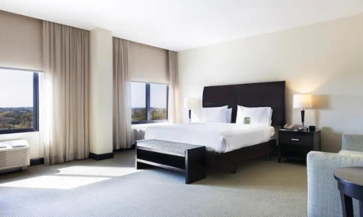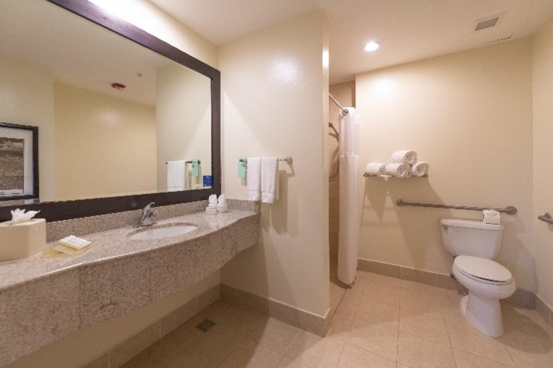 Get a comfortable night's rest in our one bedded evolution room featuring a plush king-sized Serta Suite Dreams bed with adjustable settings, hypo-allergenic pillows, and freshly laundered linens. Relax while watching your favorite shows on the 32-inch flat-screen HDTV with over 70 premium channels or unwind to your favorite tunes with our alarm clock/MP3 player. Sitting area complete with an ottoman and a hospitality center furnished with a microwave, mini-refrigerator, and a coffeemaker. Our oversized work area features an ergonomic desk chair, two telephones with data ports and voice mail, desk-level electrical outlets, complimentary WiFi access and adjustable lamp lighting to help ensure productivity. At the end of the day, refresh in the vanity area complete with granite countertops, roll-in shower and grab bars, complimentary signature bath products, hair dryer, and fluffy towels.