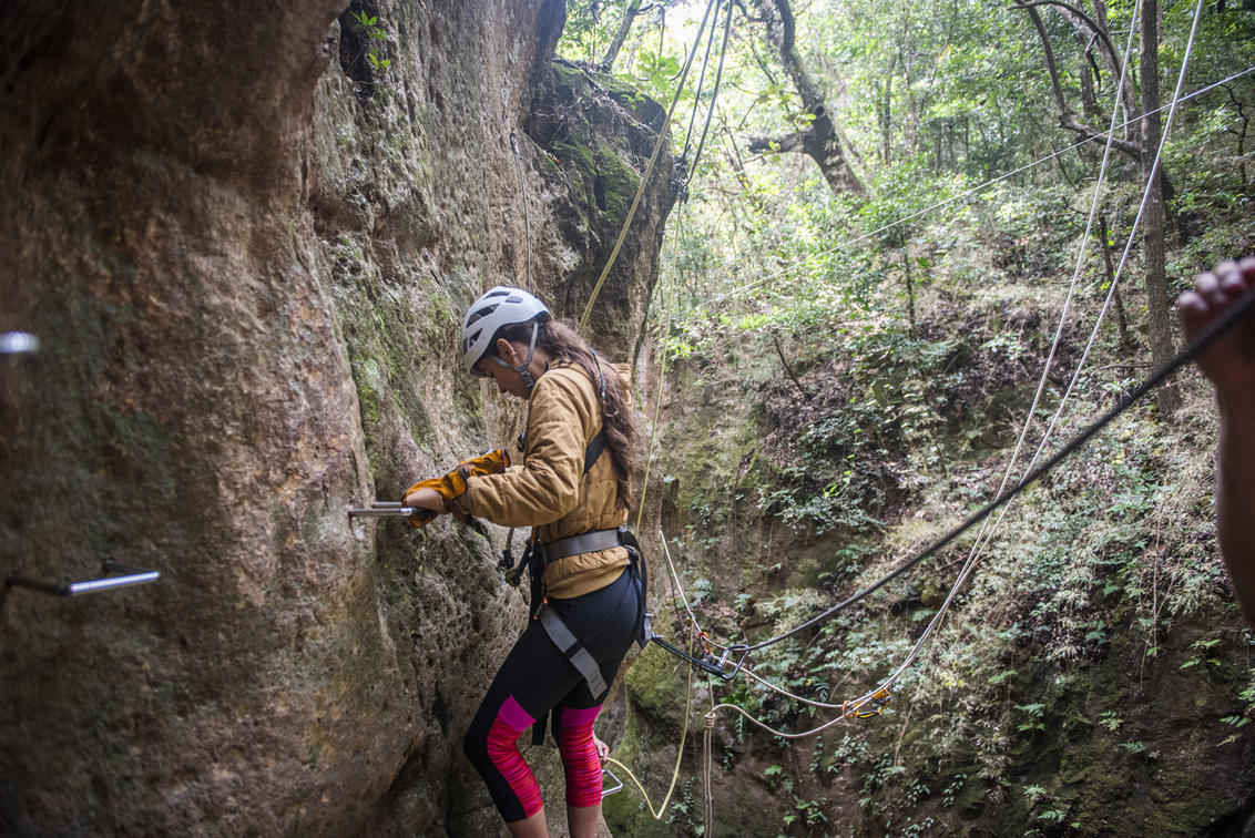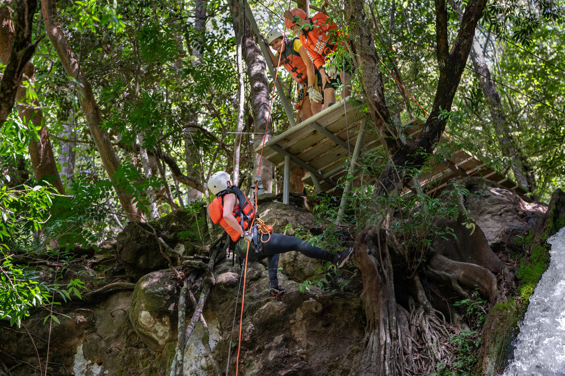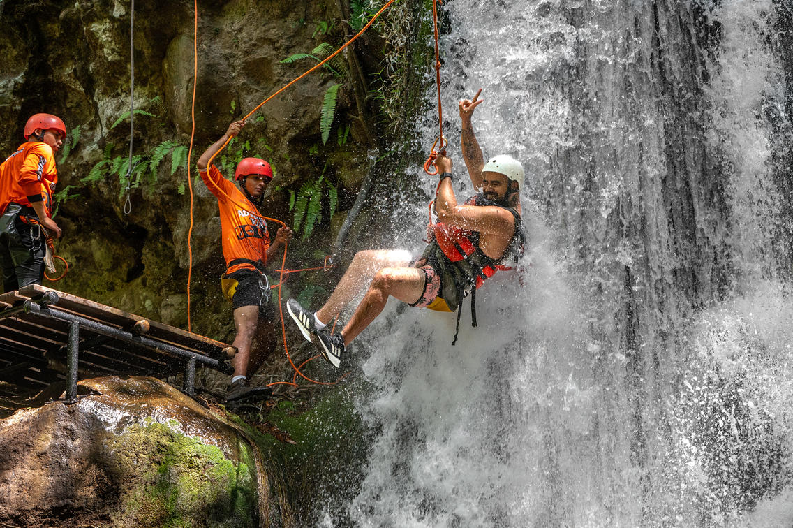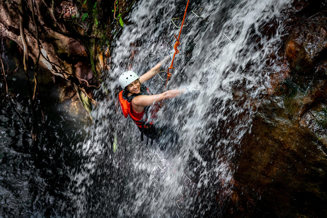 After the first rappel, rock climb assisted by the wall of rock next to the waterfall to go back down on rappel. Then you can make another rappel in a second location and a Tarzan pendulum into the water of the waterfall.