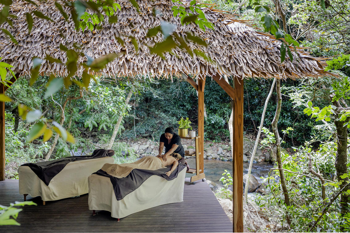 At Simbiosis Spa, located in the heart of the transitional tropical dry forest at the foot of the majestic Rincón de la Vieja Volcano and beside the Colorado River, we invite you to reconnect with yourself and renew your energy in a unique natural setting. Our thermal waters, fed by volcanic activity, are naturally enriched with minerals that promote health and relaxation. They are complemented by volcanic mud springs and mineralized clay pools, offering exfoliating and regenerative properties for your skin. We also feature a dry sauna with forest views, open-air massage areas, and a treatment room surrounded by the sounds and aromas of nature. The thermal circuit guides you through stages of wellness: sauna, volcanic mud, solarium, thermal waters, and cold-water pools, in a process designed to detoxify, relax, and revitalize your body. Our therapists accompany you every step of the way, starting with a welcoming herbal drink prepared with plants from our gardens. You may also complement your experience with a relaxing or therapeutic massage, or choose from body wraps made with local ingredients. Each service is designed to enhance your well-being and deepen your connection with nature. Visit our wellness spa for a revitalizing experience!