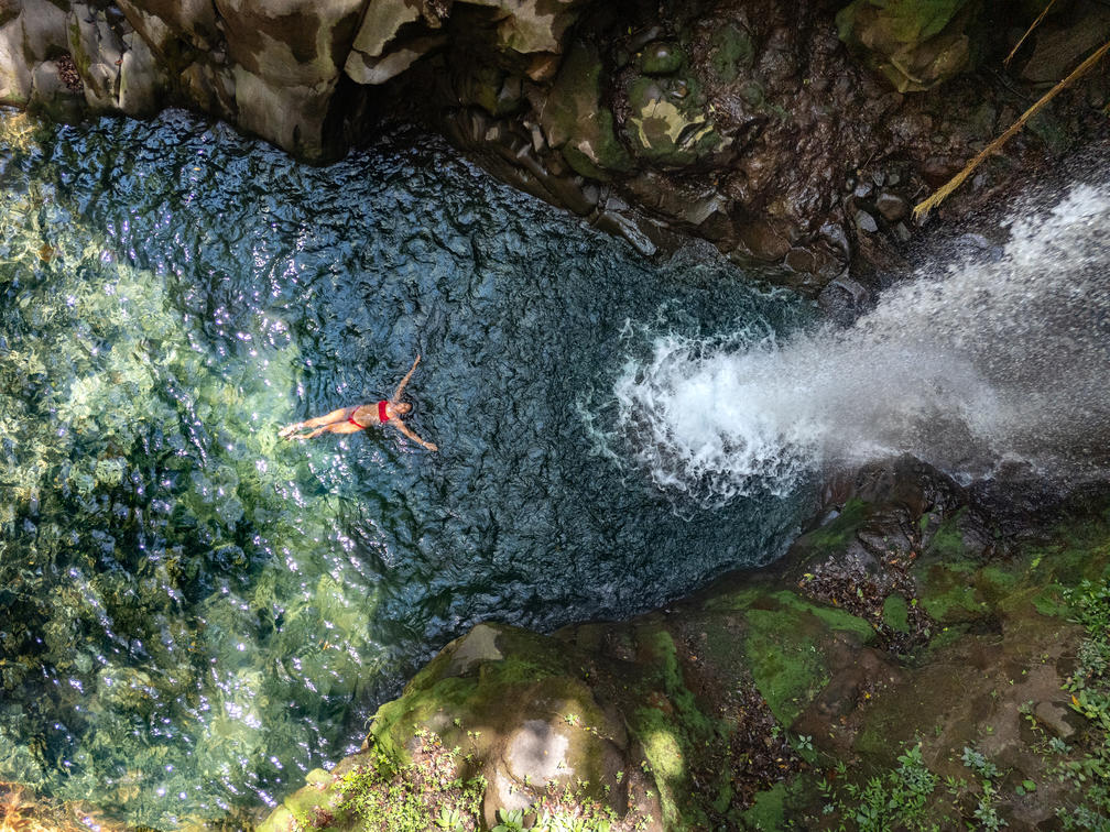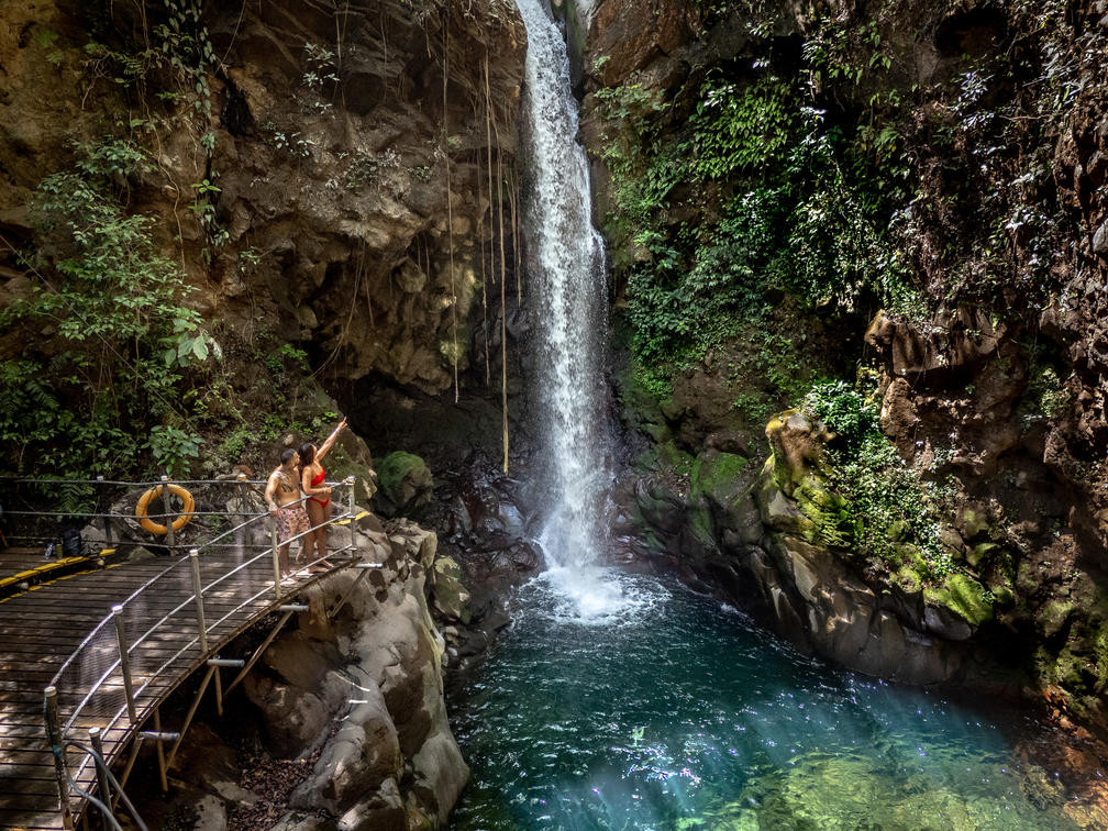Two twin falls cascade into a stunning pool of sky-blue mineral waters. A small canyon of volcanic rock surrounds the falls and the pool, creating an intimate and secluded tropical oasis for a refreshing dip.