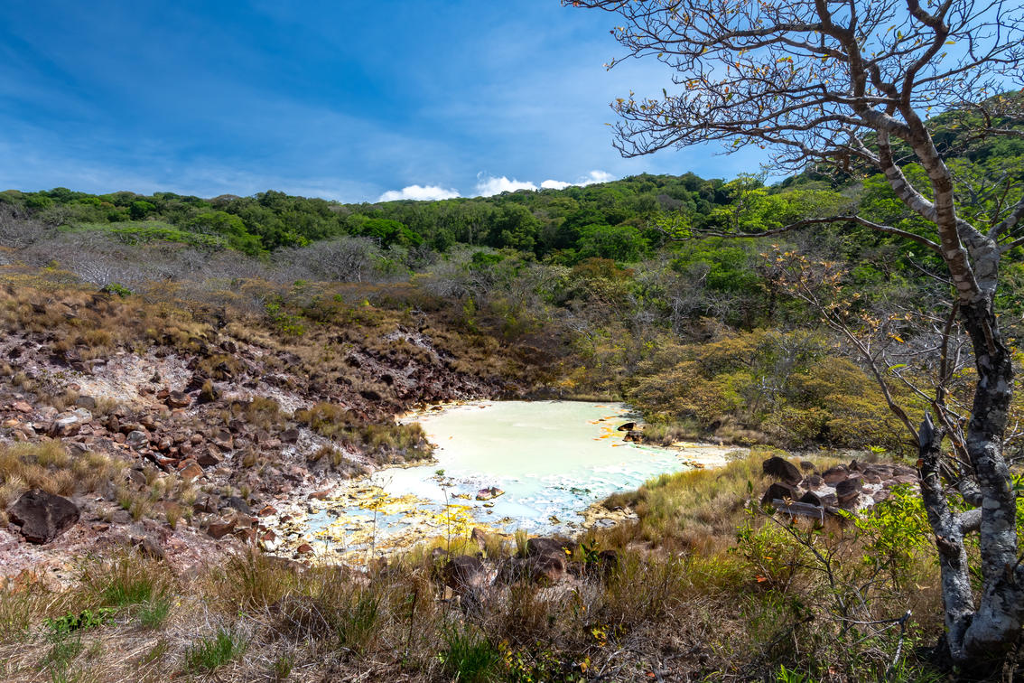 The Las Pailas sector spectacularly shows the power of the Rincon de la Vieja volcano, the most active and largest volcano in Guanacaste, Costa Rica. Steam and sulfur come from natural fumaroles of the yellow and rusty soil. Witness clay pails in various shades of brown with boiling volcanic water, fine gray volcanic mud bubbles and explosions in large pails. This volcano is like no other in Costa Rica.