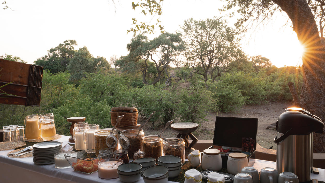 Morning pre-game drive snacks, brunch and high tea are served on the shaded terrace overlooking the waterhole.