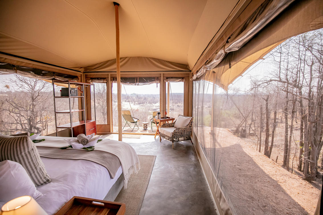 Camp Chitubu's family room is designed to offer a comfortable and inclusive space for families. It features a master bedroom along with a separate children's bedroom, providing a sense of privacy and convenience. The central en-suite bathroom is elegantly appointed, showcasing teak vanities, hand-painted basins, and teak stand-up showers.