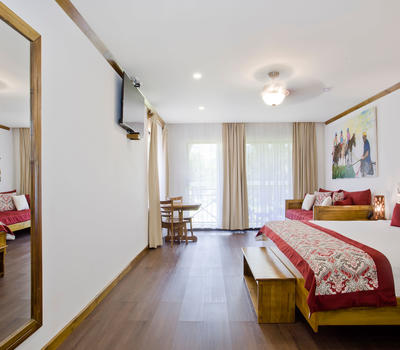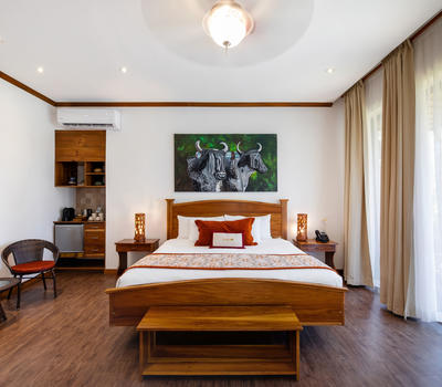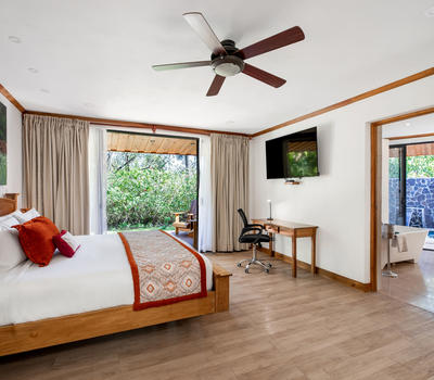 Hacienda Guachipelin’s Legacy Suites with Volcano View feature traditional architecture and authentic handcrafted furniture in typical Guanacaste fashion. Follow the flower-lined paths from our reception area and relax in your deluxe accommodations. Our top-quality Legacy Suites are located away from the main guest rooms and activities. Those looking for a quieter, private, and comfortable experience when staying at Hacienda Guachipelin will want to stay in our Legacy Suites. Equipped with one king-size bed, the large Legacy Suites are all about having the space to stretch out and relax. Hang in the hammock on your front terrace or rock away to the sound of the trees swaying in the wind on your private back balcony. These suites are the perfect front-row seat to kick back and watch the unique bird and animal life that can be found in this magical wilderness landscape. Each Legacy Suite comes with air-conditioning and a ceiling fan, safe, closet, private bathroom with hot water, free Wi-Fi, cable TV, telephone, coffeemaker, mini-refrigerator, and a hair dryer. Rate includes breakfast and full access to the Rio Negro Hot Springs & Mud baths.