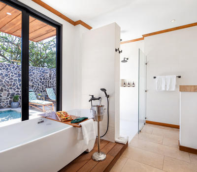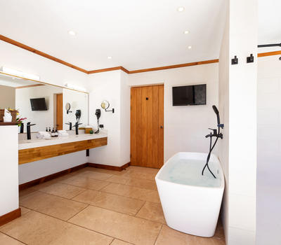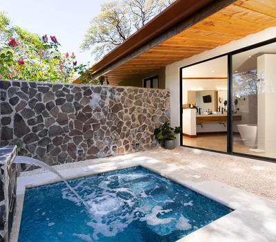 The crown jewels of accommodations at Hacienda Guachipelin are our two premier suites: El Cenízaro and El Cedro. Named after two of the most iconic giant tree types found in this region of Guanacaste, the Cedar and the Ash, these two private suites are equally as grand and majestic as their namesakes. Each suite enjoys a spacious open-plan living area that is decorated with handcrafted Costa Rican furniture and art that depicts traditional Guanacaste ranch life. The suites come with a large terrace where you can take in the incredible view of Rincón de la Vieja Volcano framed by our lovely tropical gardens.