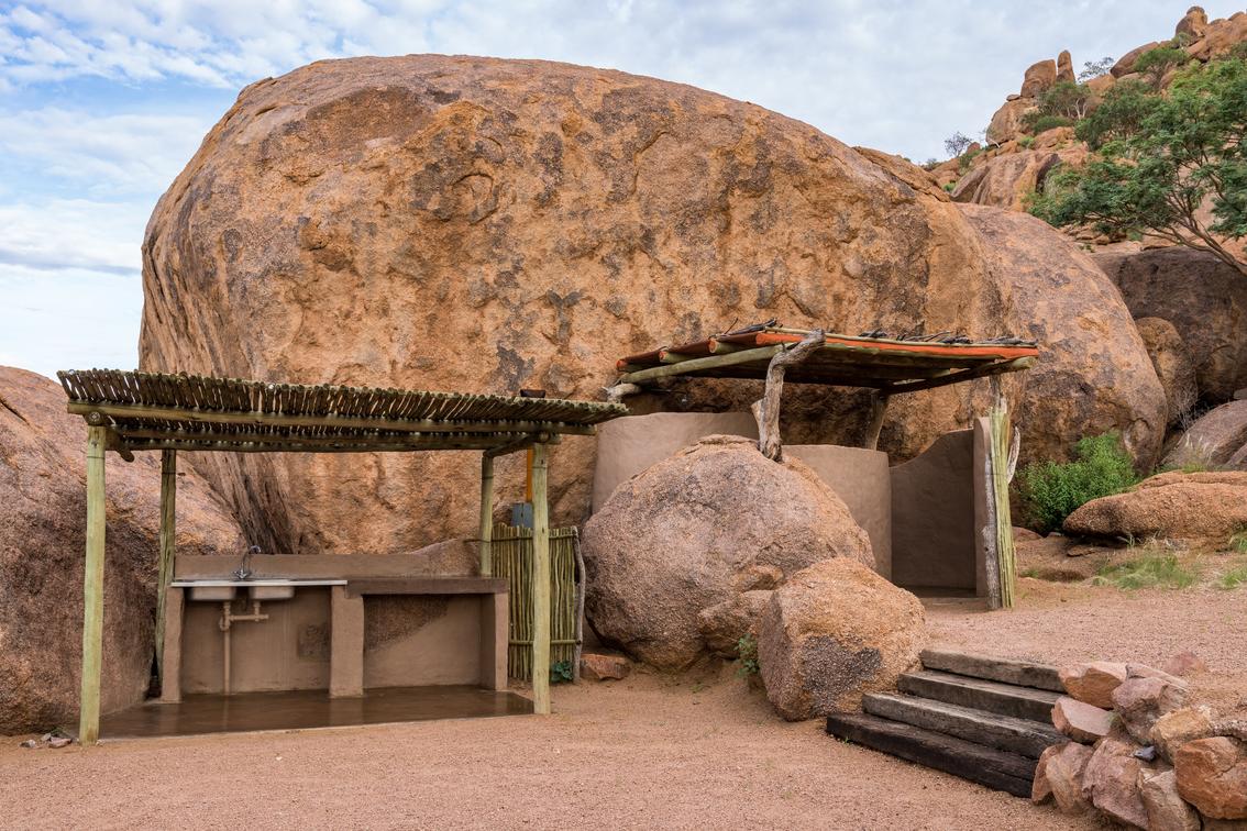 Each campsite has its own private ablution facilities – shower, basin and toilet, along with a braai / BBQ, a kitchen wash-up area and shaded area with a seating bench.