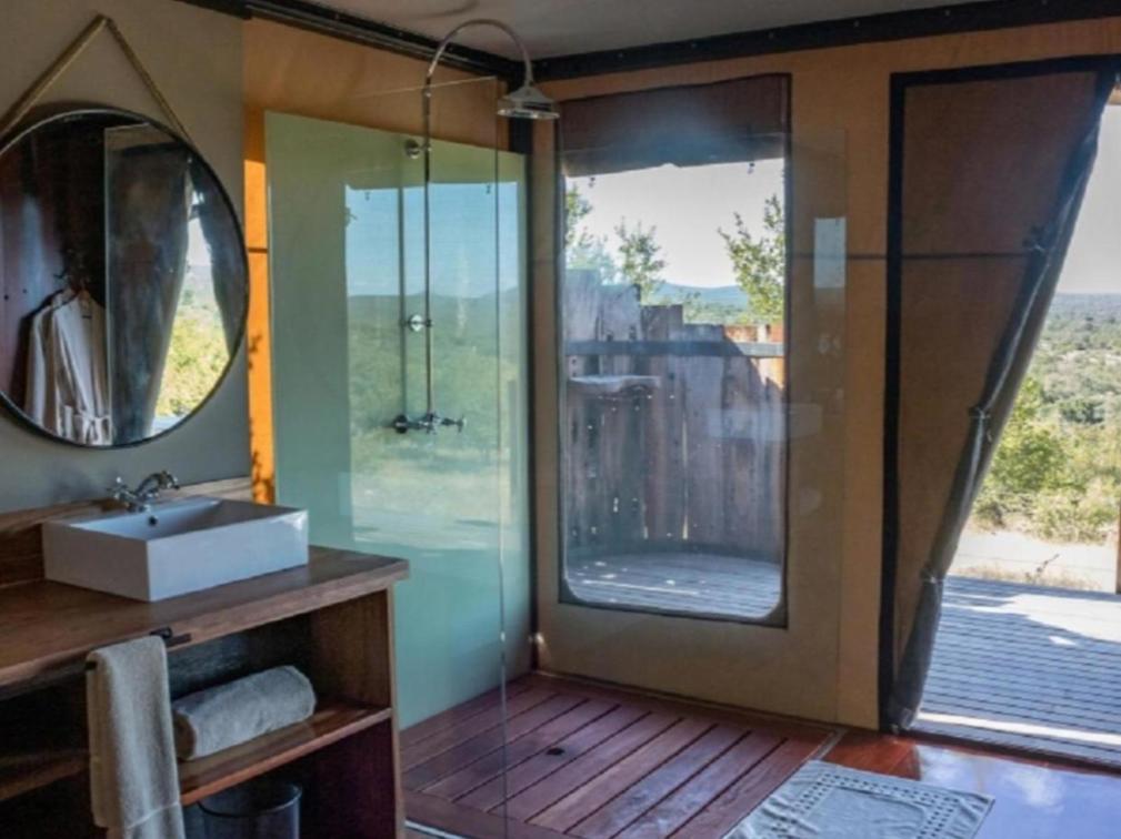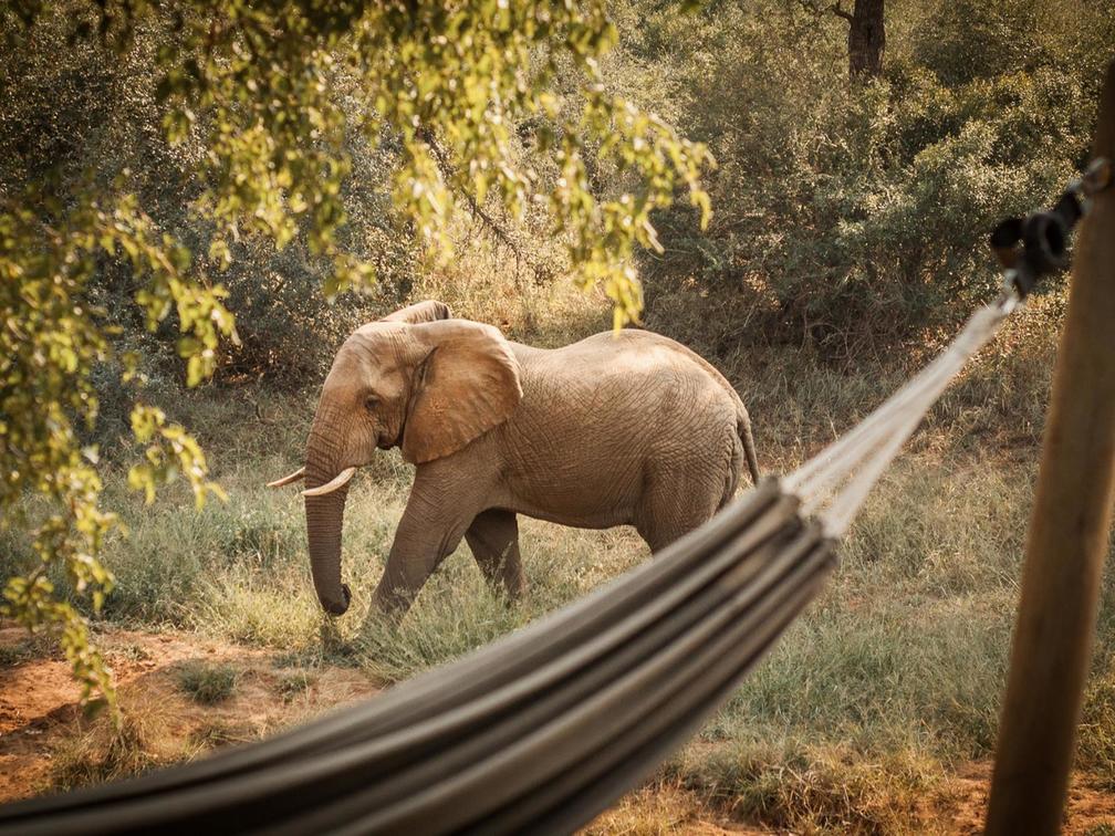 A spacious and luxurious tent set in the beautiful bush landscape. A light, airy and spacious unit with an expansive draped bed, indoor and outdoor showers, and a wooden deck with a hammock.