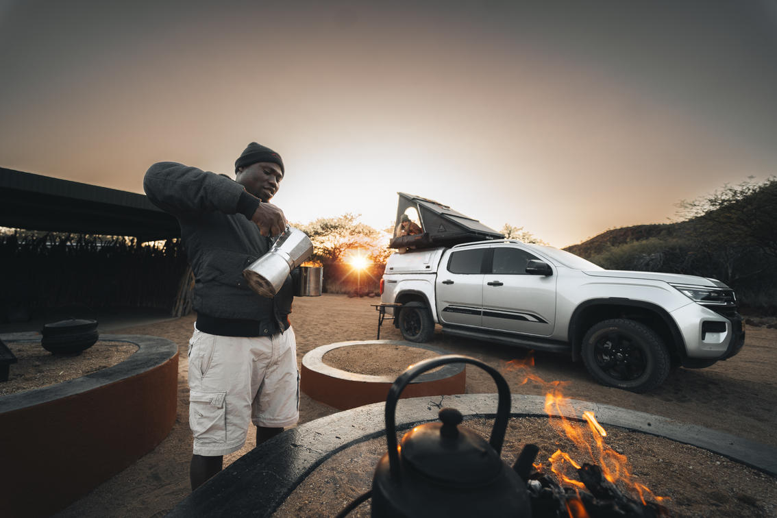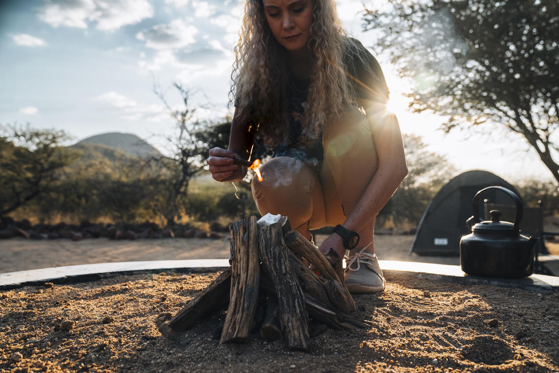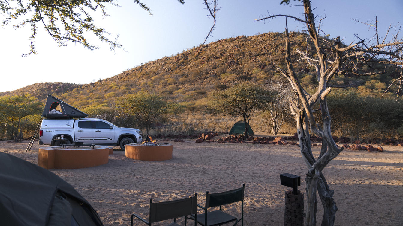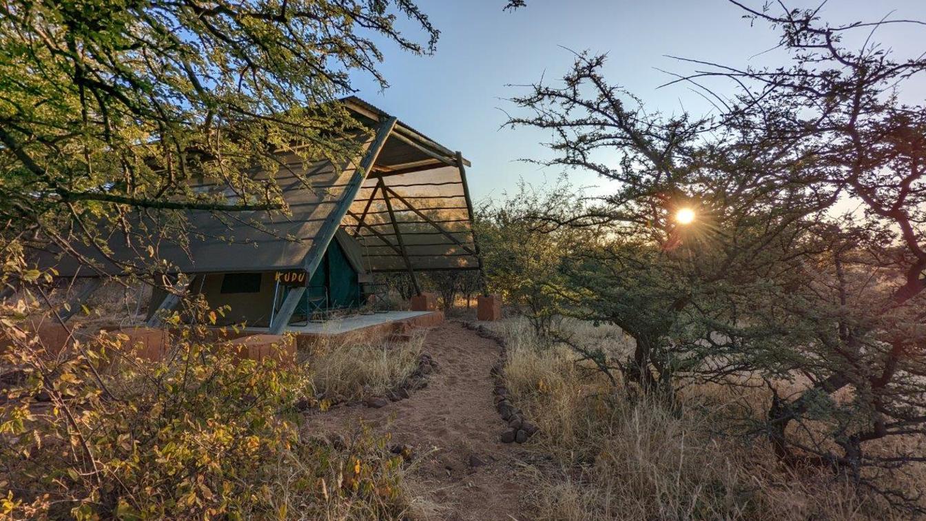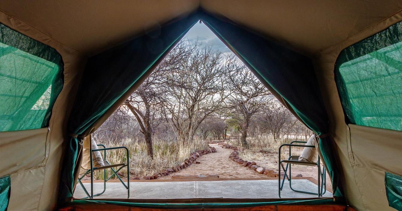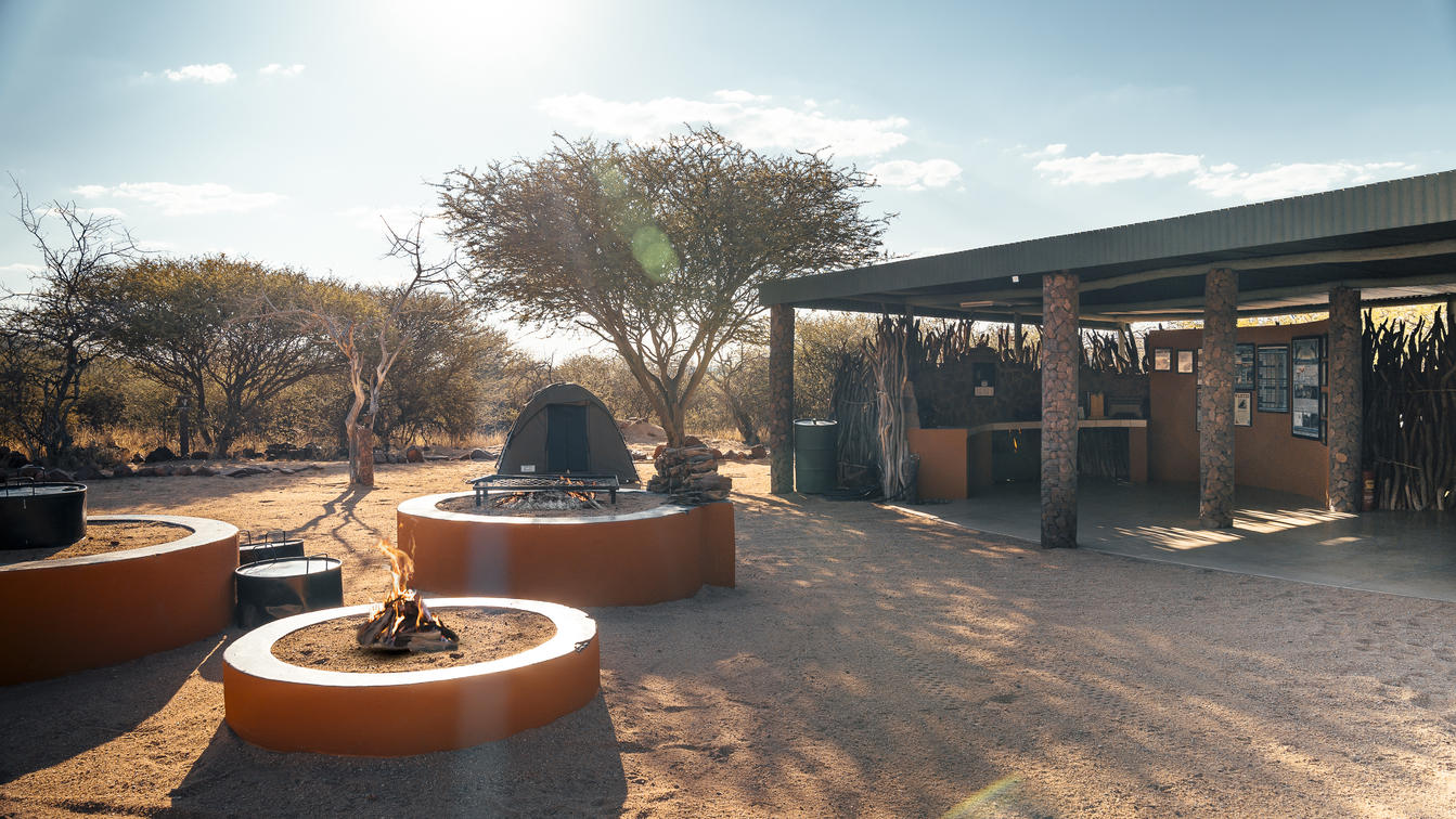Our tented campsite offers the following facilities: 10 rustic domed tents with 2x single beds each, private ablution, two undercover dining areas, a sundowner view point, private waterhole, fire wood, electricity plug points (220V - AC for charging & fridges) and braai area with a fixed