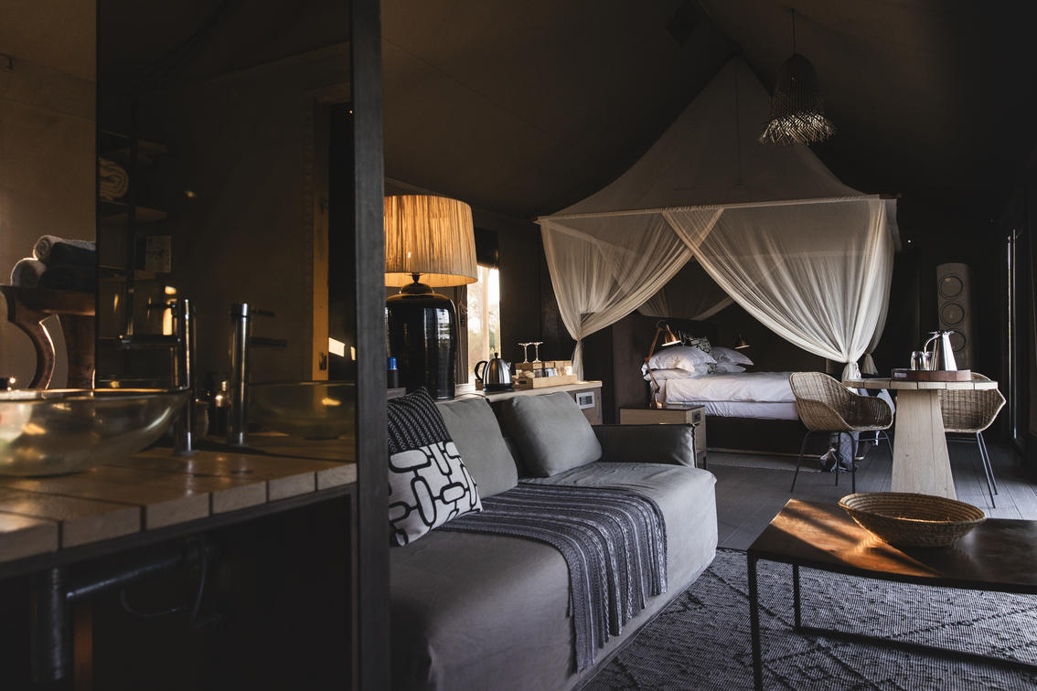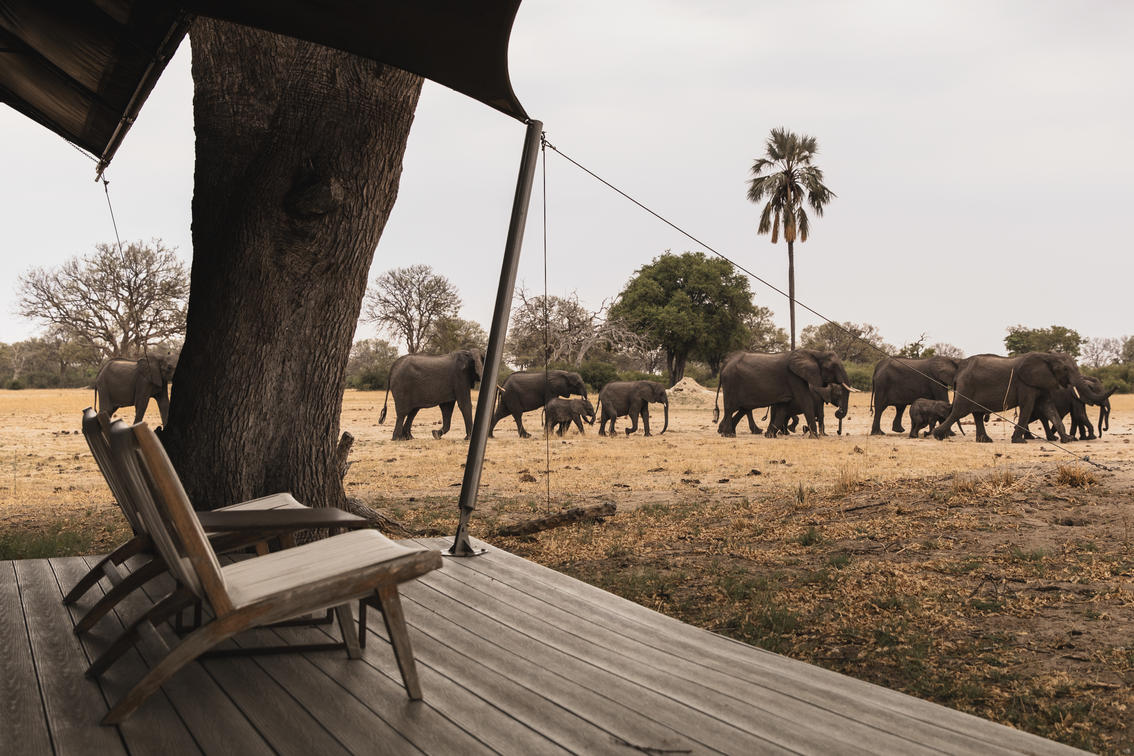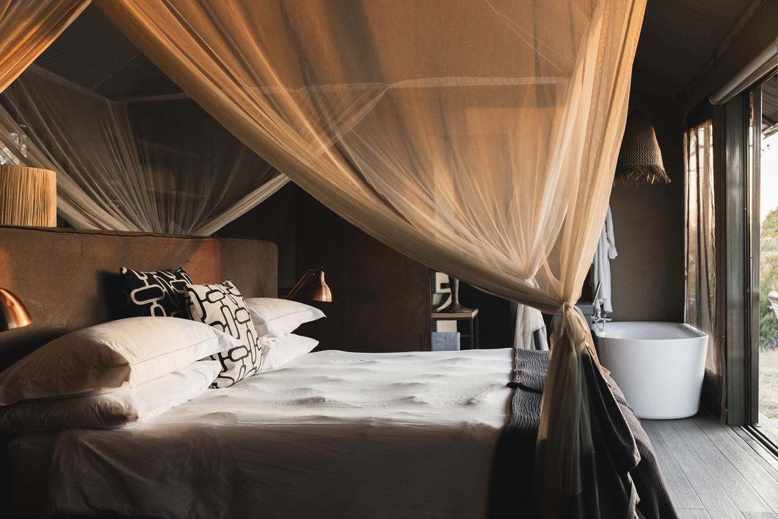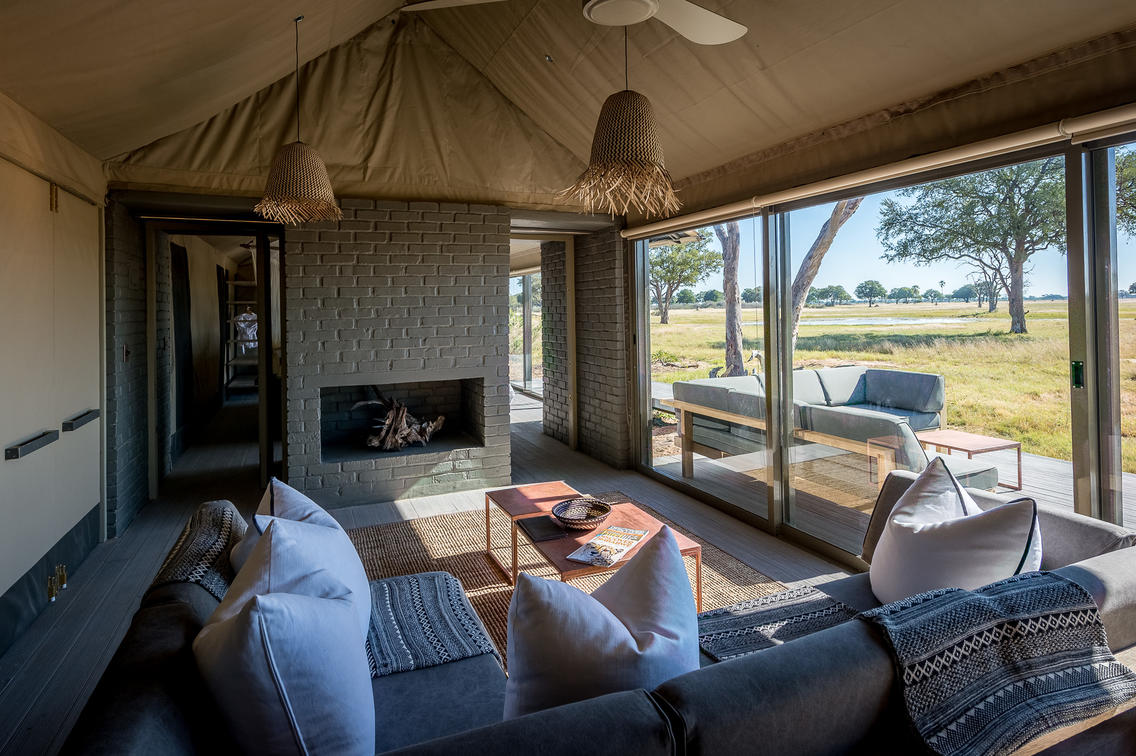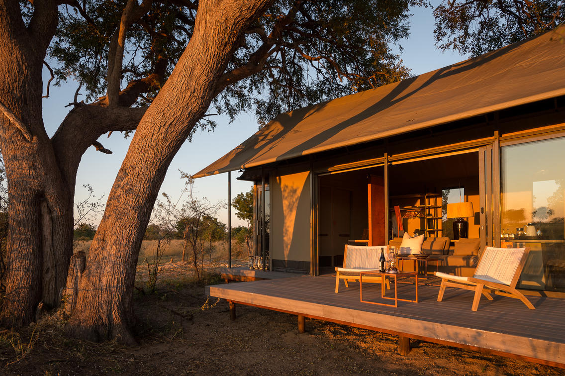 Wilderness Linkwasha's expansive canvas tented accommodations each look out onto the camp's waterhole, and beyond onto a vast plain. Elegant tents, featuring contemporary but timeless décor, nestle under leadwood trees, fronting a waterhole where the wildlife spectacle perpetually amazes and entertains.