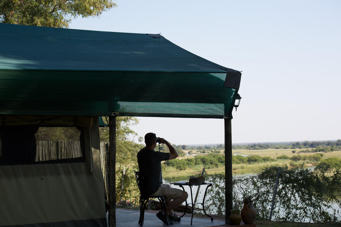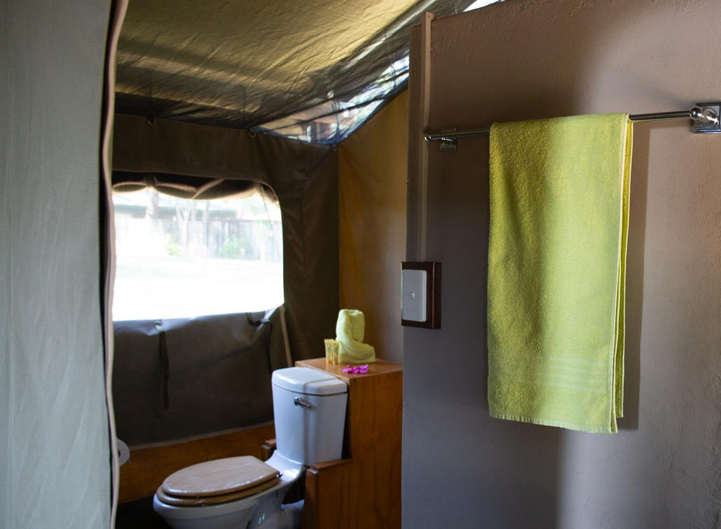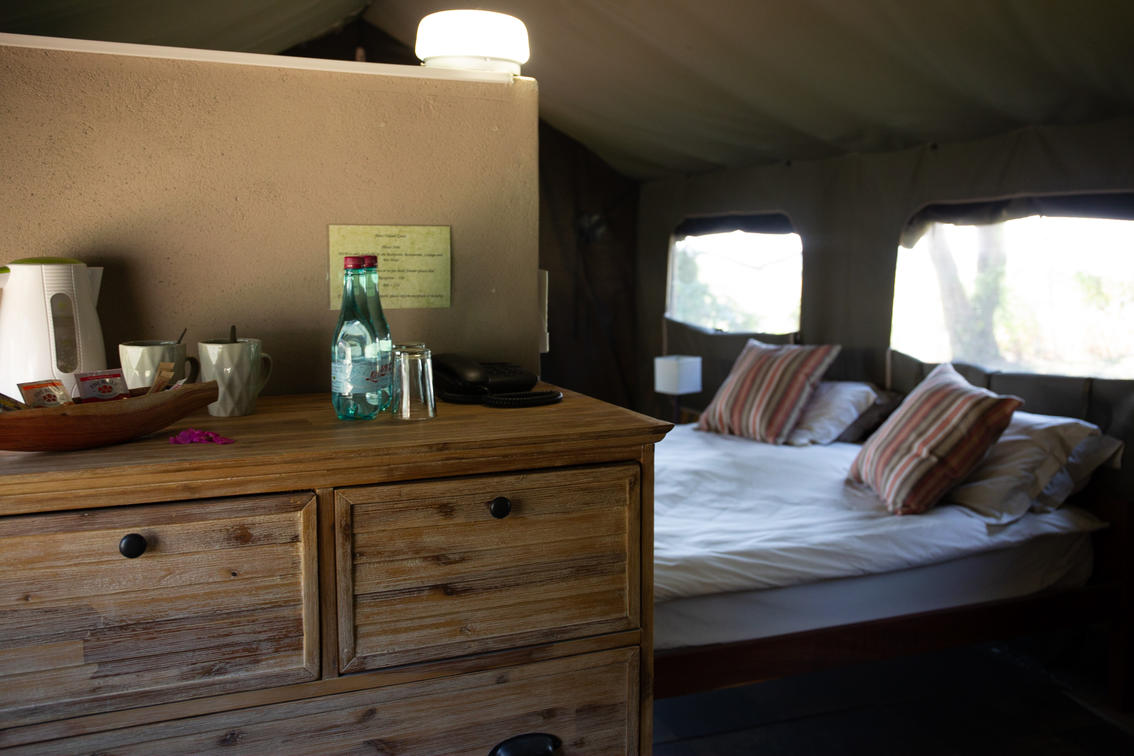 The bathroom is en `suite with a shower, washbasin, and flush toilet and are amenities included. A chest drawer with coffee, tea station, international power sockets. The patio in front of the tent has furniture where guests can sit and relax while they take in the view. Telephones in each room to reach reception for orders or assistance.