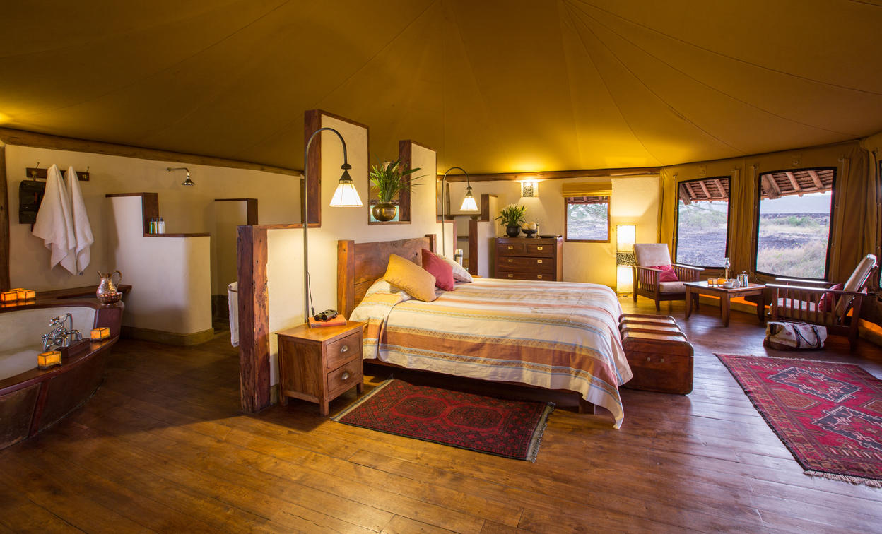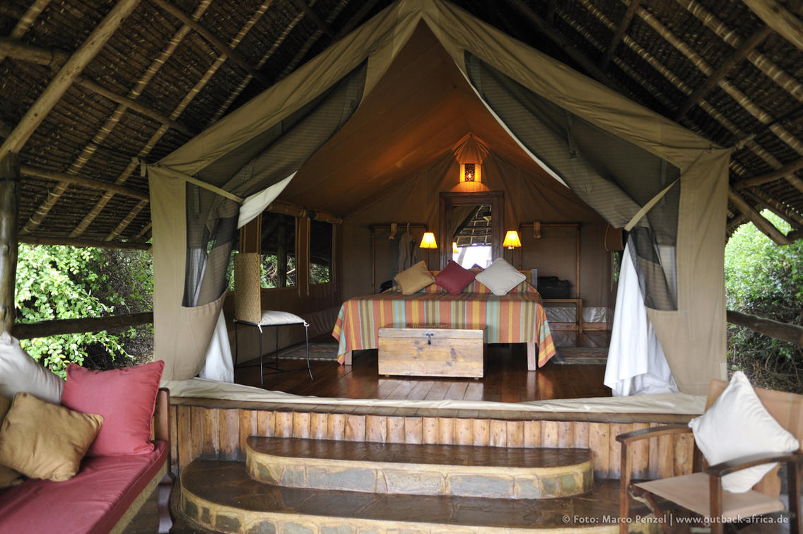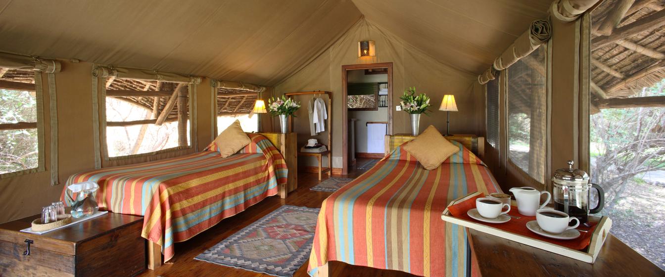 Each makuti-covered tent consists of a main bedroom with twin or double beds, en-suite bathroom and a spacious verandah. Let us know if you require twin beds or double bed.