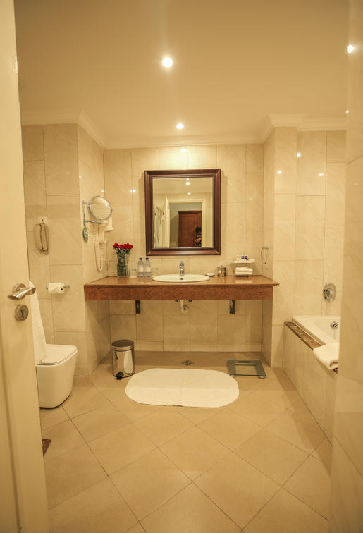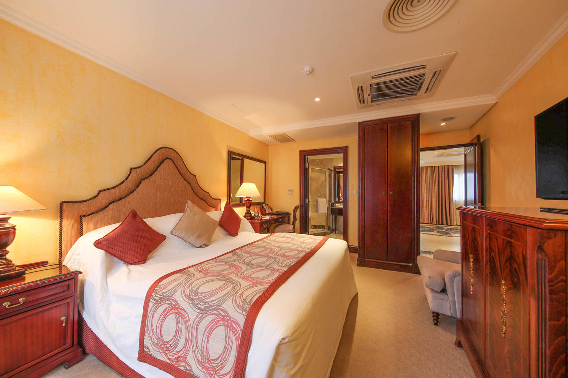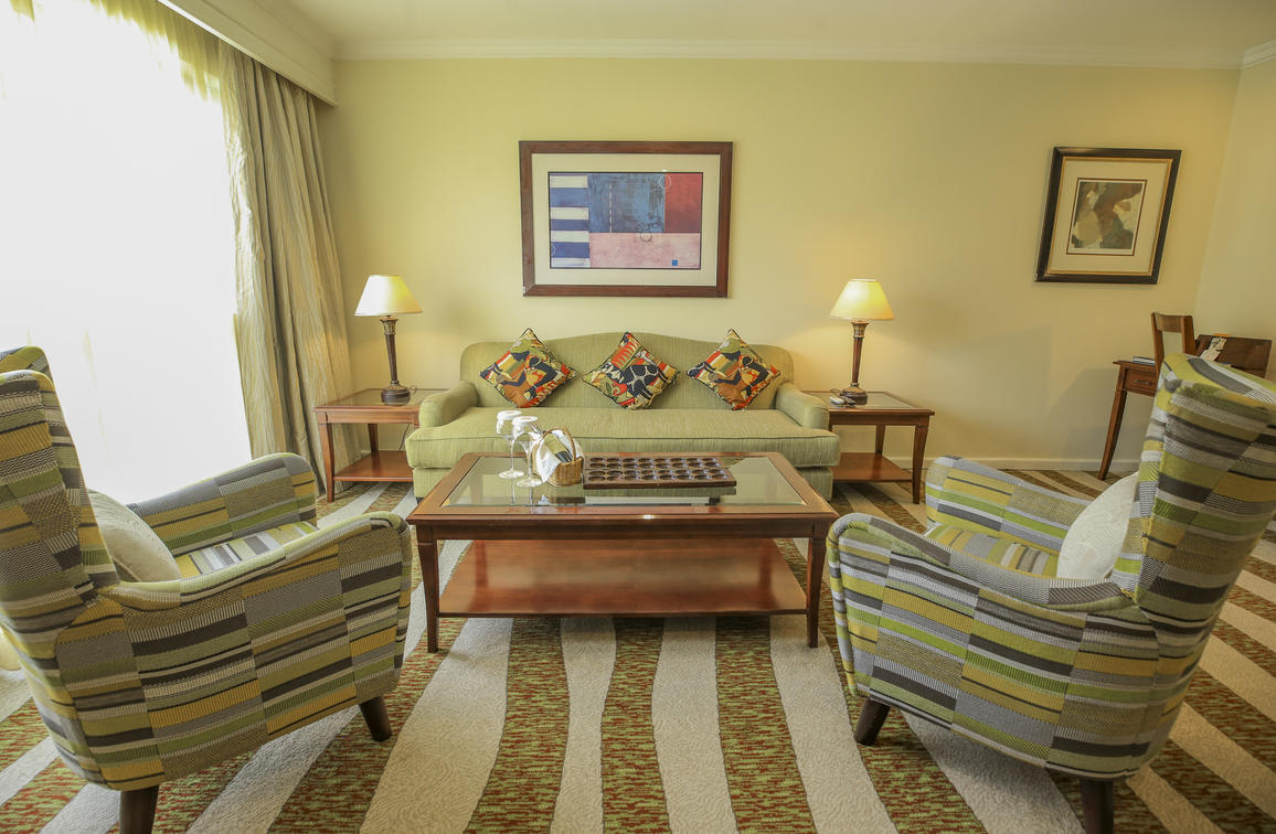 The resplendent Presidential Suite (300 sq m) offers a king-sized bed, luxury en suite bathroom (with Jacuzzi, tub and shower), two en suite guest rooms, private office, private conference room, private dining room (and galley kitchen), elegant sitting room, reception area and private vestibule entrance.The suite is one of the finest examples of luxury accommodation in Kigali and throughout Rwanda.