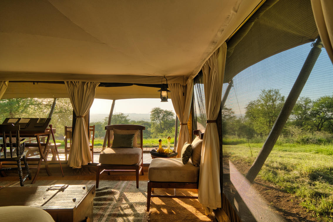 An incredibly spacious family tent comprises of a double ensuite tented room and twin ensuite tented room adjoined by a sitting room area.