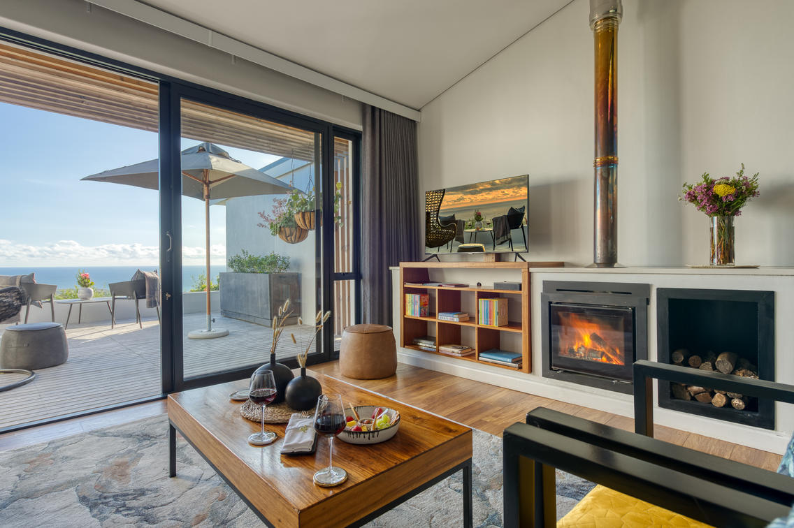Suite features a spacious bedroom with en-suite bathroom, separate lounge with tea & coffee making facilities, minibar, cosy fireplace, DVD player for in-room entertainment. The spacious suites open out onto a private outside deck overlooking the Walker Bay. As with all One-Bedroom Luxury Suites at Garden Lodge, facilities such as a separate bath, shower and toilet, satellite TV and secure room safes are standard.