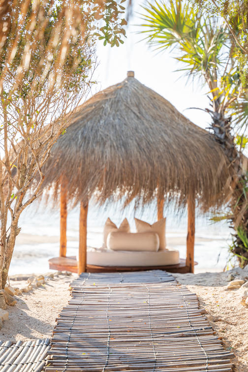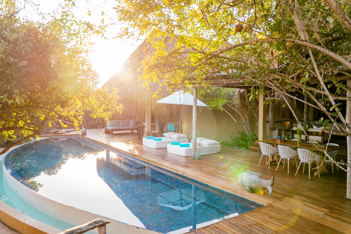 Outdoor areas are astounding, offering a 10m rim flow pool with a Jacuzzi on the one end, and a poolside sitting pavilion on the other, from which guests have access straight into the pool. The villa also has a double daybed under latte roof, as well as a single daybed on the deck, dining area, and beachside sala, all of which are perfect for relaxing and enjoying your own private space.