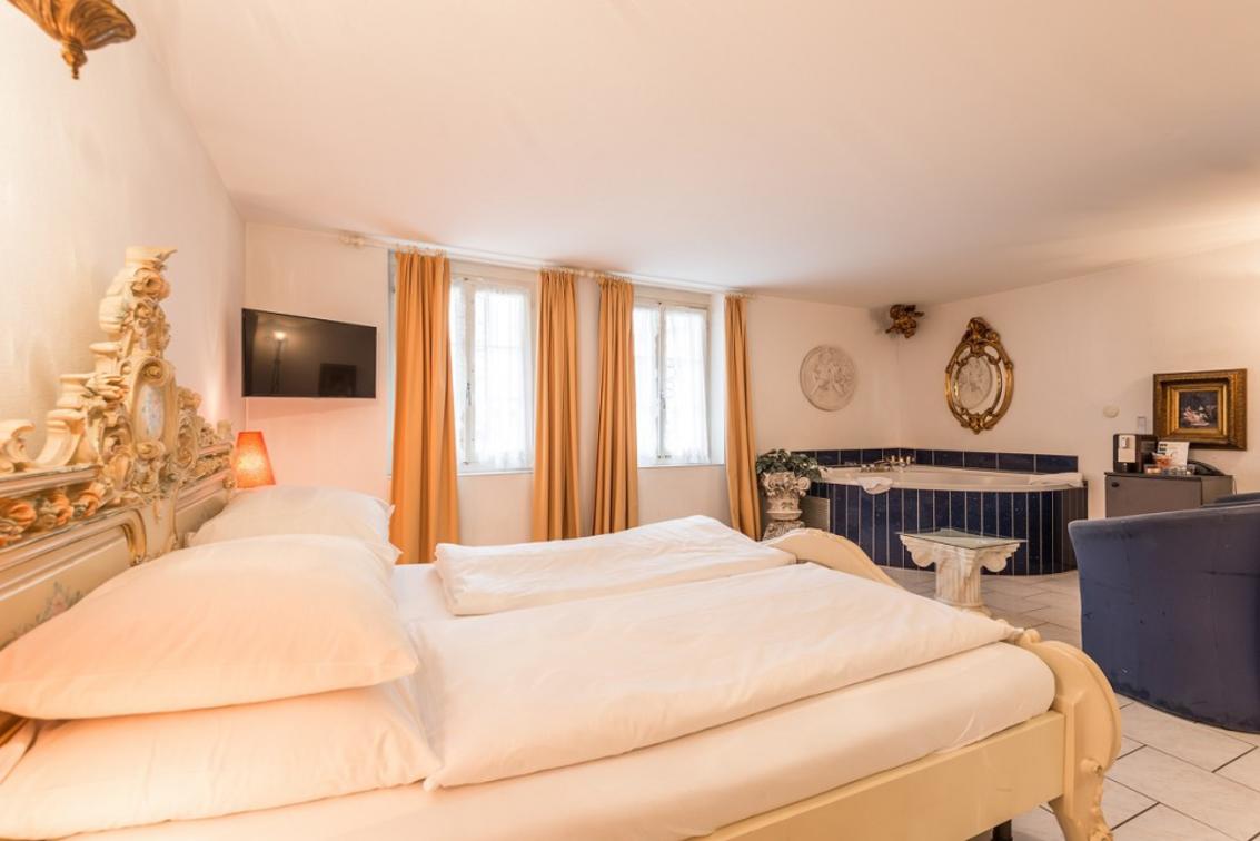 Klassisch und schick! Der Whirlpool lädt zum Baden ein. Vornehm geniessen Sie alle Vorzüge, die dieses Zimmer zu bieten hat. Die pompösen goldenen Spiegel laden zu Träumereien in barocken Gewändern ein, so dass Sie sich auf einem königlichen Ball wiederfinden…