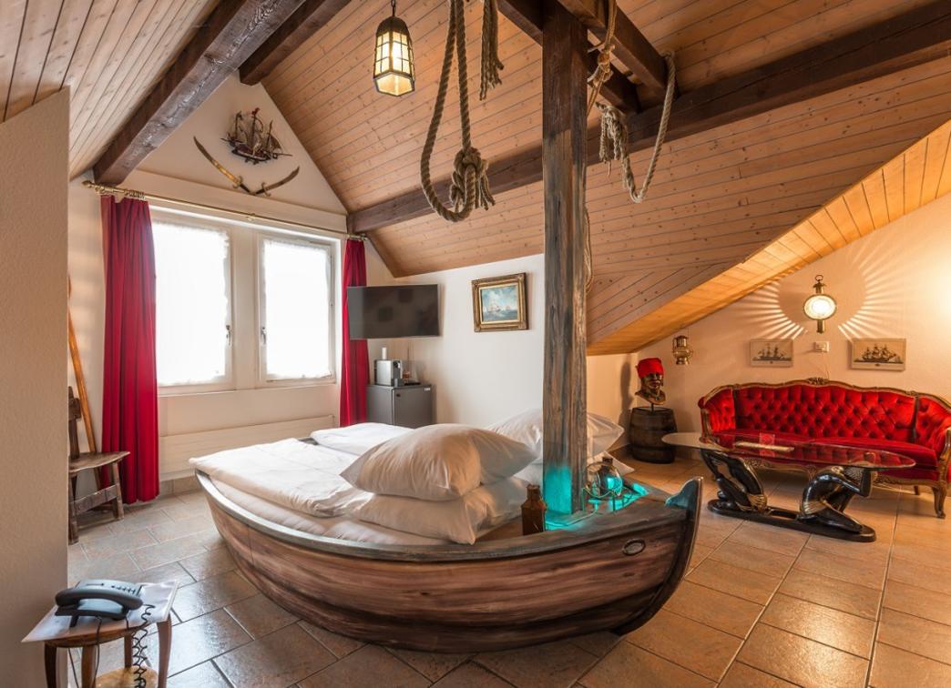 Hatten Sie schon einmal die Gelegenheit in einem Piratenschiff zu schlafen? Nein? Dann wird es höchste Zeit. Lassen Sie sich dieses Abenteuer nicht entgehen. Über Ihnen befindet sich ein Mast mit all seinen Tauen und Stricken, unter Ihnen finden Sie die Planken des Bootsrumpfes. Wenn Sie genau hinhören, vernehmen Sie das Rauschen des Meeres. Dann kann es losgehen, mit der Suche nach dem verlorenen Schatz… Seefahrerromantik pur!