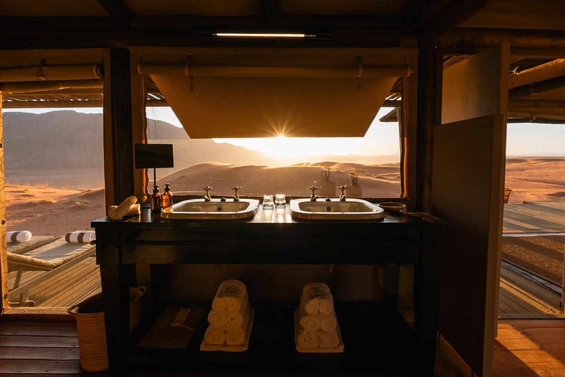 All tented rooms are open to the beautiful desert vistas and have been built to maximise the views from all corners of the room. Each has a private verandah, connecting you to the swathes of untouched sand beyond. In fact, we highly recommend sleeping with your canvas blinds open to feel the soft evening breeze and marvel at the vast star-studded sky.