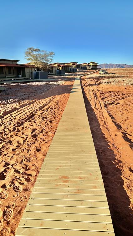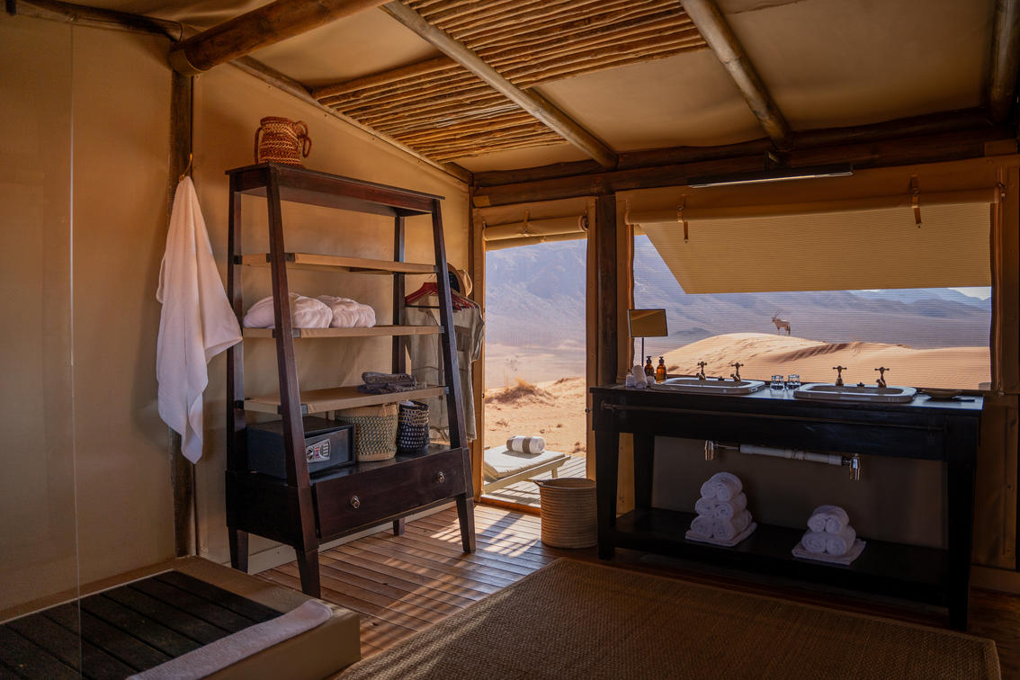 There are 7 Tented chalets, linked by a walkway and set atop a dune plateau, featuring elevated decks and sleeping two adults in a king-size bed. Each en-suite bathroom includes a double vanity, shower, and toilet.