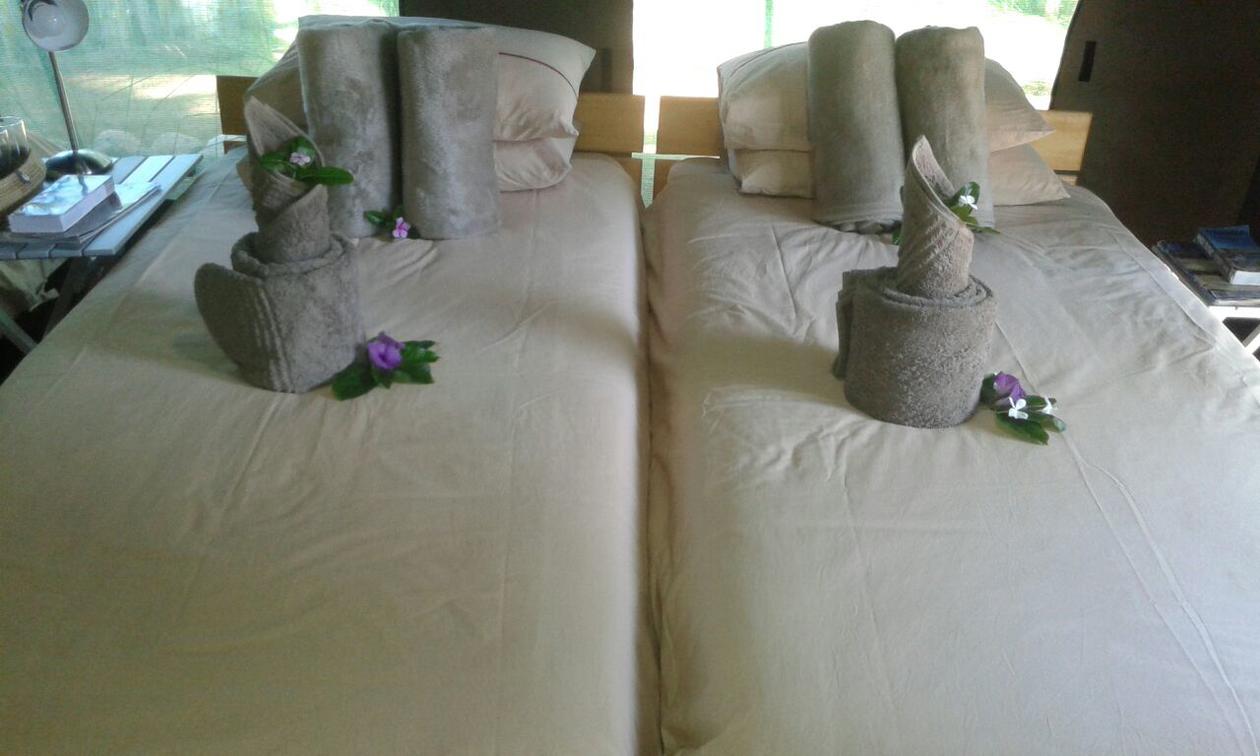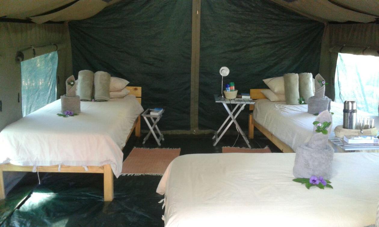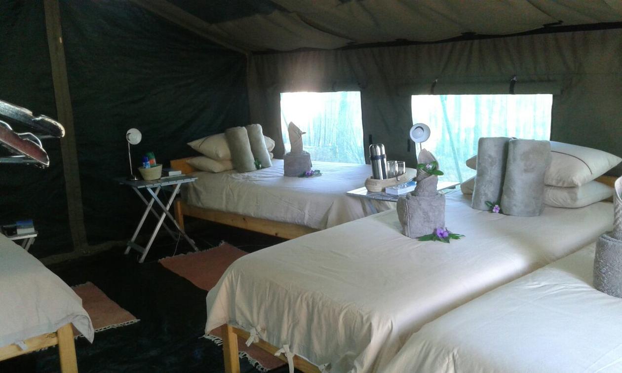 The tented family room has four beds, electrical lighting and mosquito netting at the windows and doors and an en suite bathroom with double basins.