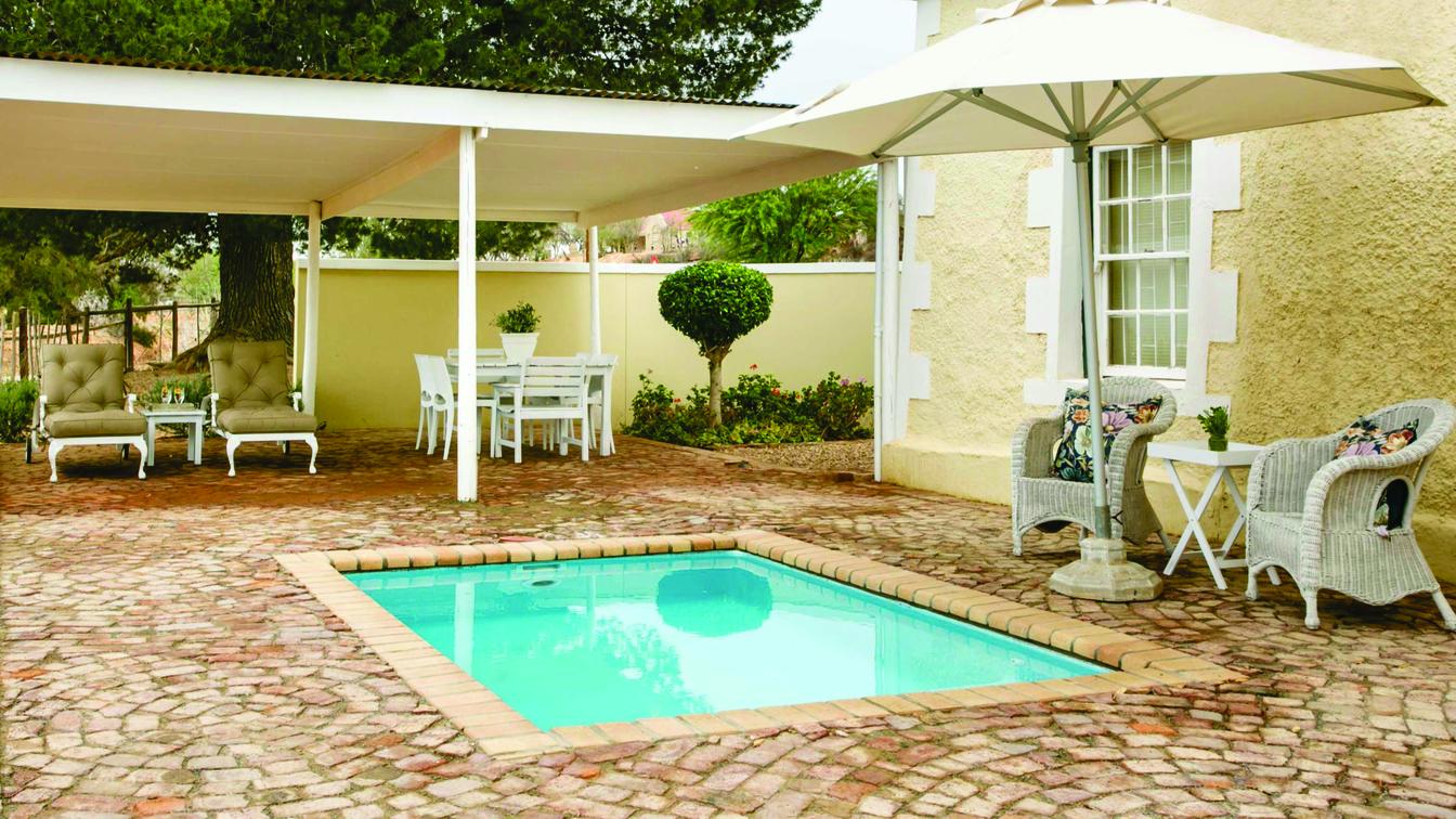 Located on the farm, just opposite the Spa and securely set behind private gated access, La Ferme Villa offers the ultimate in seclusion, space, and understated luxury. At its heart lies a spacious open-plan living, dining, and fully equipped kitchen area—thoughtfully designed for relaxed gatherings and effortless entertaining. The villa features two elegantly appointed bedrooms, each with its own en-suite bathroom complete with a bath and rain shower. Outdoors, guests can enjoy a private pool and a pergola-covered lounging area—ideal for soaking up the serene Karoo atmosphere or unwinding in the shade. A third, compact bedroom fitted with stacked twin-over-twin beds allows the villa to comfortably accommodate a fifth and sixth guest, making it a flexible option for families or small groups. Surrounded by tranquil gardens, La Ferme Villa is a peaceful, self-contained retreat in the heart of the Klein Karoo. For a truly effortless experience, guests may also arrange for a private chef to prepare meals in the comfort of the villa.