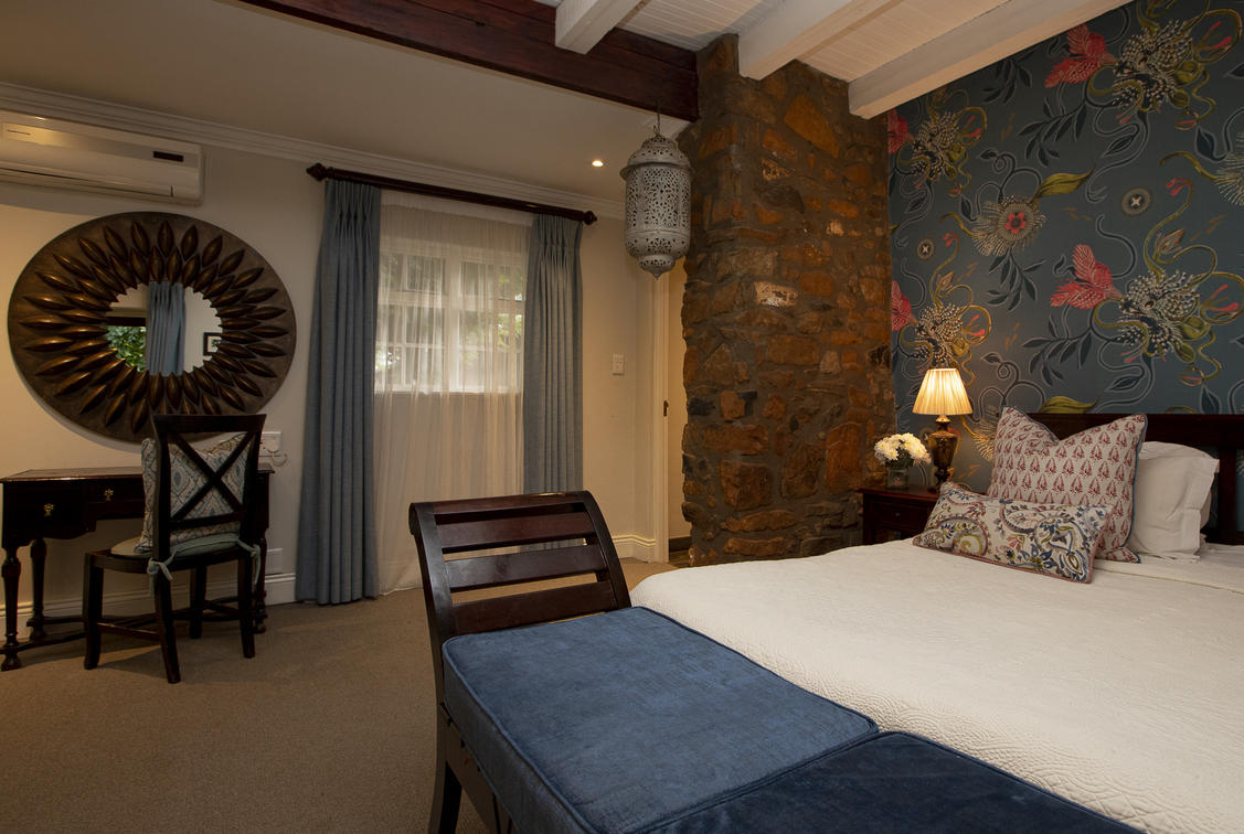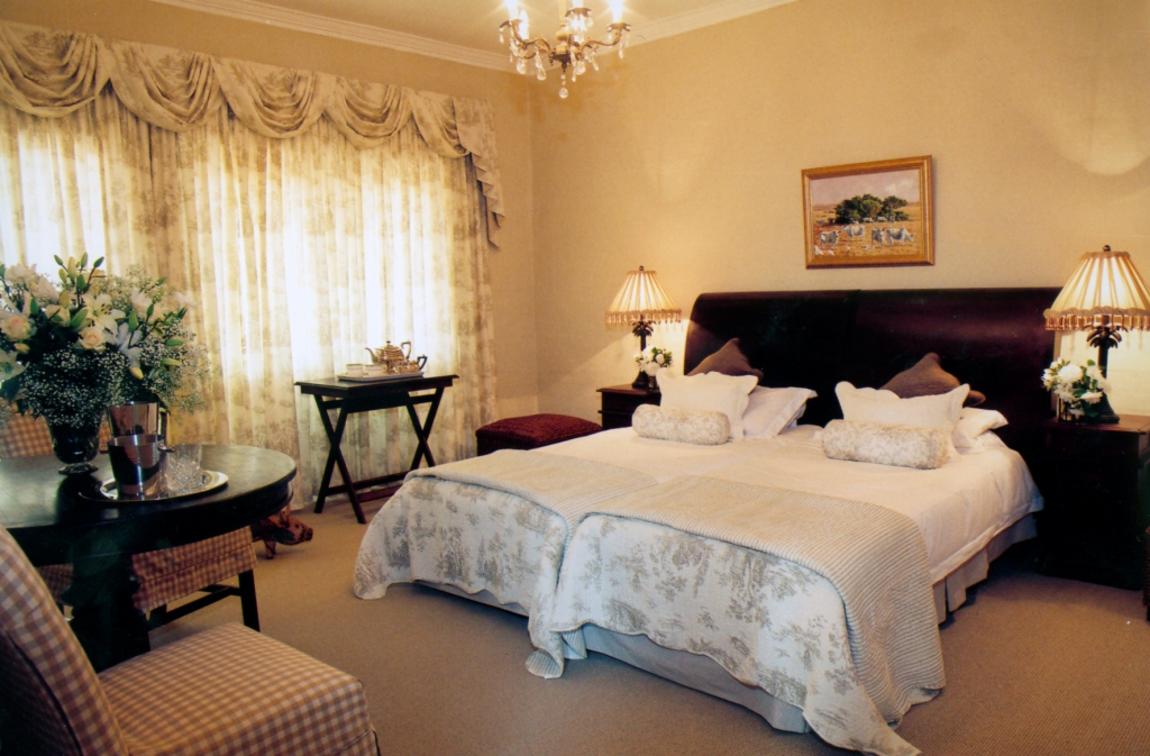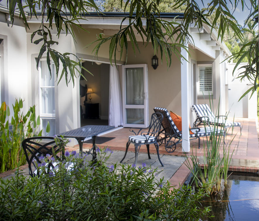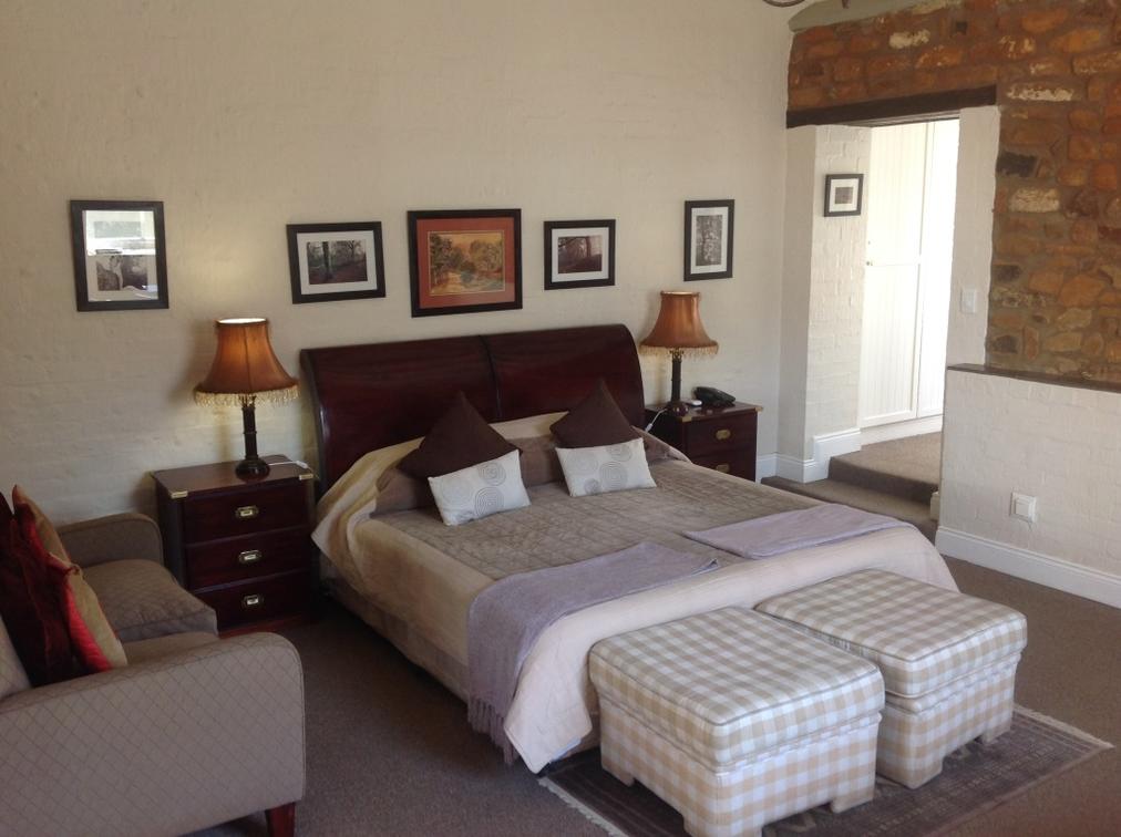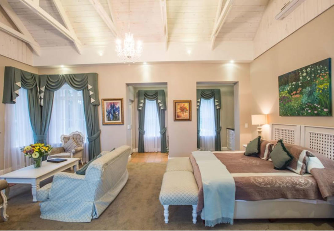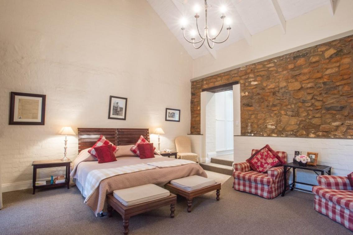 Our Deluxe suites have a view of our rolling lawns and trout dam. Each room has a king-size bed, dressing-room area, bathroom with bath and shower, under floor heating in both bathroom and bedroom, air-conditioning, private balconies, TV and Netflix.