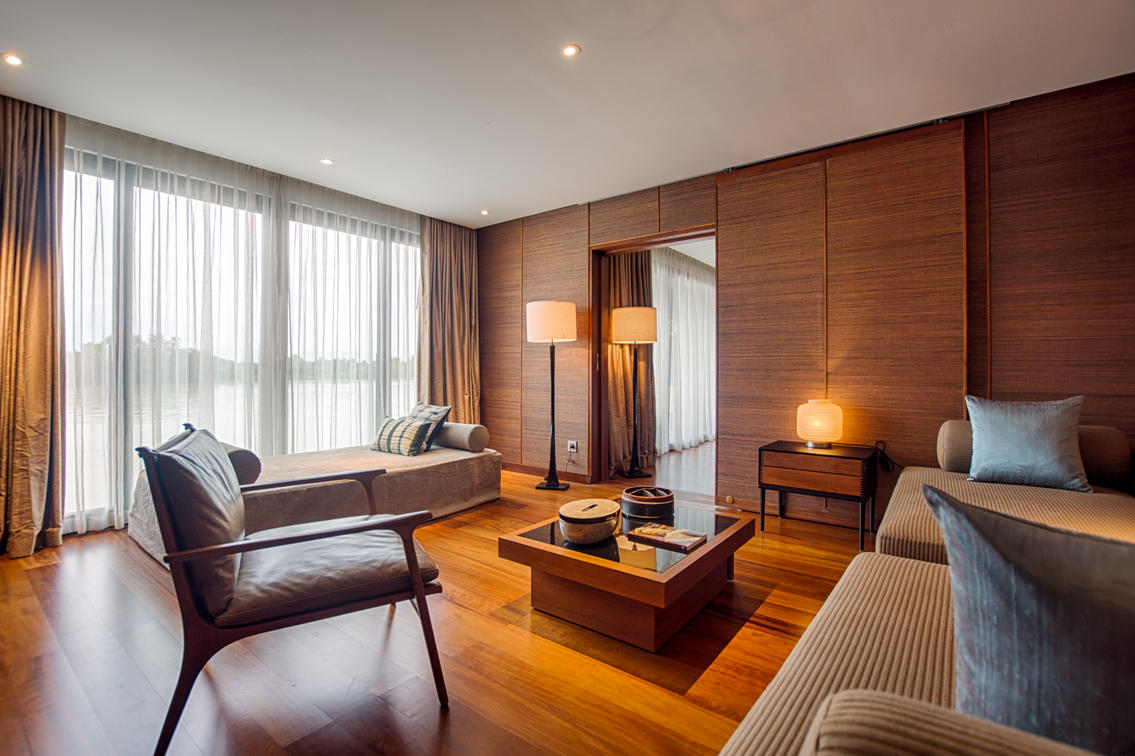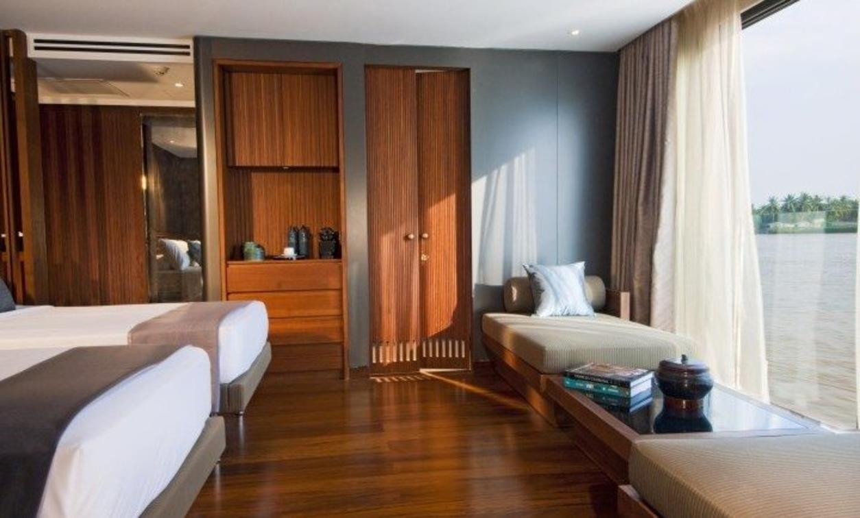 For the ultimate romantic cruise, interconnecting suites offer the luxury of having one suite configured as a living room, while the other as the master bedroom with a sumptuous California King bed. Enjoy his-and-hers baths and the magnificent grandeur of a 644 square foot (60 sq m) residence on the Mekong.