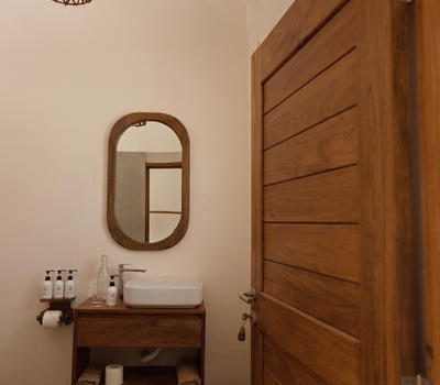 The double room has a En-suite bathroom with flush toilet and hot showers. 24-hr electricity is provided by a Solar and inverter system and all rooms enjoy charging facilities in the room. Complimentary wifi is on offer throughout the villas. The Bathroom has full guest amenities, a room safe, a desk to work from for those that need and complimentary water. Rooms are made up as doubles or twins with an additional bed in some rooms possible. Laundry is available at a cost but for those booking all inclusive the service is free. The rooms are serviced both in the morning and in the evening for turn down.