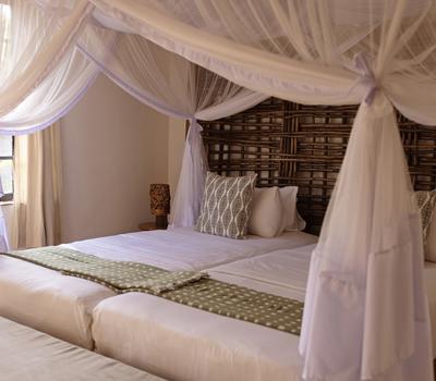 The family room consists off a masterbedroom and a triple room with interconnecting door. En-suite bathrooms with flush toilet and hot showers. 24-hr electricity is provided by a Solar and inverter system and all rooms enjoy charging facilities in the room. Complimentary wifi is on offer throughout the villas. Bathrooms have full guest amenities, a room safe, a desk to work from for those that need and complimentary water. Rooms are made up as doubles or twins with an additional bed in some rooms possible. Laundry is available at a cost but for those booking all inclusive the service is free. The rooms are serviced both in the morning and in the evening for turn down.